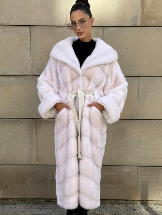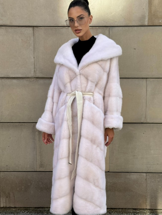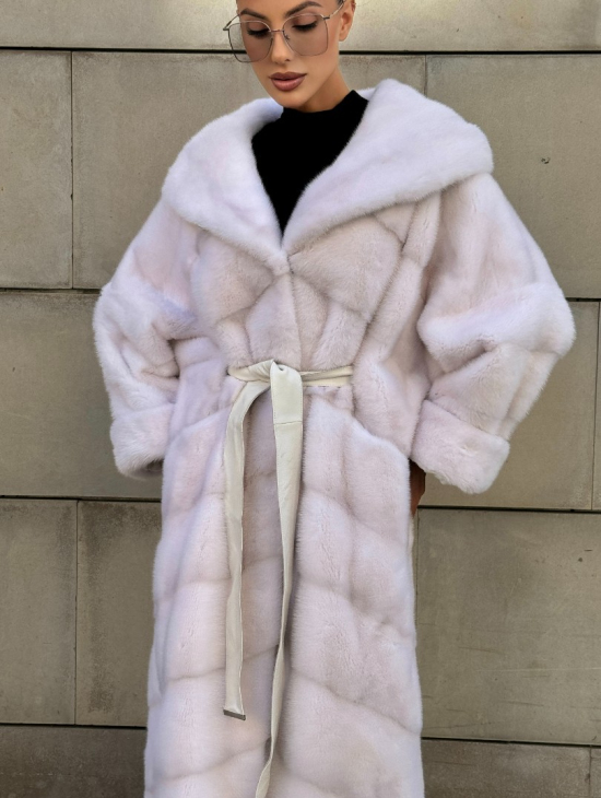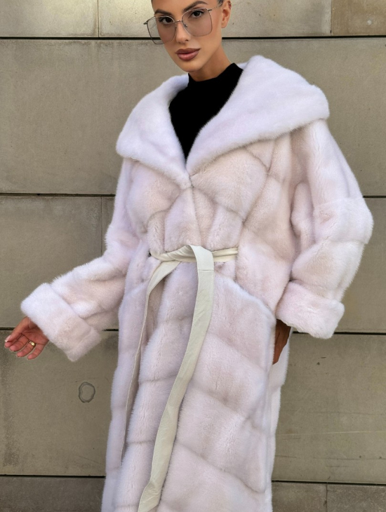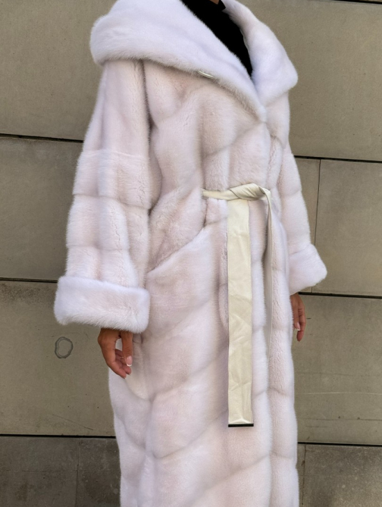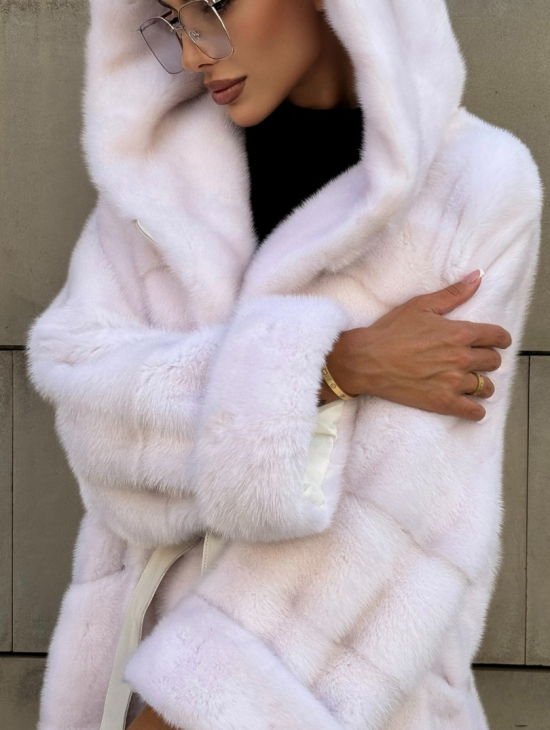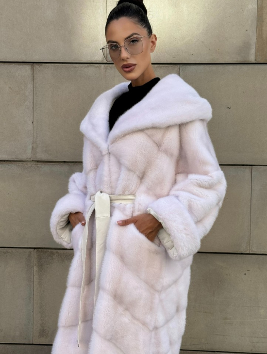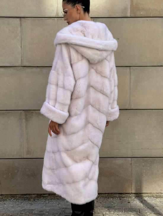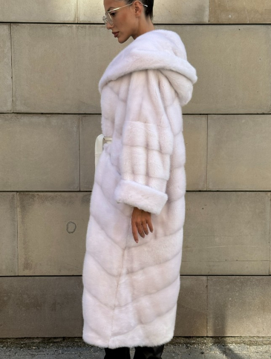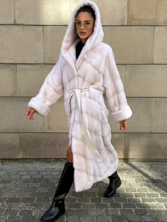 Шуба в диагональной выкладке меха норки White ice с капюшоном