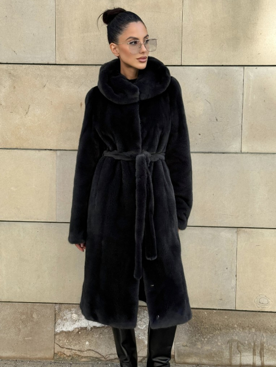 Шуба из меха импортной норки NAFA с капюшоном, цвет темный графит
