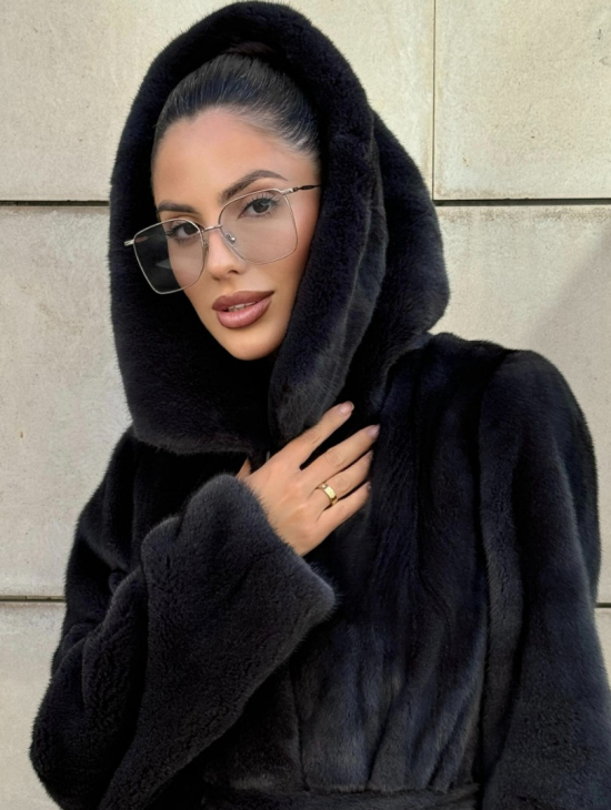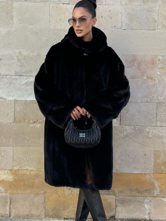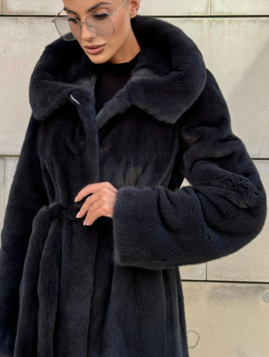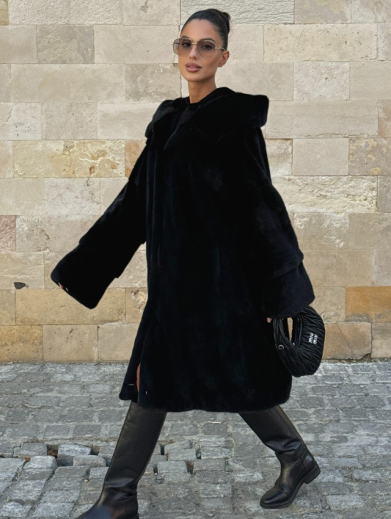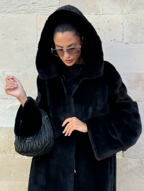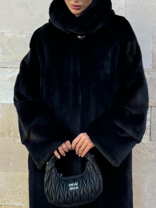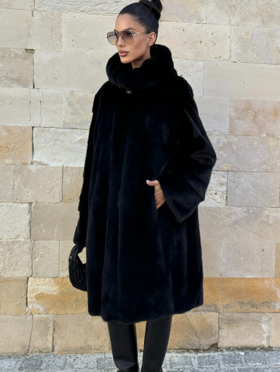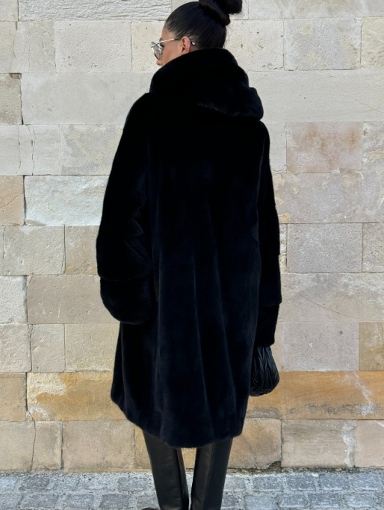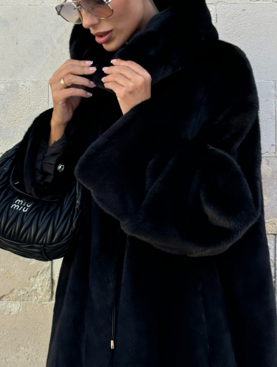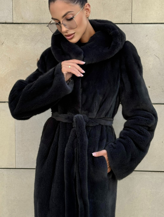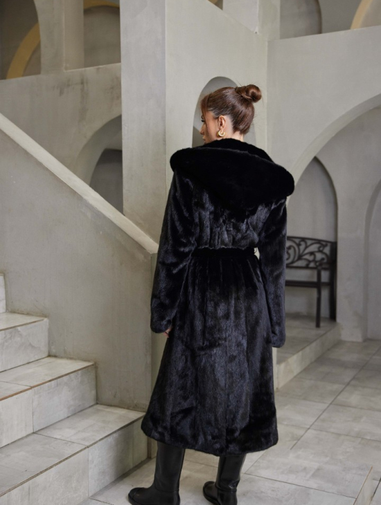Классическая норковая шуба с капюшоном кобра черного цвета