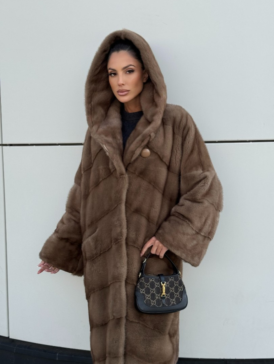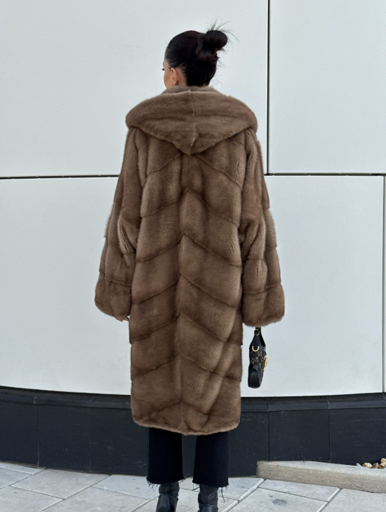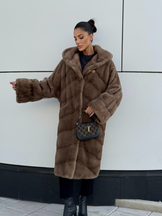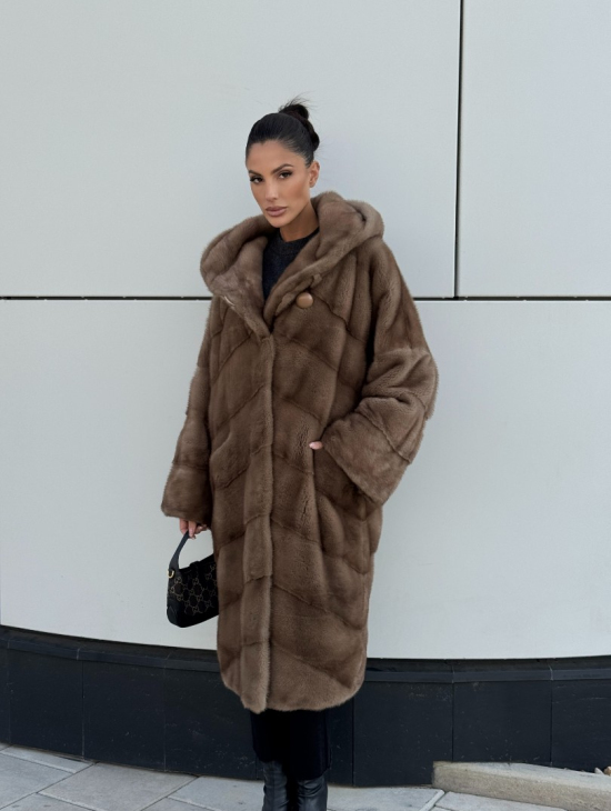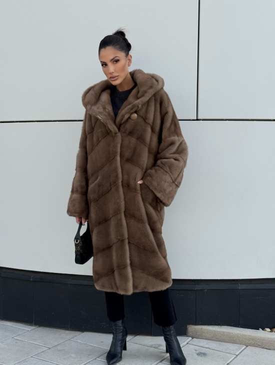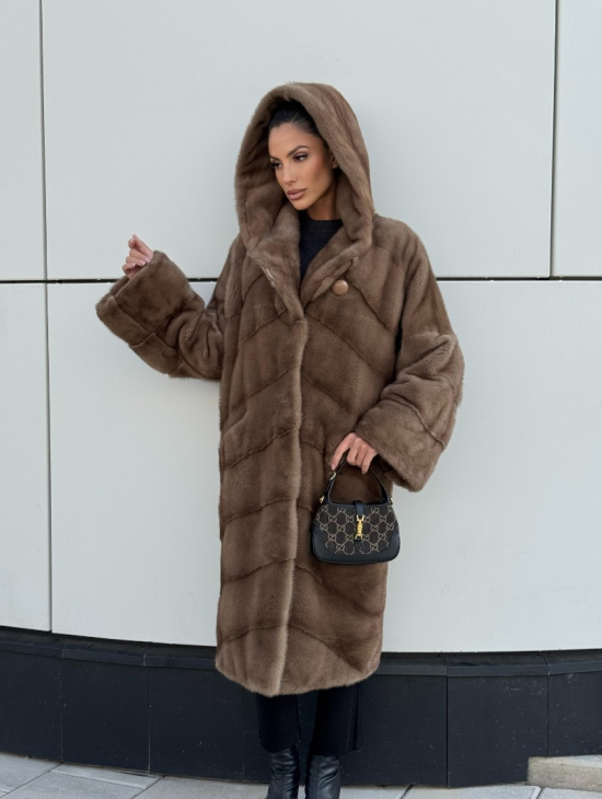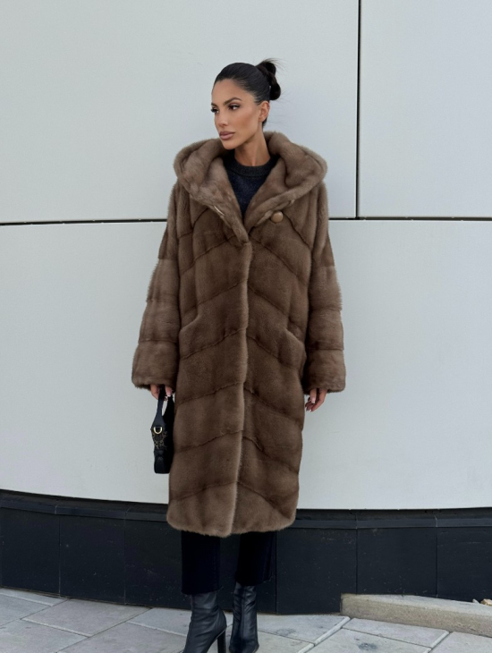 Шуба из аукционной норки с капюшоном роспуск - цвет инжир