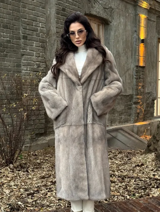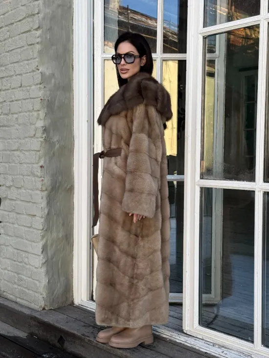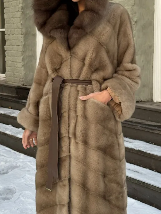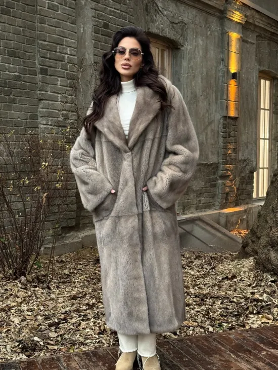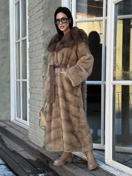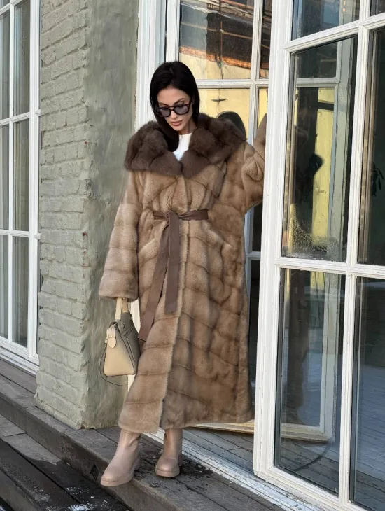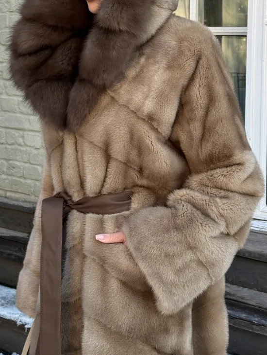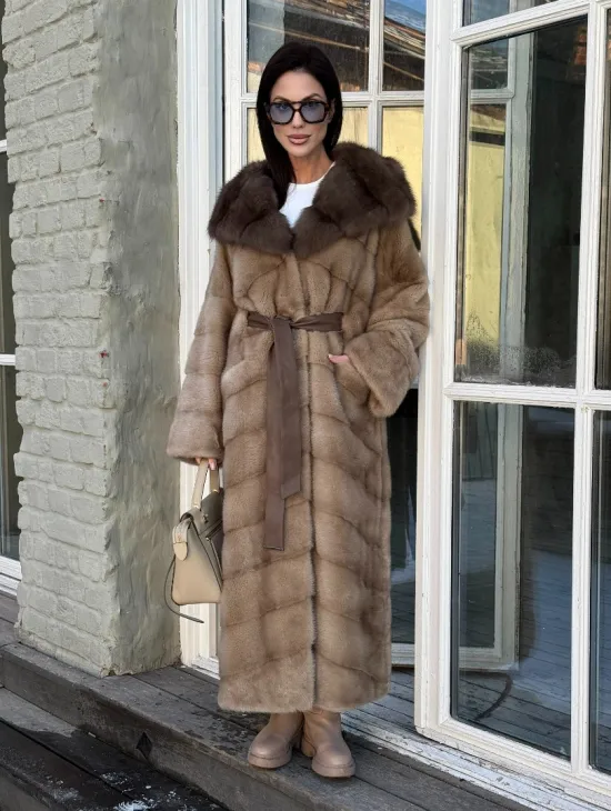 Длинная норковая шуба в цвете пастель с капюшоном из натуральной куницы