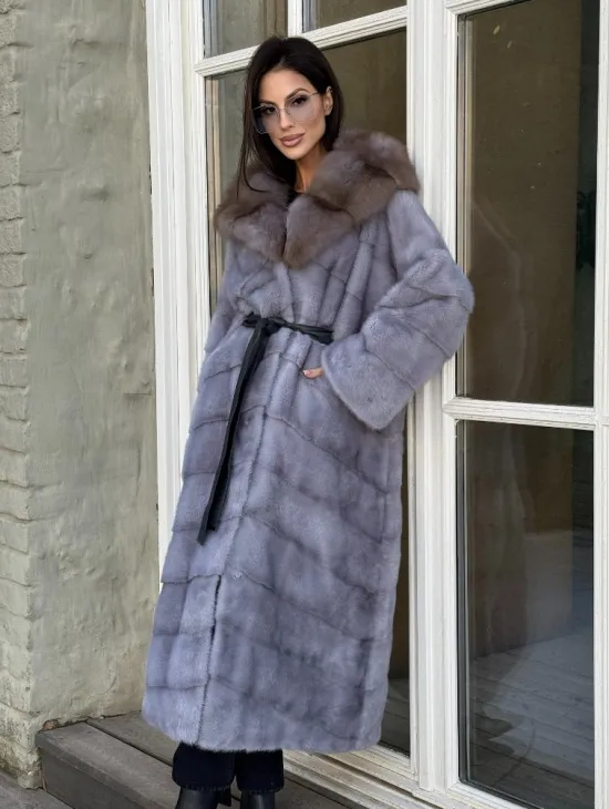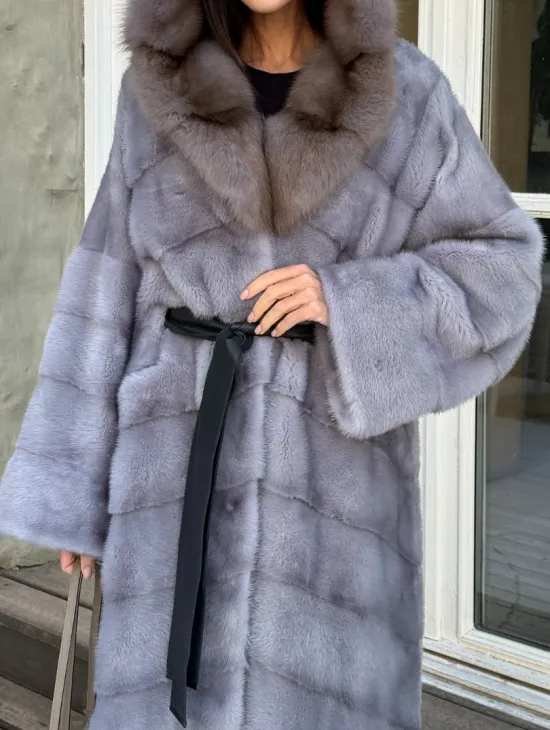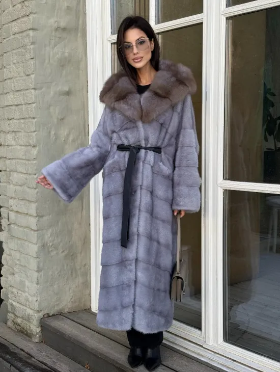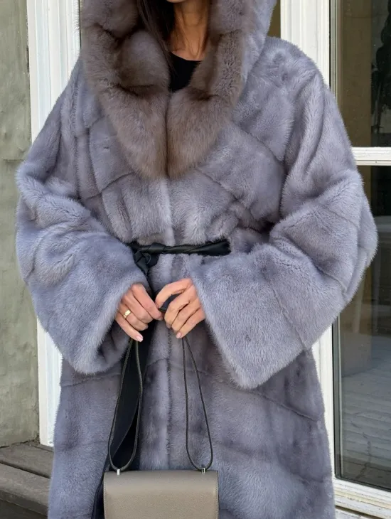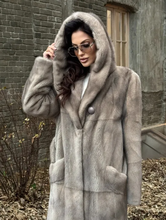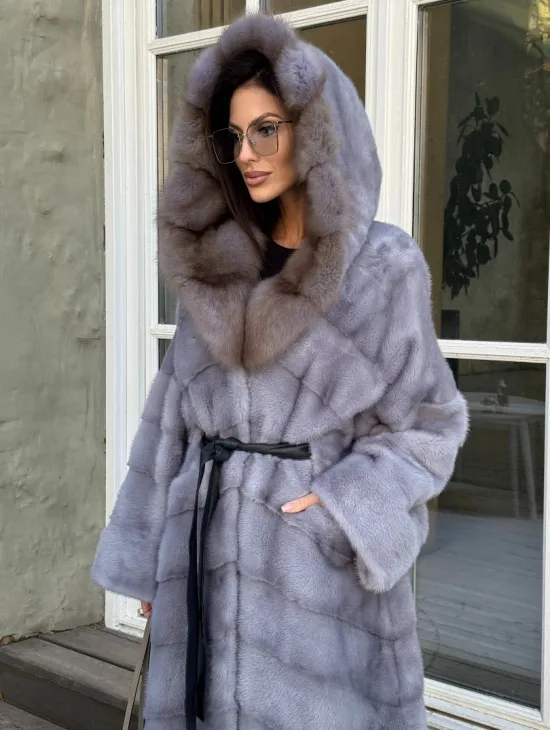 Норковая шуба голубого цвета с капюшоном из натурального меха куницы