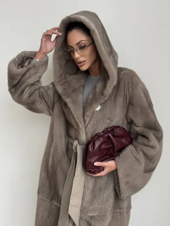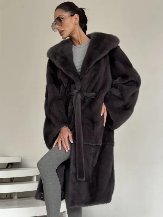 Норковая шуба кимоно с капюшоном кобра в натуральном сером цвете