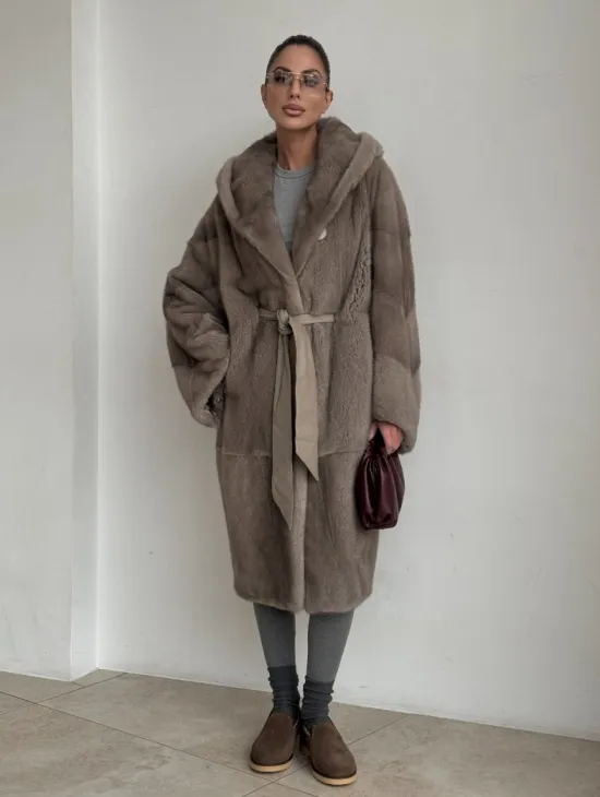 Шуба прямого кроя с капюшоном и меховым поясом в сером цвете