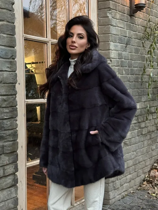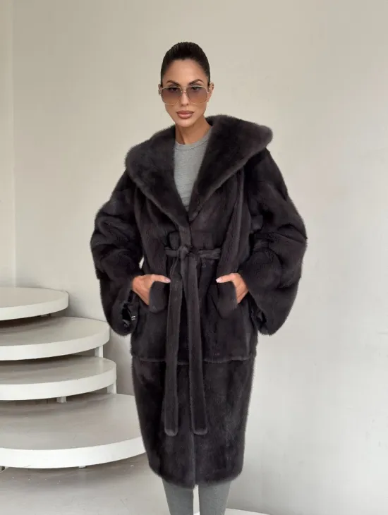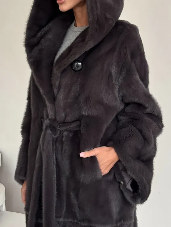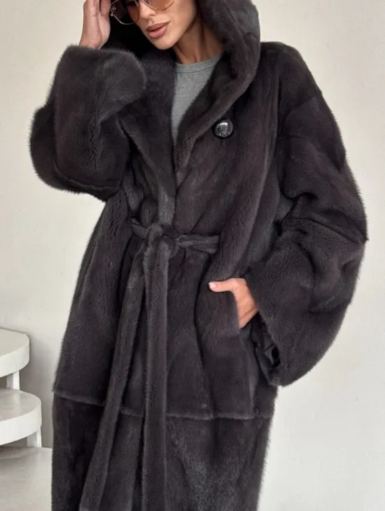 Зимняя норковая шуба с капюшоном - цвет графит