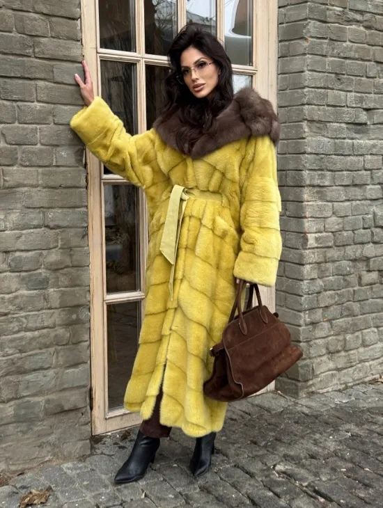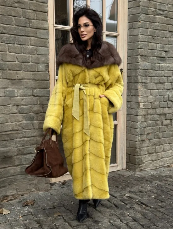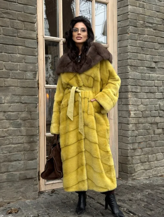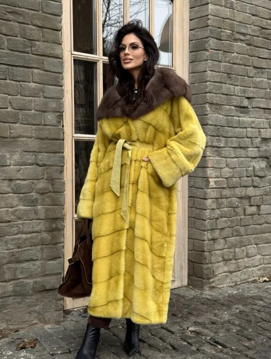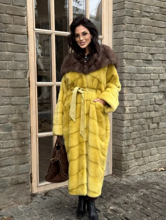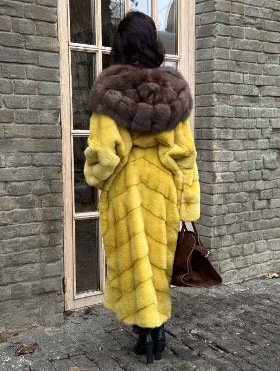 Женская длинная шуба из норки желтого цвета с капюшоном из меха куницы