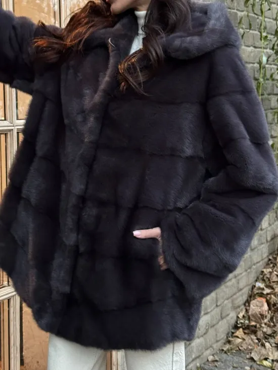 Меховое пончо из скандинавской норки с капюшоном - черный изумруд