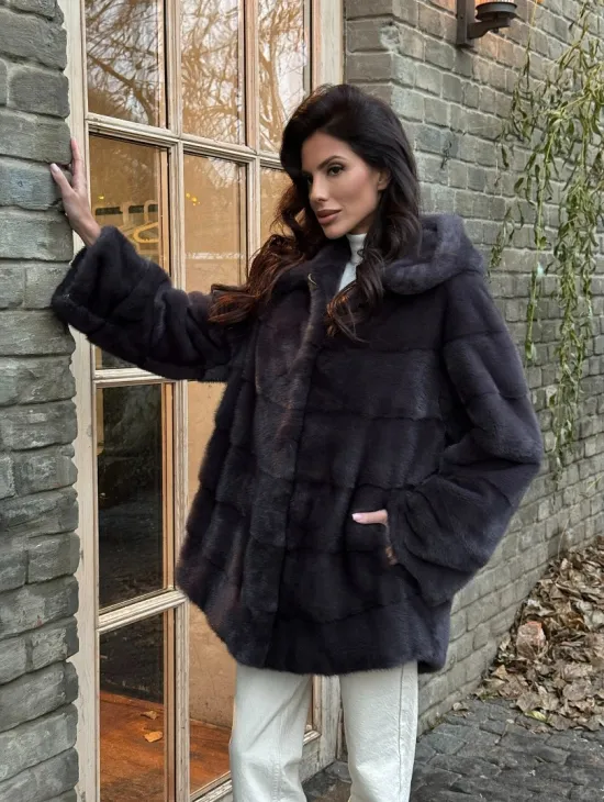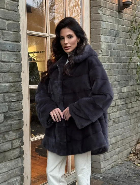 Норковый женский полушубок с капюшоном в графитом цвете