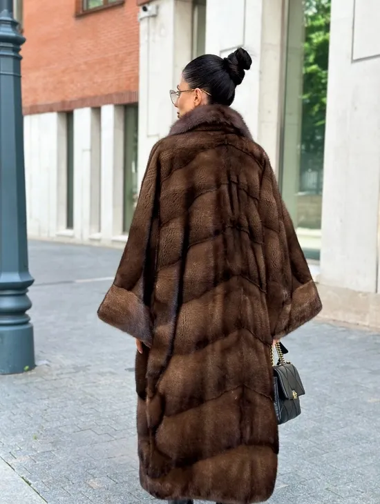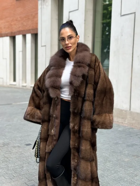 Шуба из меха норки с воротником из куницы - цвет соболь