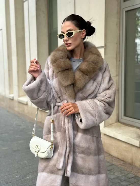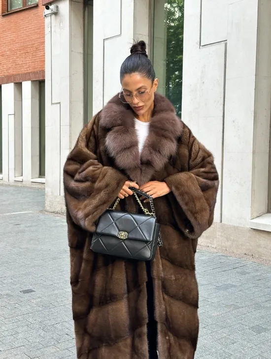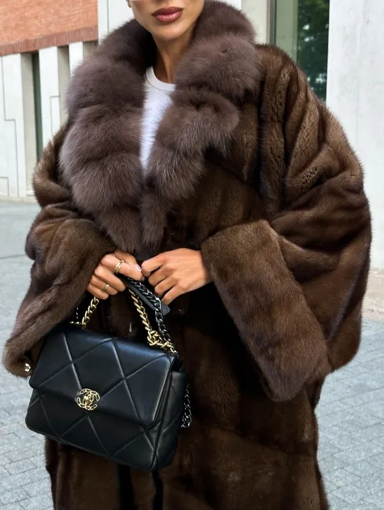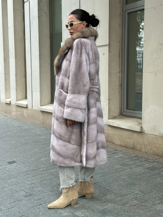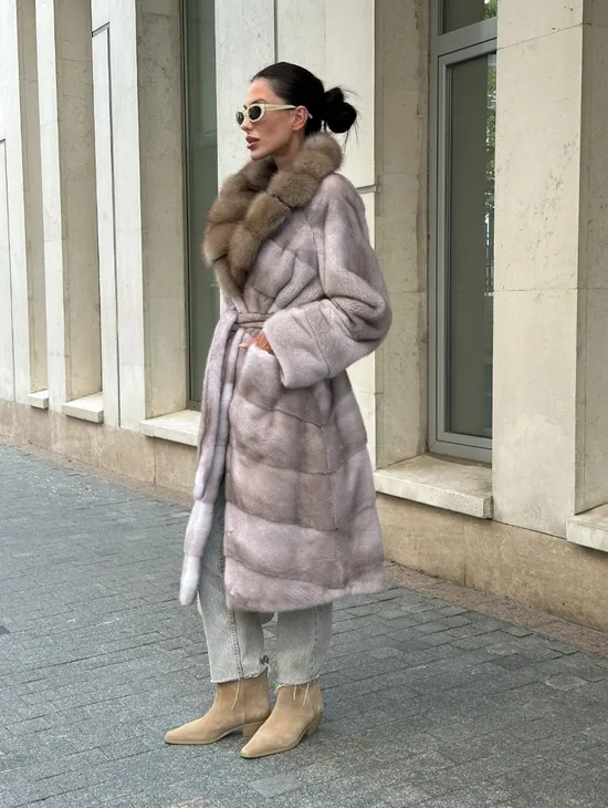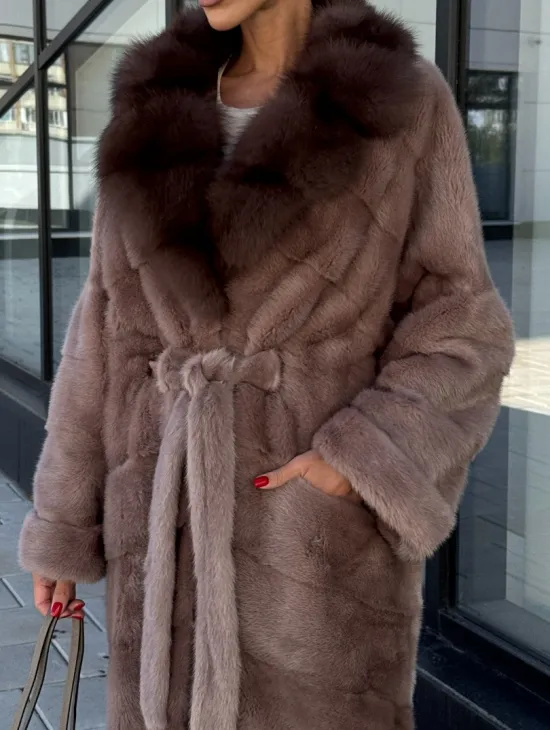 Шуба Oversize из норки с потайным поясом и английским воротником из меха куницы