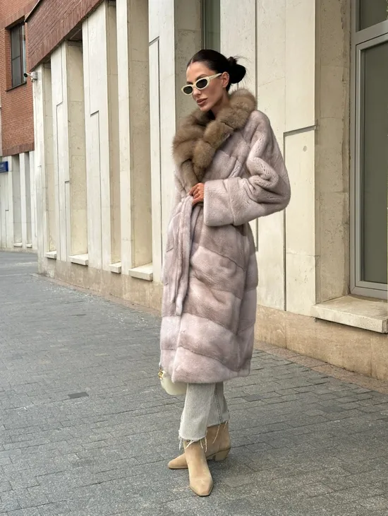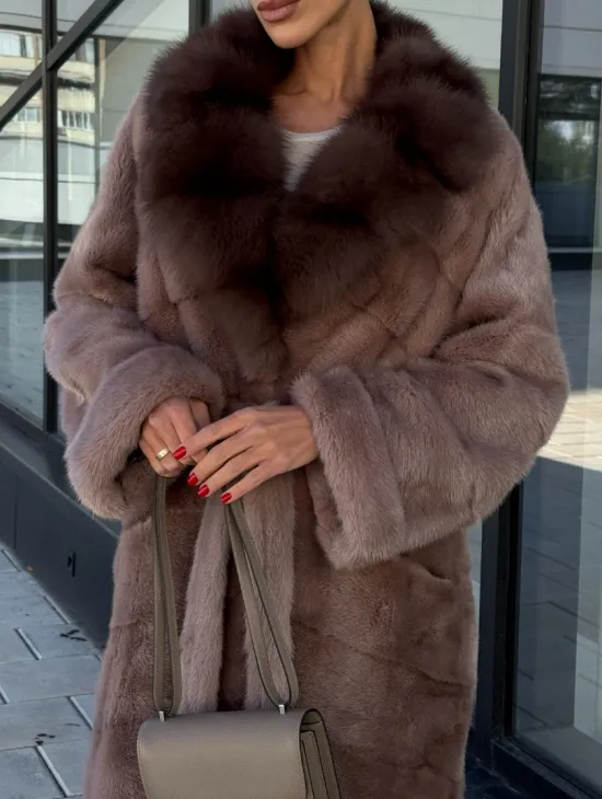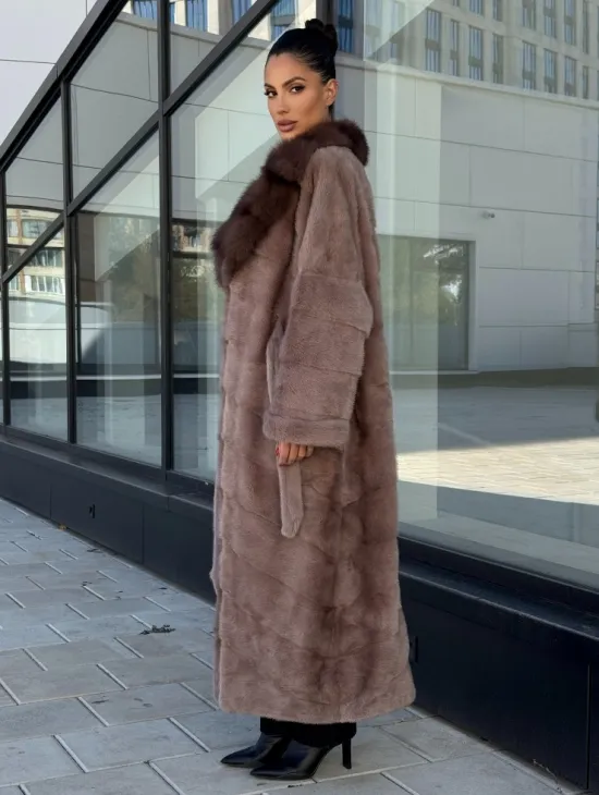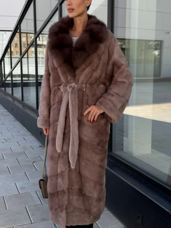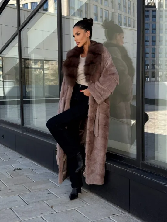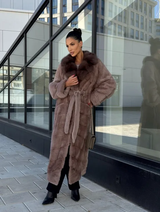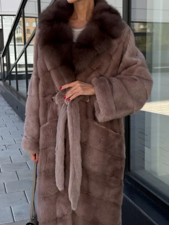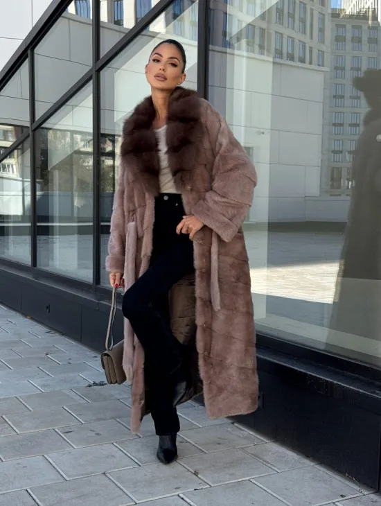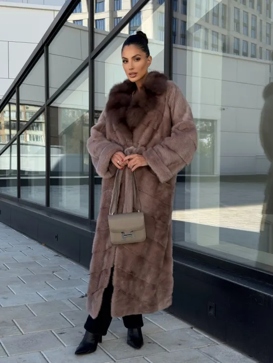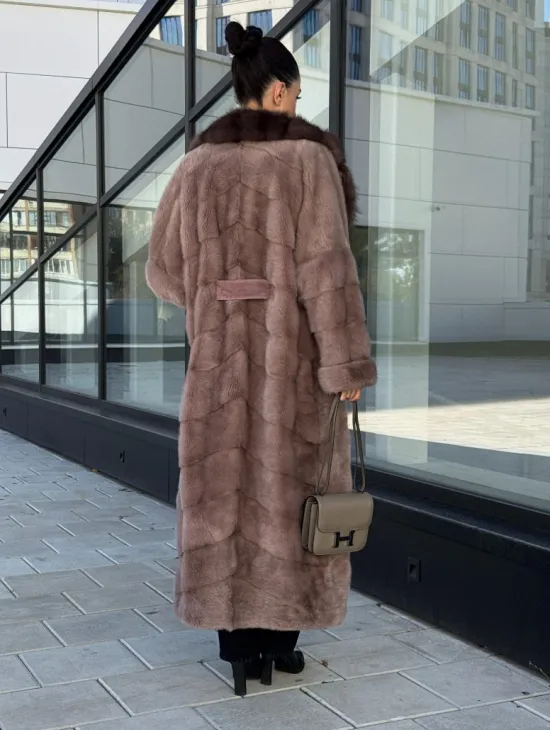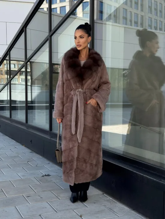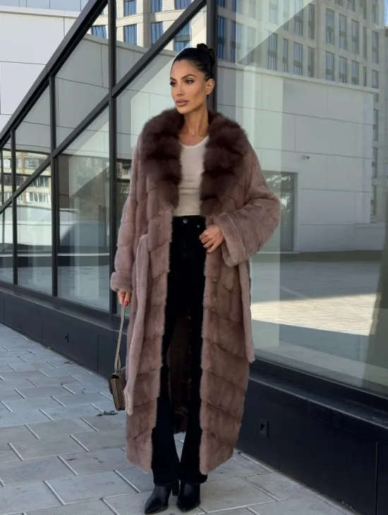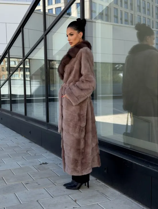 Длинная шуба из норки с воротником из меха куницы - цвет пыльная роза