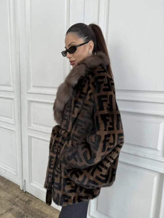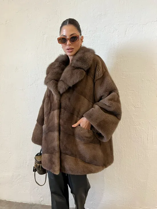 Короткая шуба в цвете соболь с воротником из меха куницы