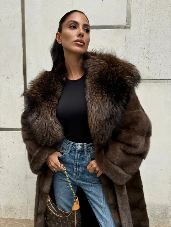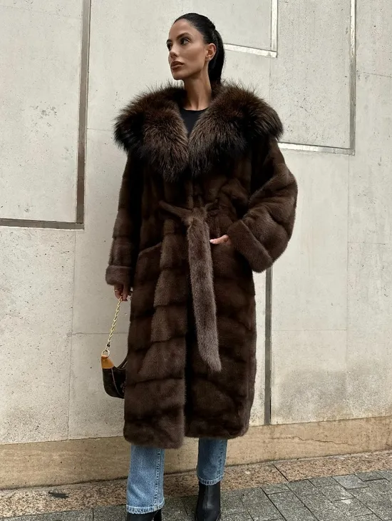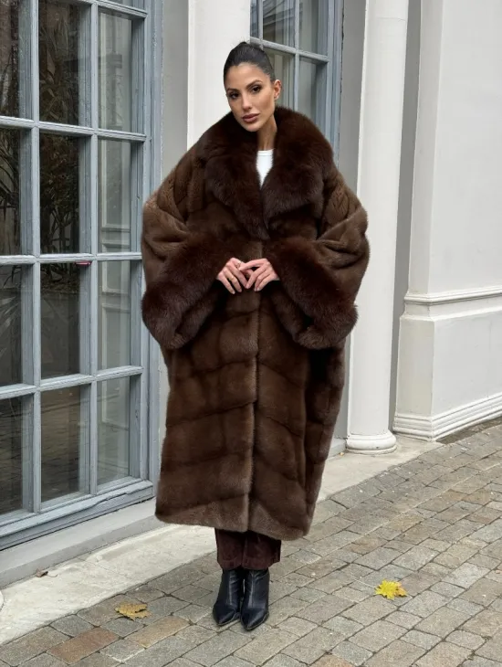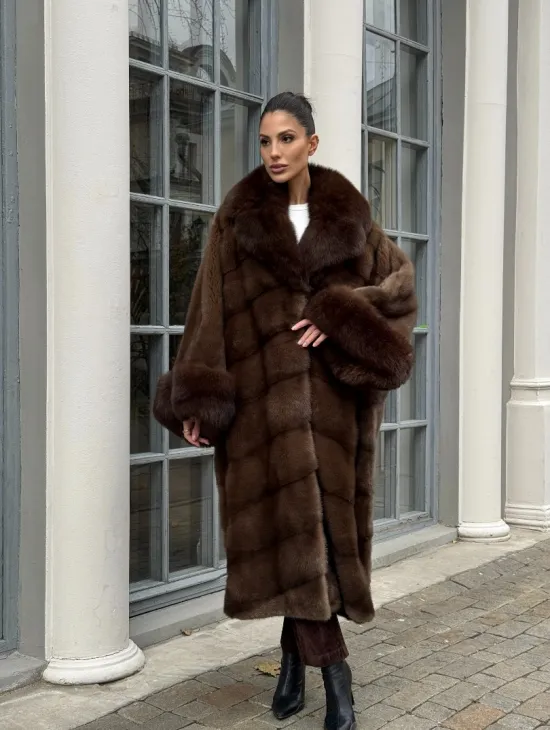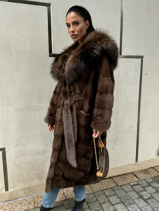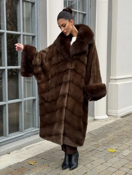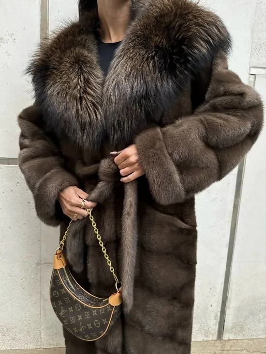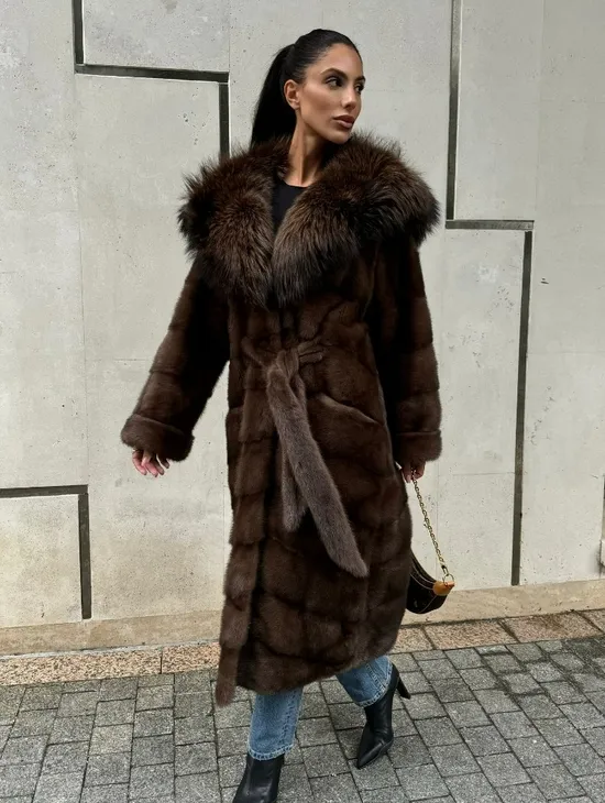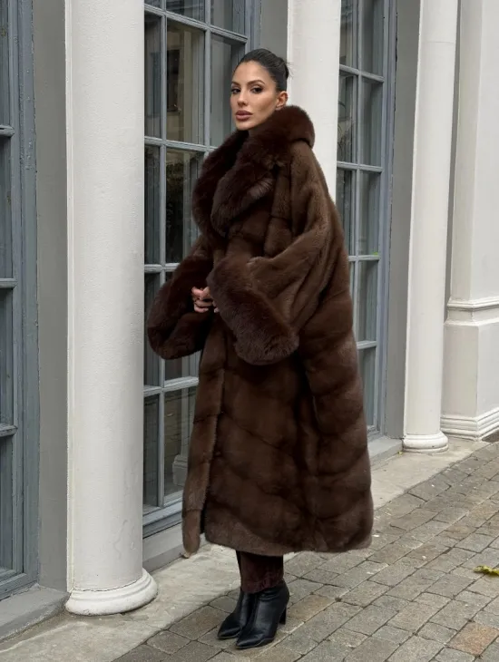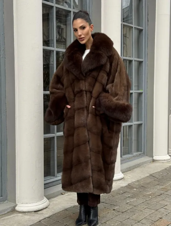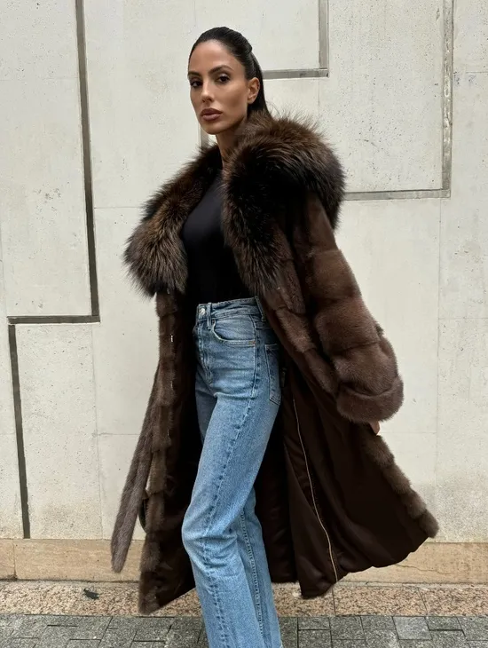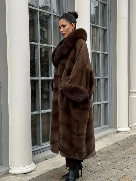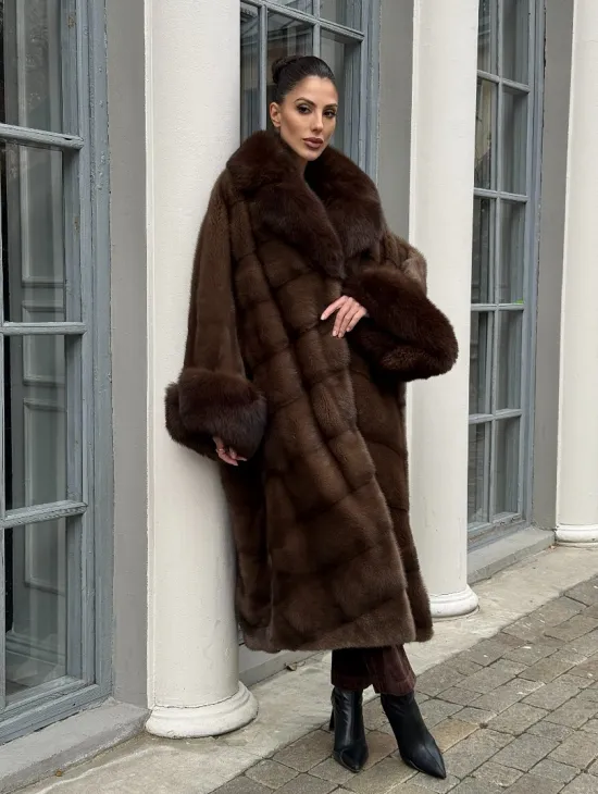 Норковая шуба пальто стиль «Бохо» с воротником и рукавами из меха песца - цвет орех
