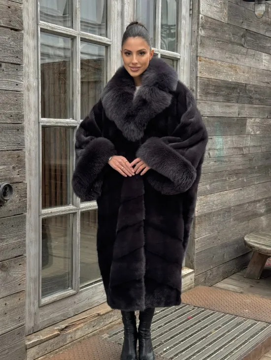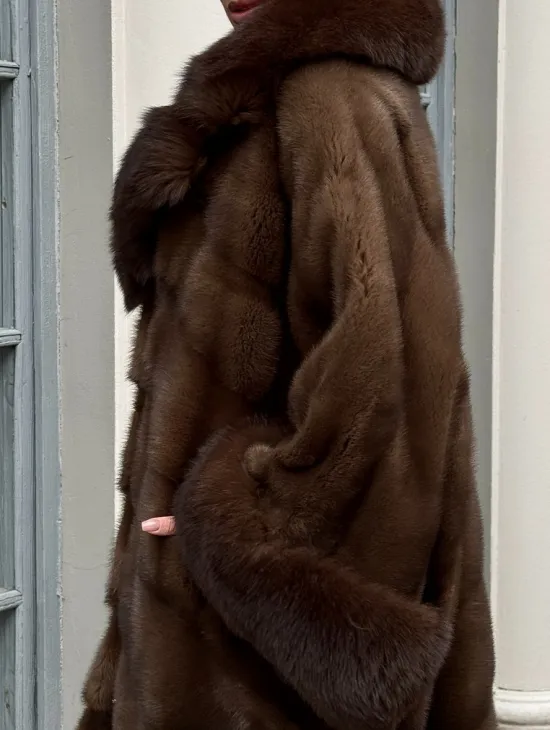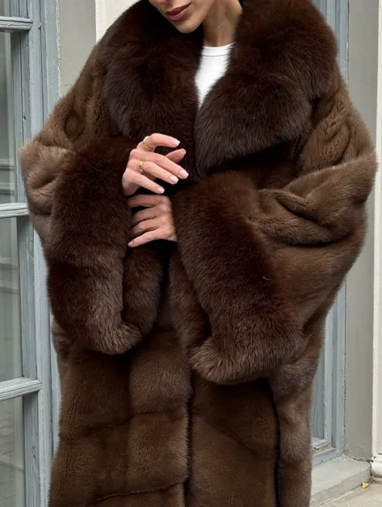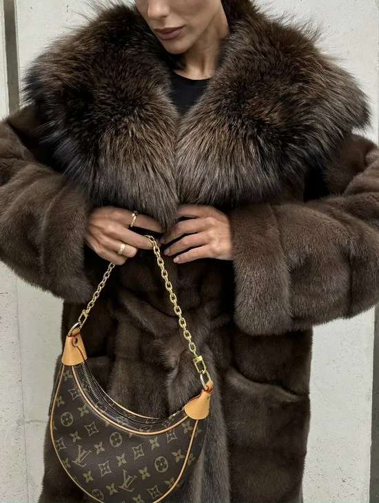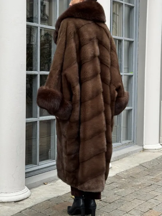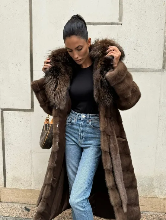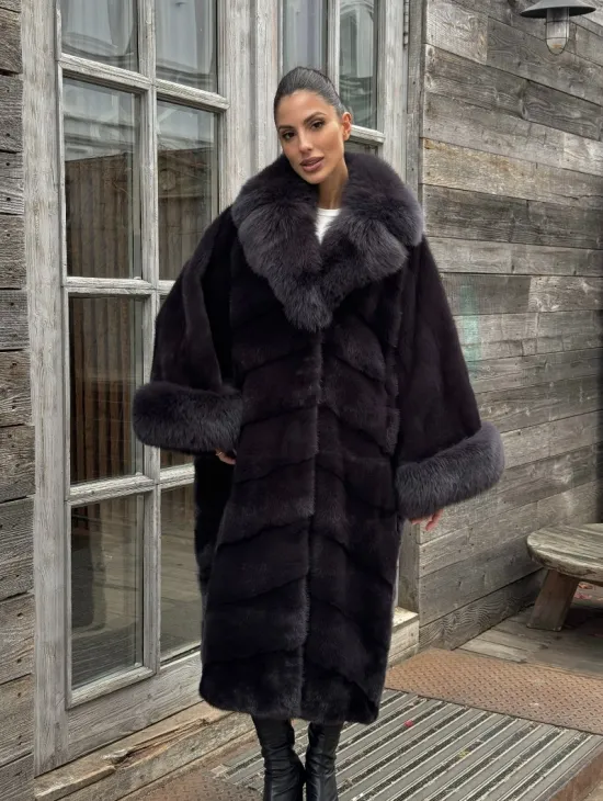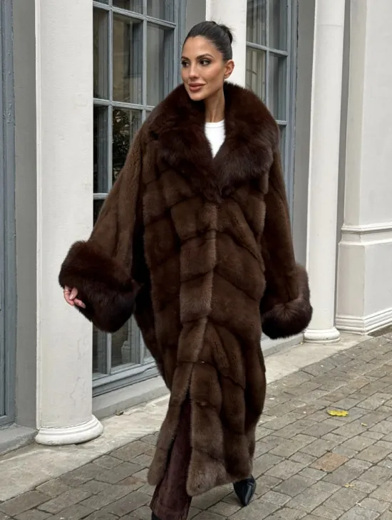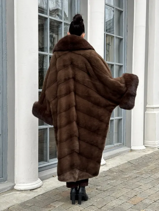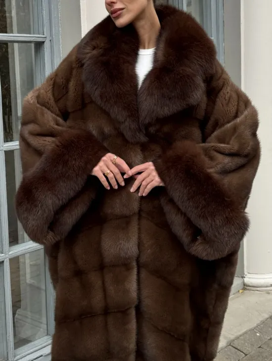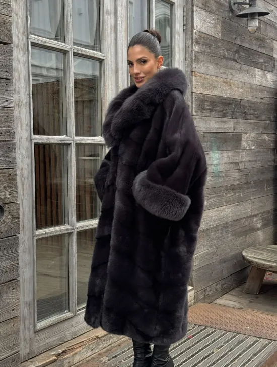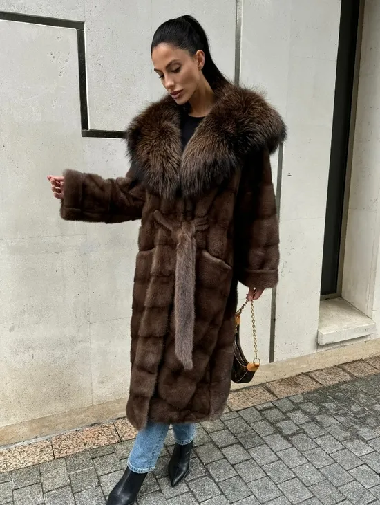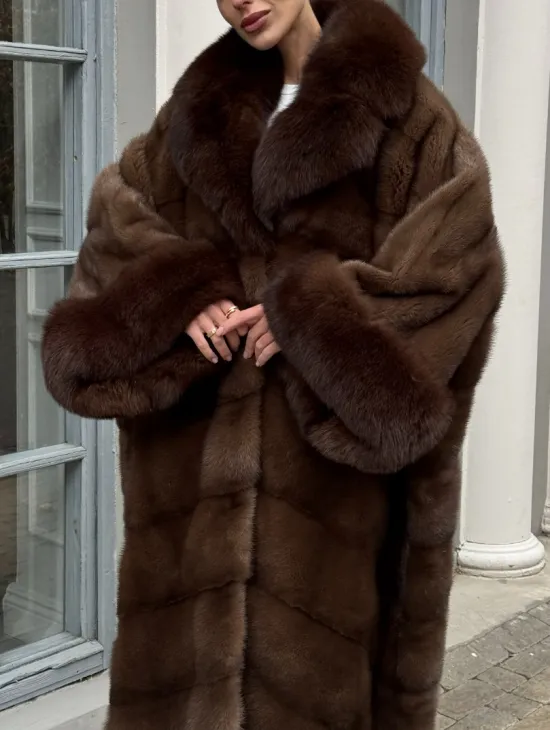 Норковая шуба пальто стиль «Бохо» с воротником и рукавами из меха песца - цвет орех