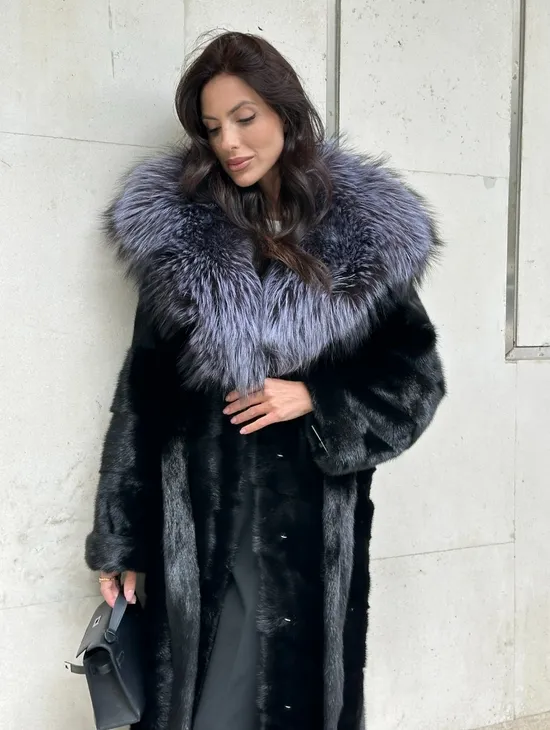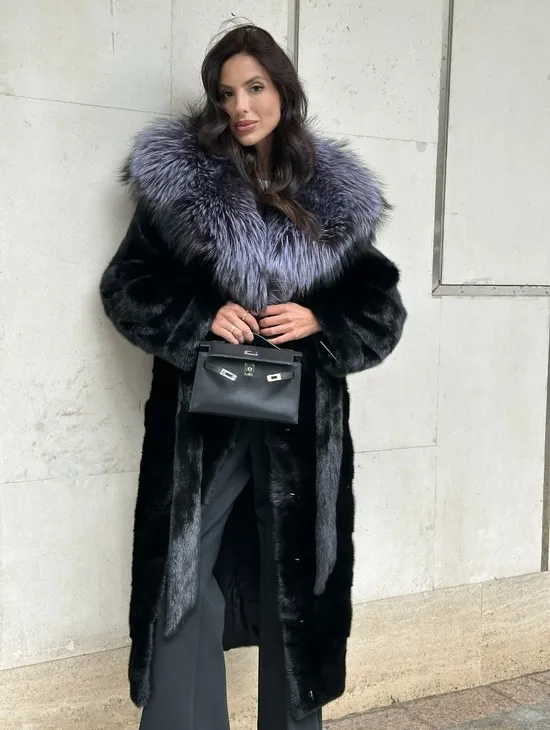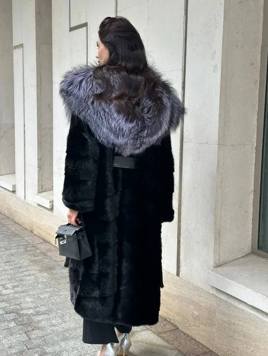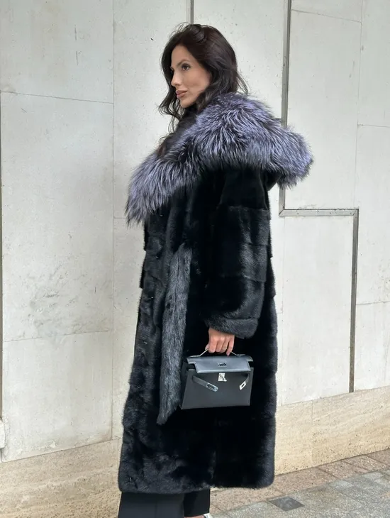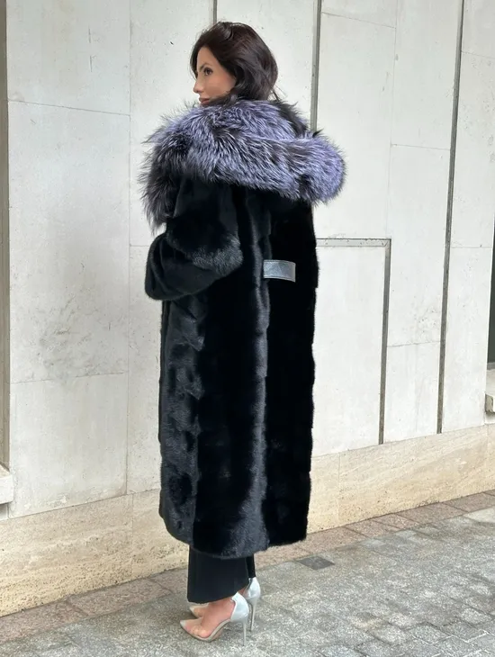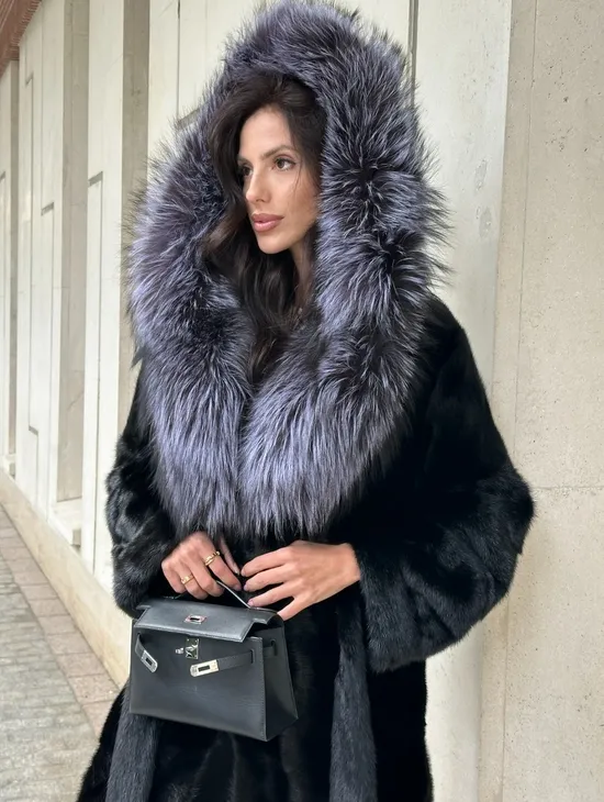 Норковая шуба черного цвета с капюшоном из чернобурки