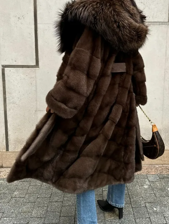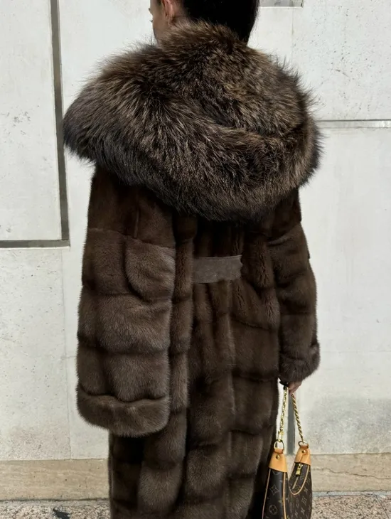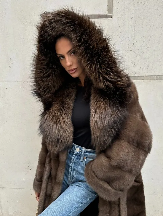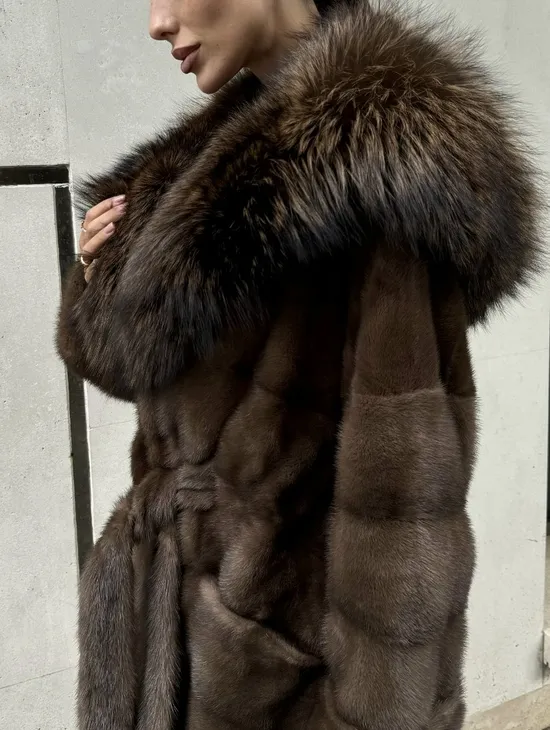 Норковая шуба с капюшоном кобра из меха чернобурки в коричневом цвете