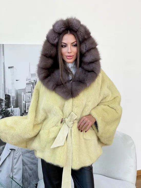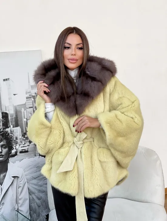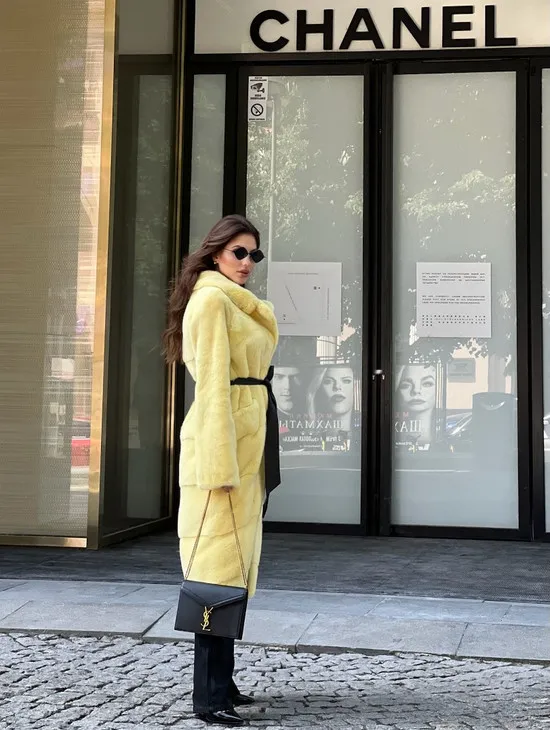 Мех данной шубы аукционная норка , цвет желтый. Предлагается в размерах от 42 до 52. Длина модели 65-70 см, что выгодно подчеркивает фигуру девушек. Эта модель идеально подойдет для девушек и женщин, предпочитающих роскошные натуральные меха.
