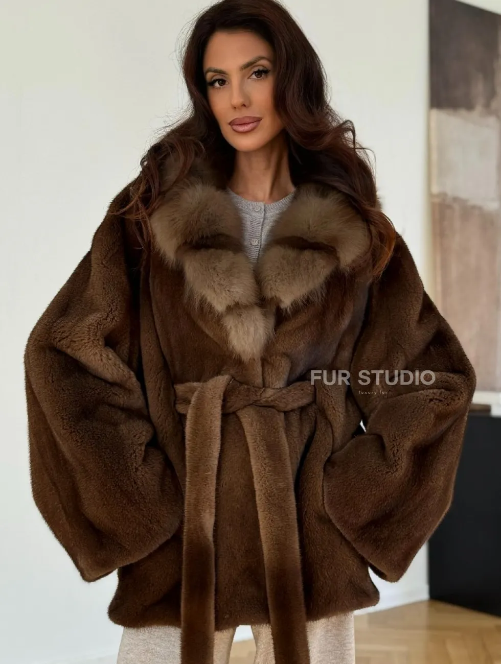 Мех данной шубы аукционная норка , цвет коричневый. Предлагается в размерах от 42 до 50 (oversize). Длина модели 70-75 см, что выгодно подчеркивает фигуру девушек. Эта модель идеально подойдет для девушек и женщин, предпочитающих роскошные натуральные меха.