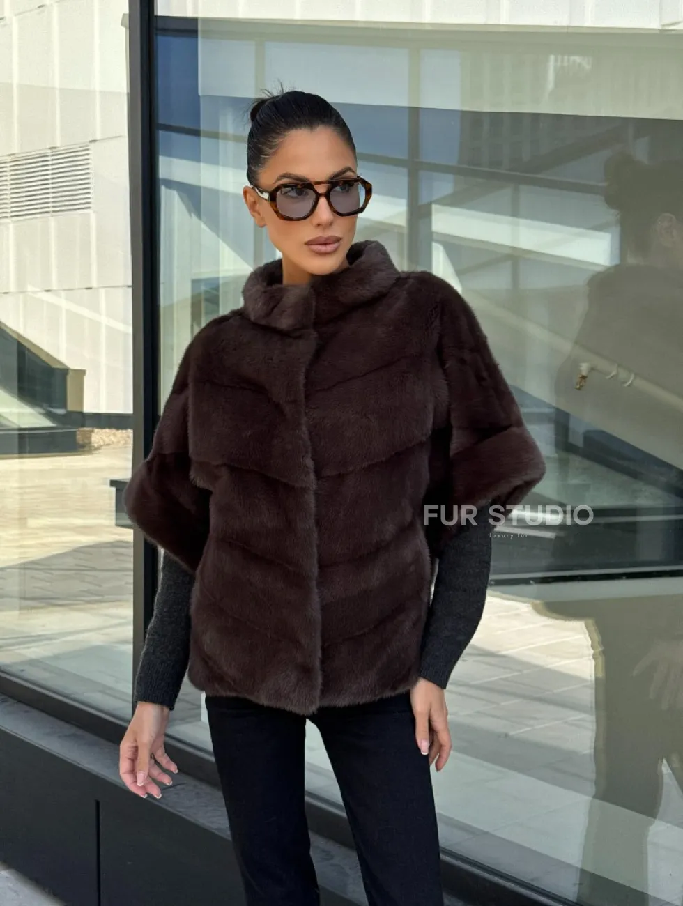 Материал выбранной модели — аукционная норка, доступна в цвете коричневый. Куртка предлагается в разнообразии размеров, от S до XL, а ее длина составляет 55-60 см, что выигрышно подчеркивает вашу фигуру. Этот вариант идеально подходит для тех, кто ценит роскошь и утонченность натуральных материалов.