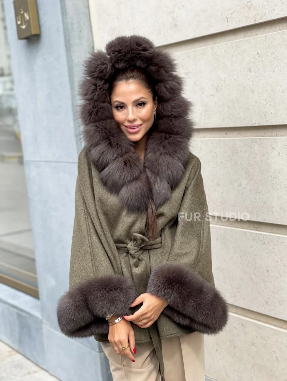 Пальто – пончо из натуральной шерсти с капюшоном из меха песца отличная альтернатива классическим моделям. Натуральная шерсть согреет в прохладное время года. Шерсть приятна на ощупь и комфортна к телу. Нежный оттенок классно выделит цвет волос и глаз владелицы. Роскошный капюшон из меха песца позаботится о прическе в ветреную погоду. Меховые манжеты делают акцент на тонкости кистей.