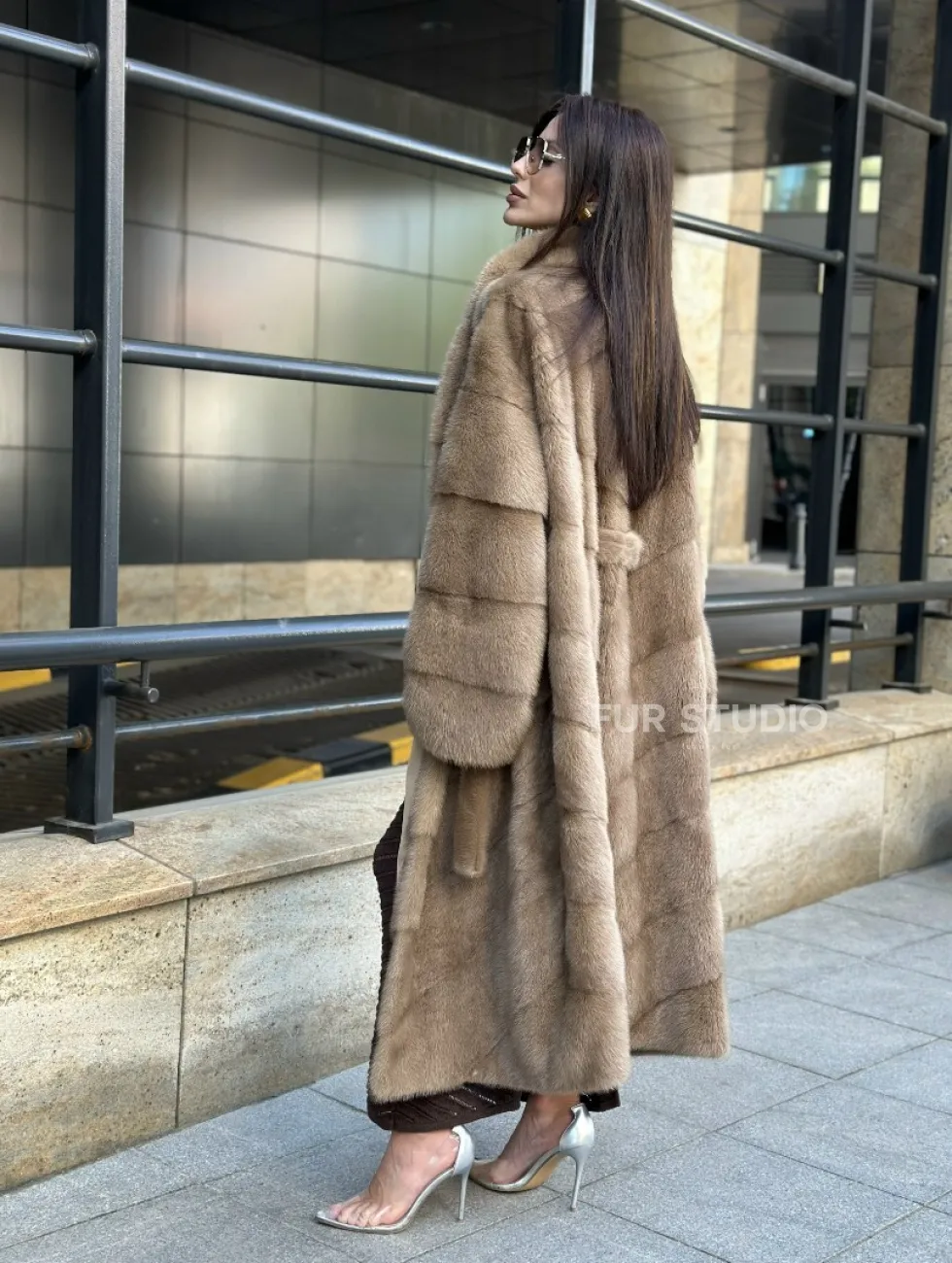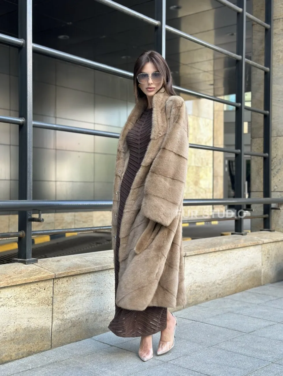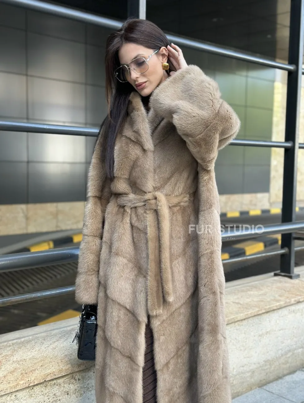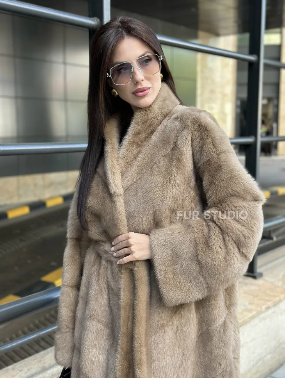 Мех данной шубы аукционная норка, цвет бежевый. Предлагается в размерах от 42 до 50. Длина модели 115-120 см, что выгодно подчеркивает фигуру девушек. Эта модель идеально подойдет для девушек и женщин, предпочитающих роскошные натуральные меха.