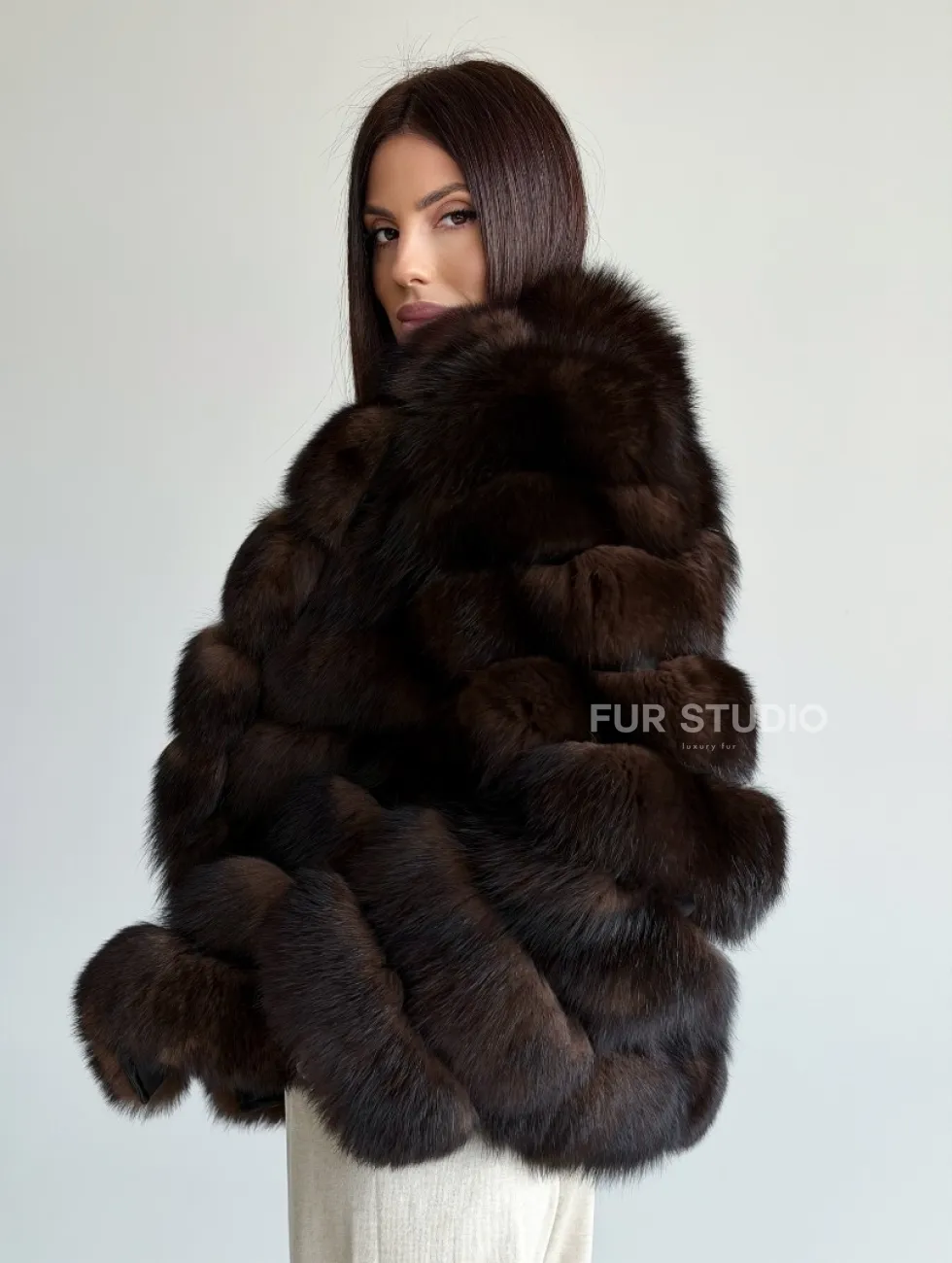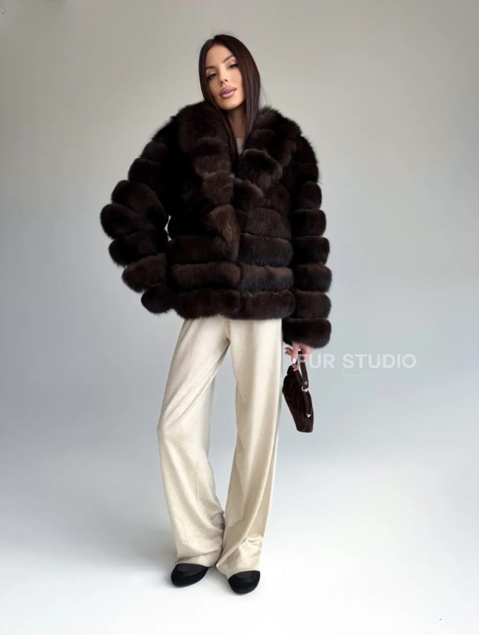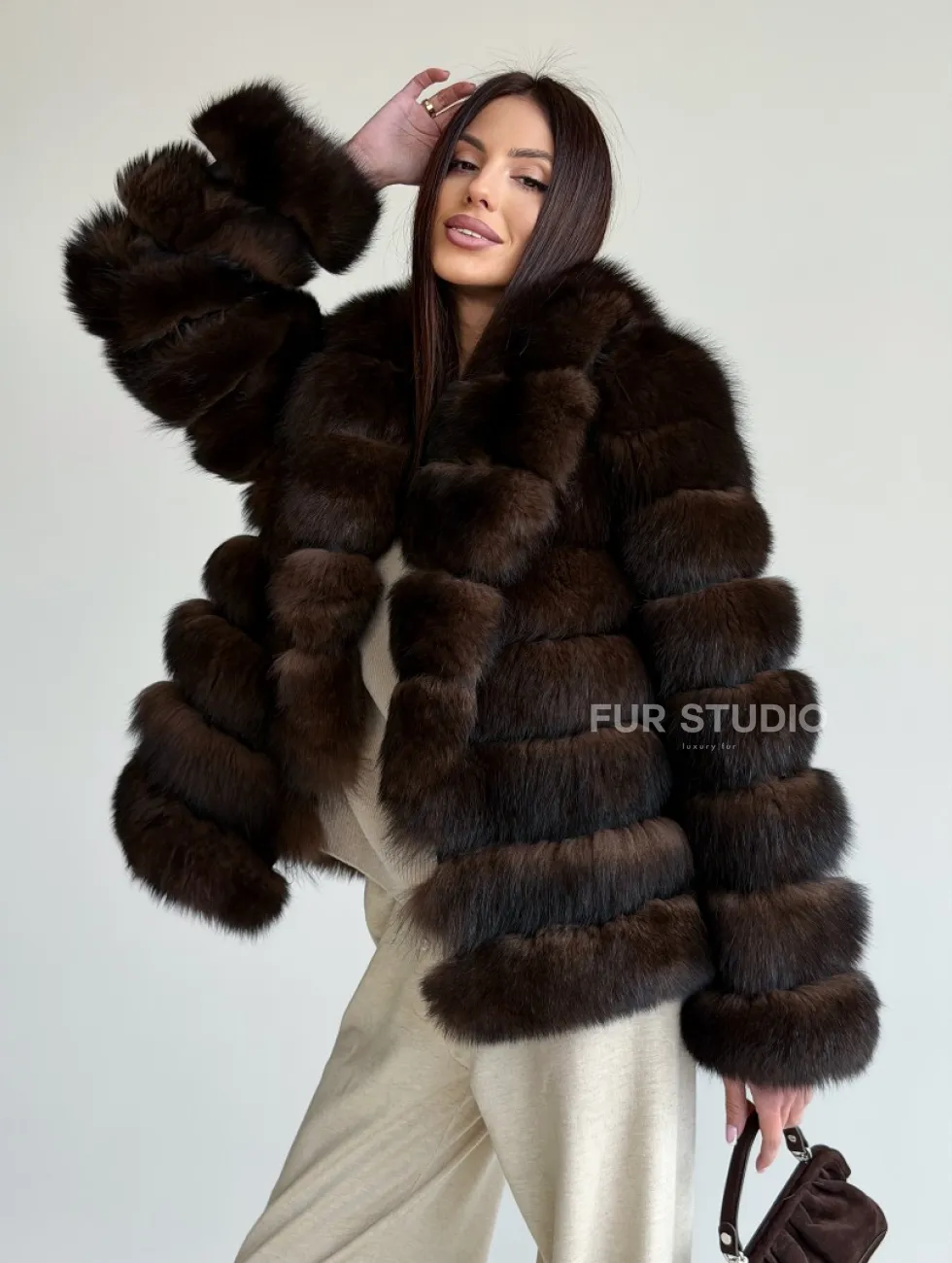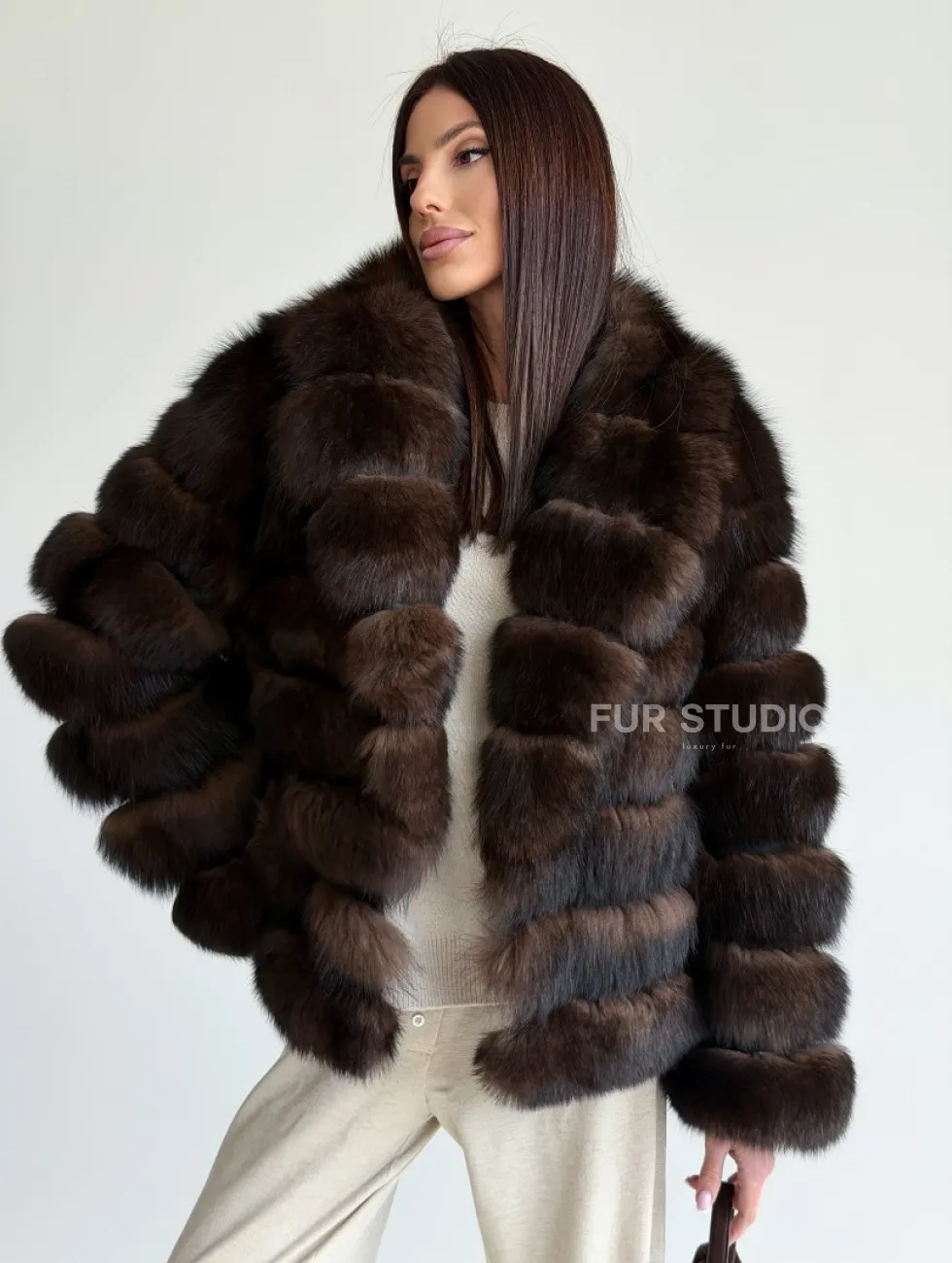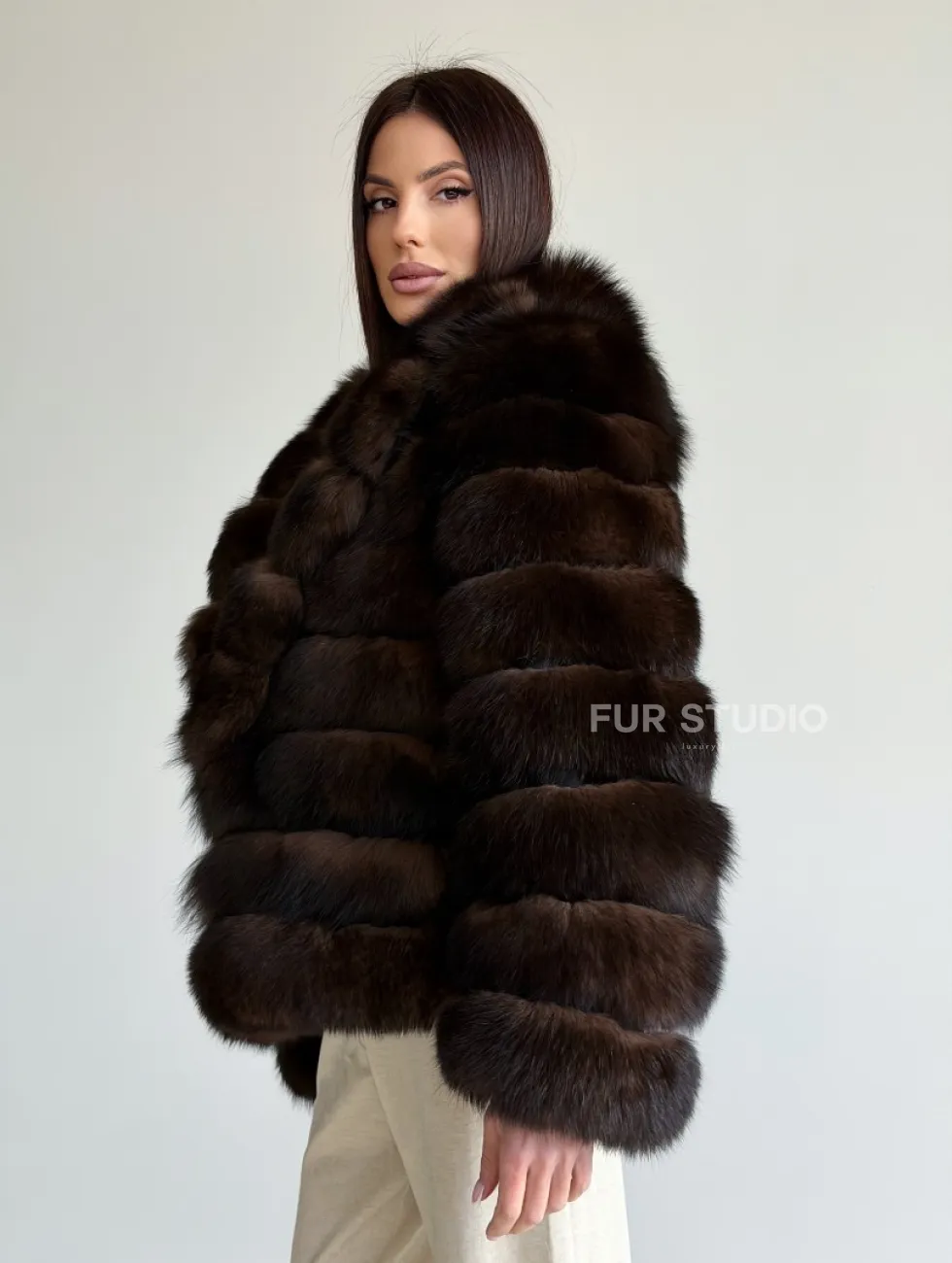 Мех данной шубы финский песец, цвет коричневый. Предлагается в размерах от 42 до 50. Длина модели 60-65 см, что выгодно подчеркивает фигуру девушек. Эта модель идеально подойдет для девушек и женщин, предпочитающих роскошные натуральные меха.