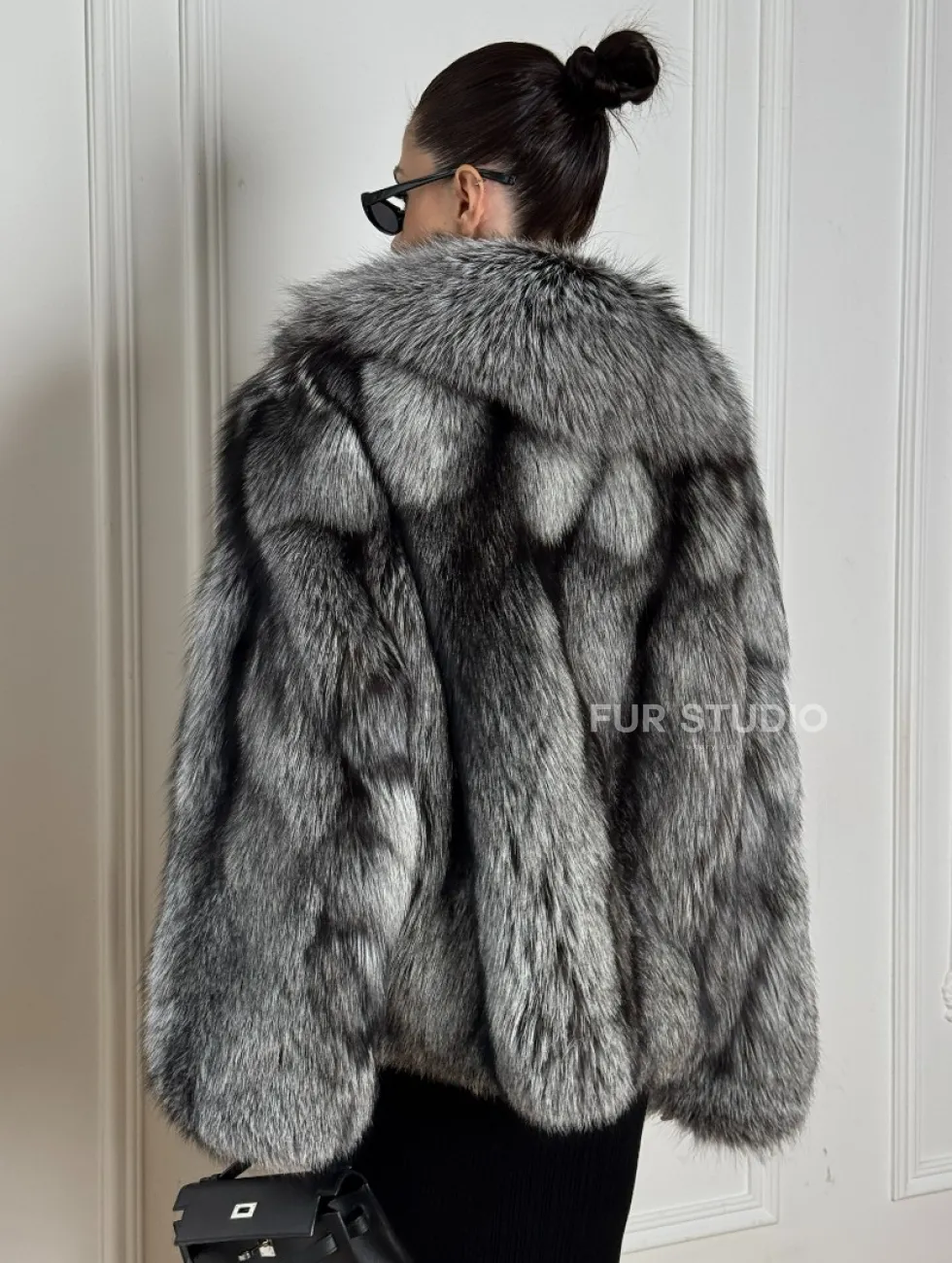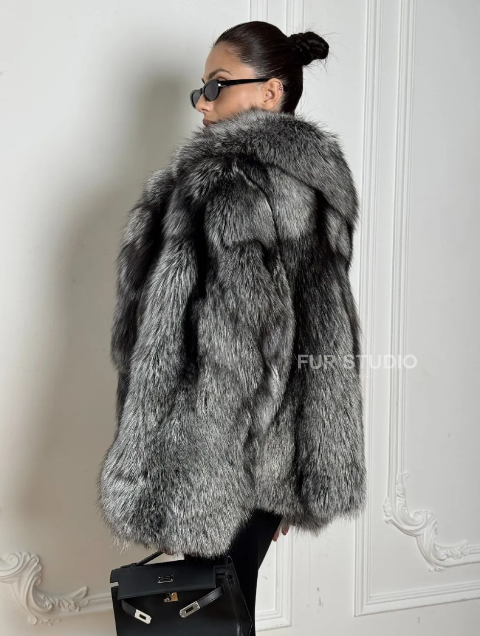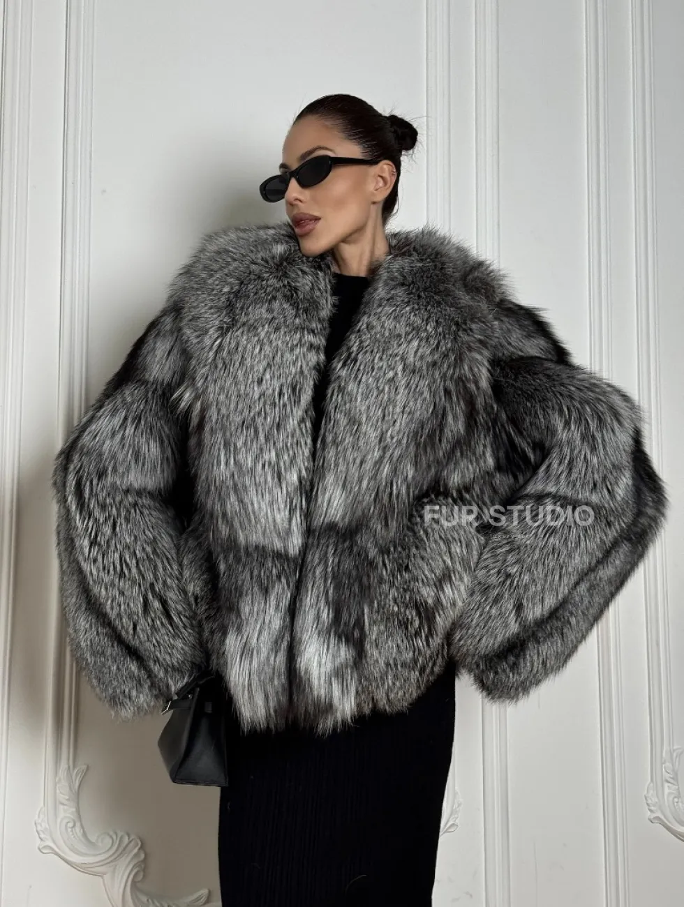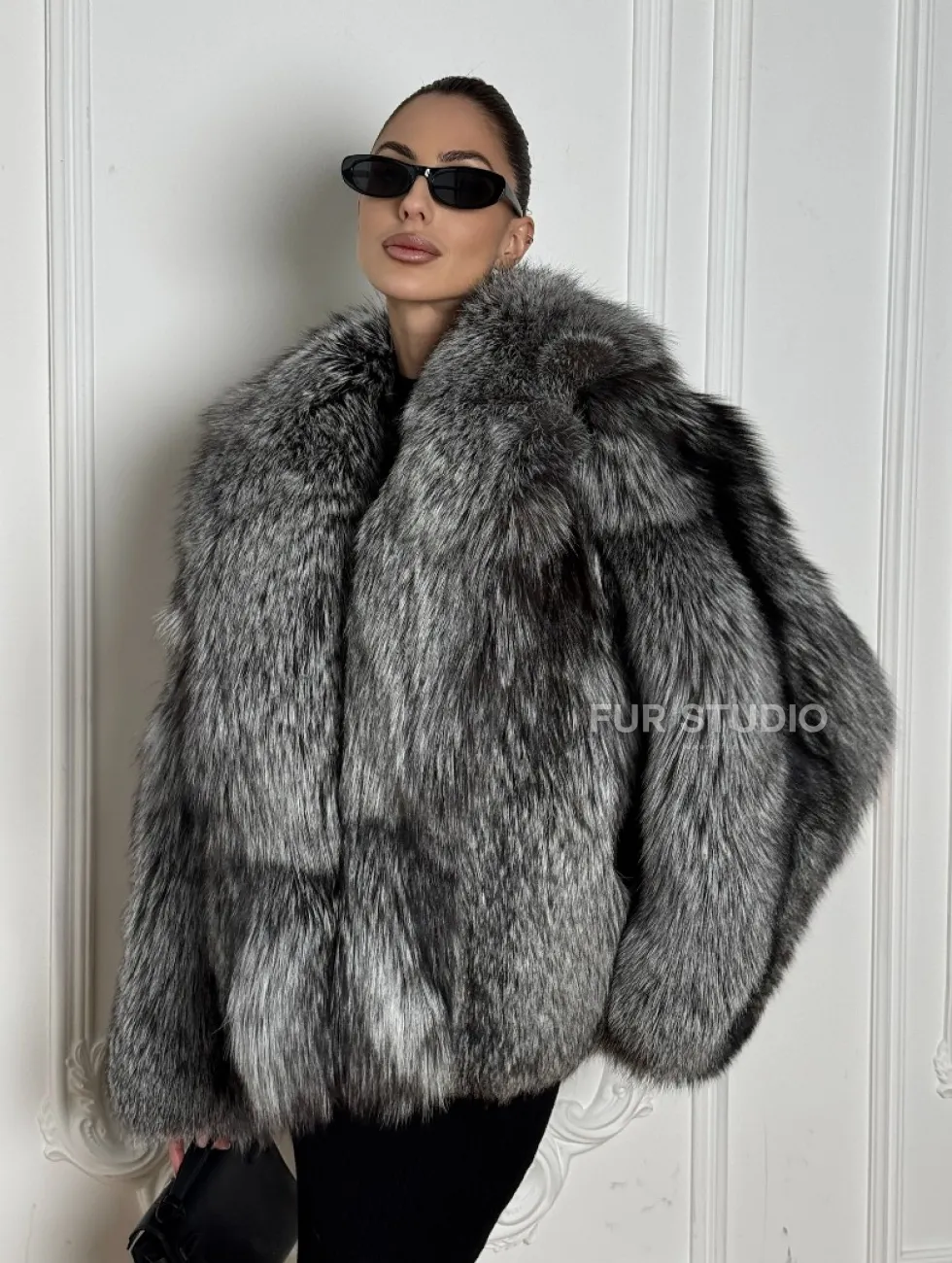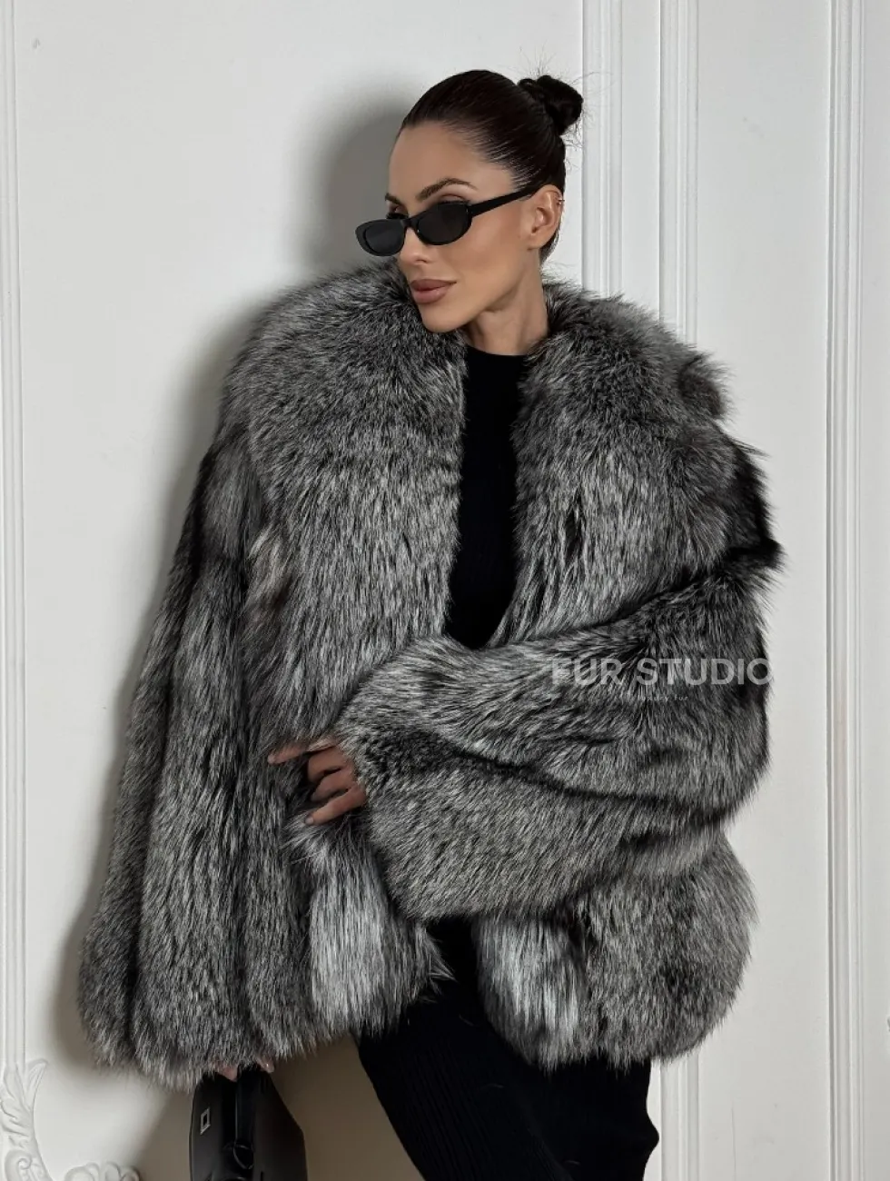 Мех данной шубы лиса, цвет серый. Предлагается в размерах от 42 до 48. Длина модели 55-60 см, что выгодно подчеркивает фигуру девушек. Эта модель идеально подойдет для девушек и женщин, предпочитающих роскошные натуральные меха.