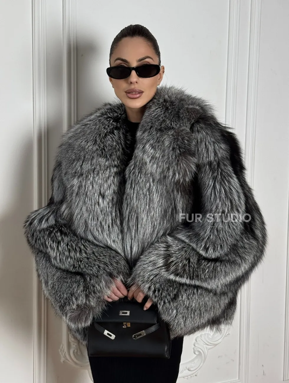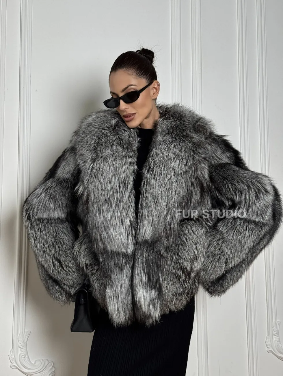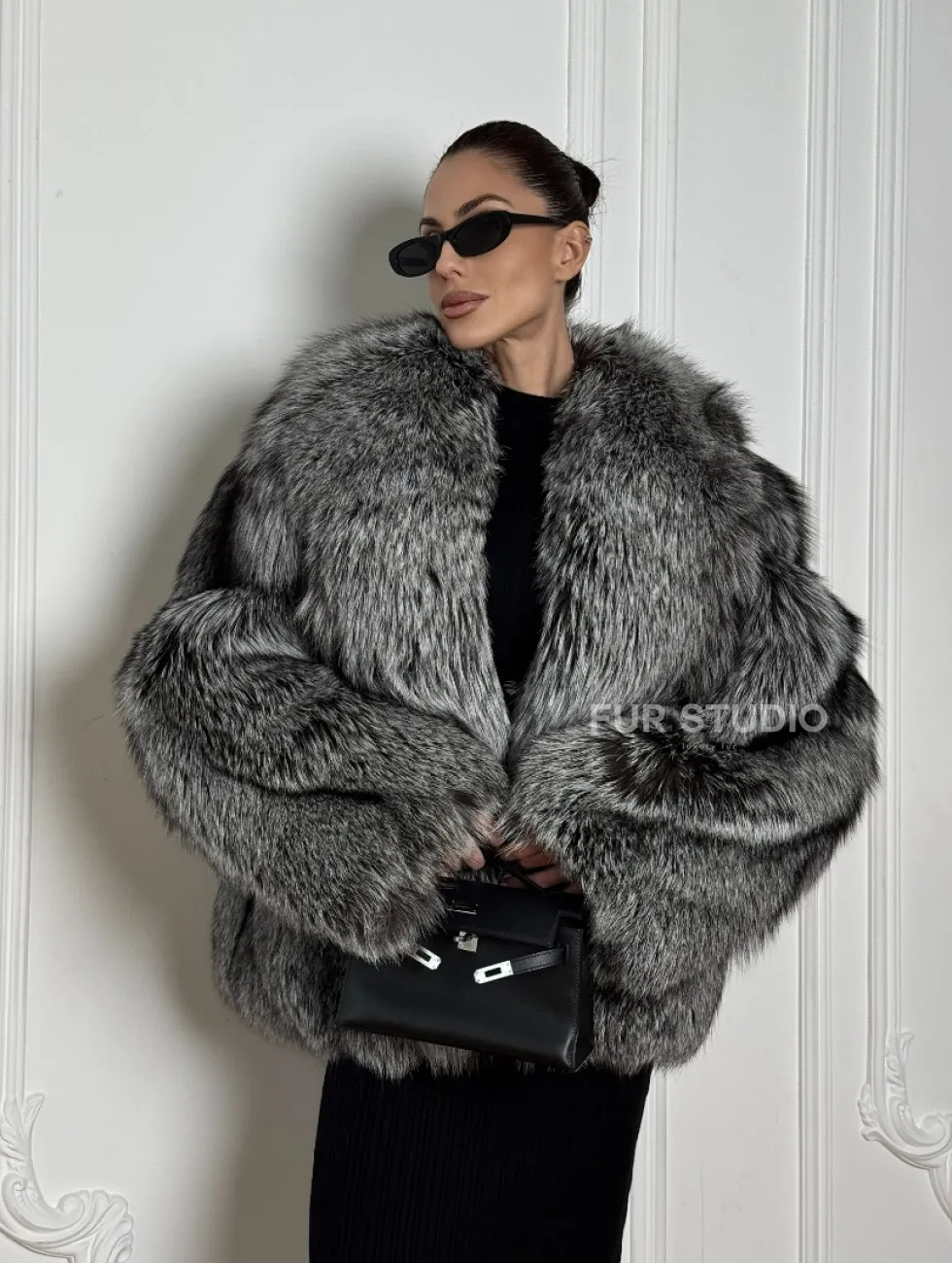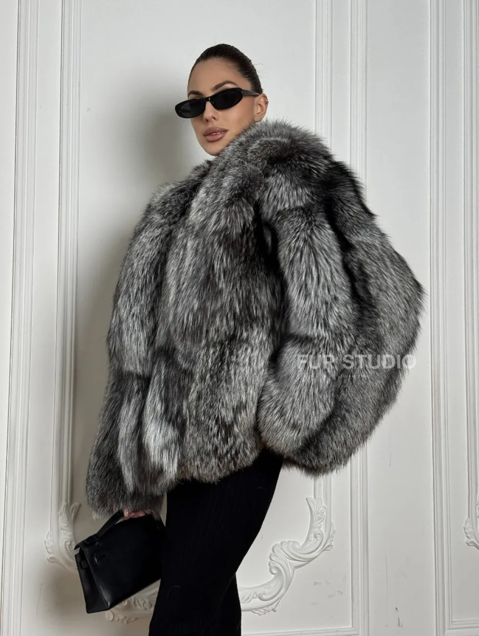 Мех данной шубы лиса, цвет серый. Предлагается в размерах от 42 до 48. Длина модели 55-60 см, что выгодно подчеркивает фигуру девушек. Эта модель идеально подойдет для девушек и женщин, предпочитающих роскошные натуральные меха.