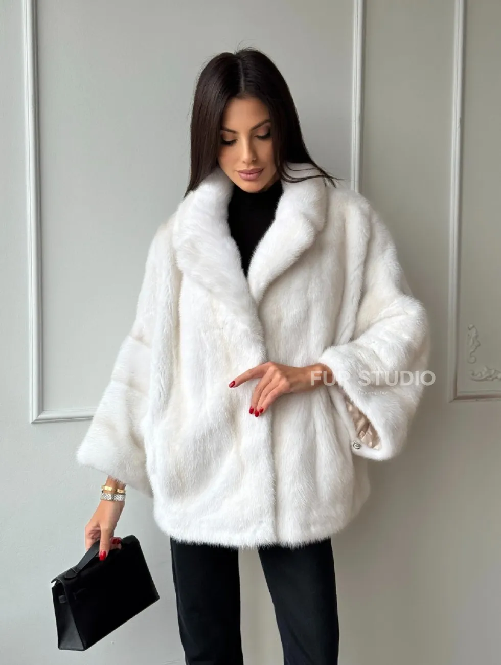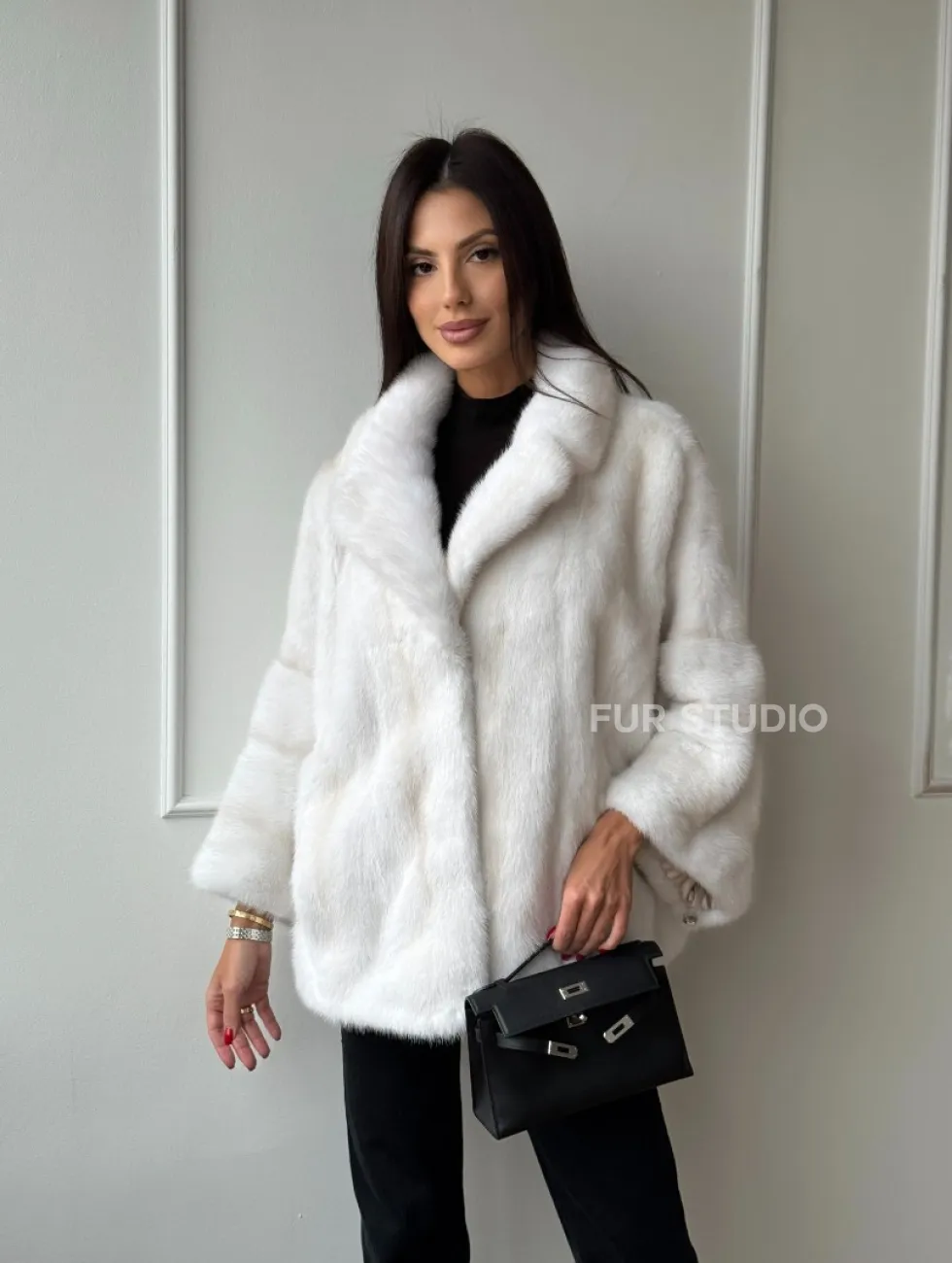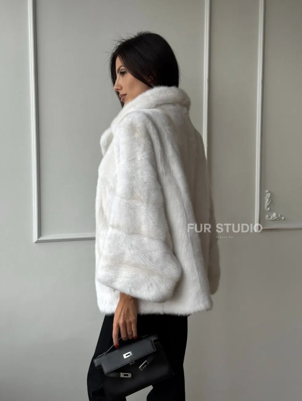 Мех данной шубы аукционная норка, цвет белый. Предлагается в размерах от 42 до 50. Длина модели 60-65 см, что выгодно подчеркивает фигуру девушек. Эта модель идеально подойдет для девушек и женщин, предпочитающих роскошные натуральные меха.