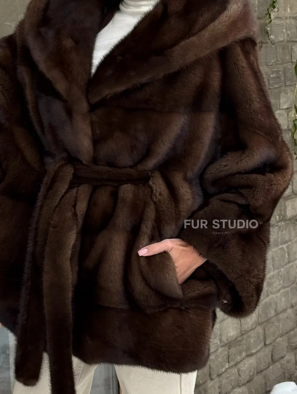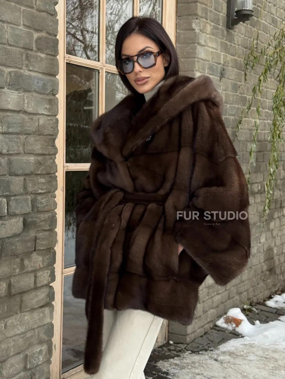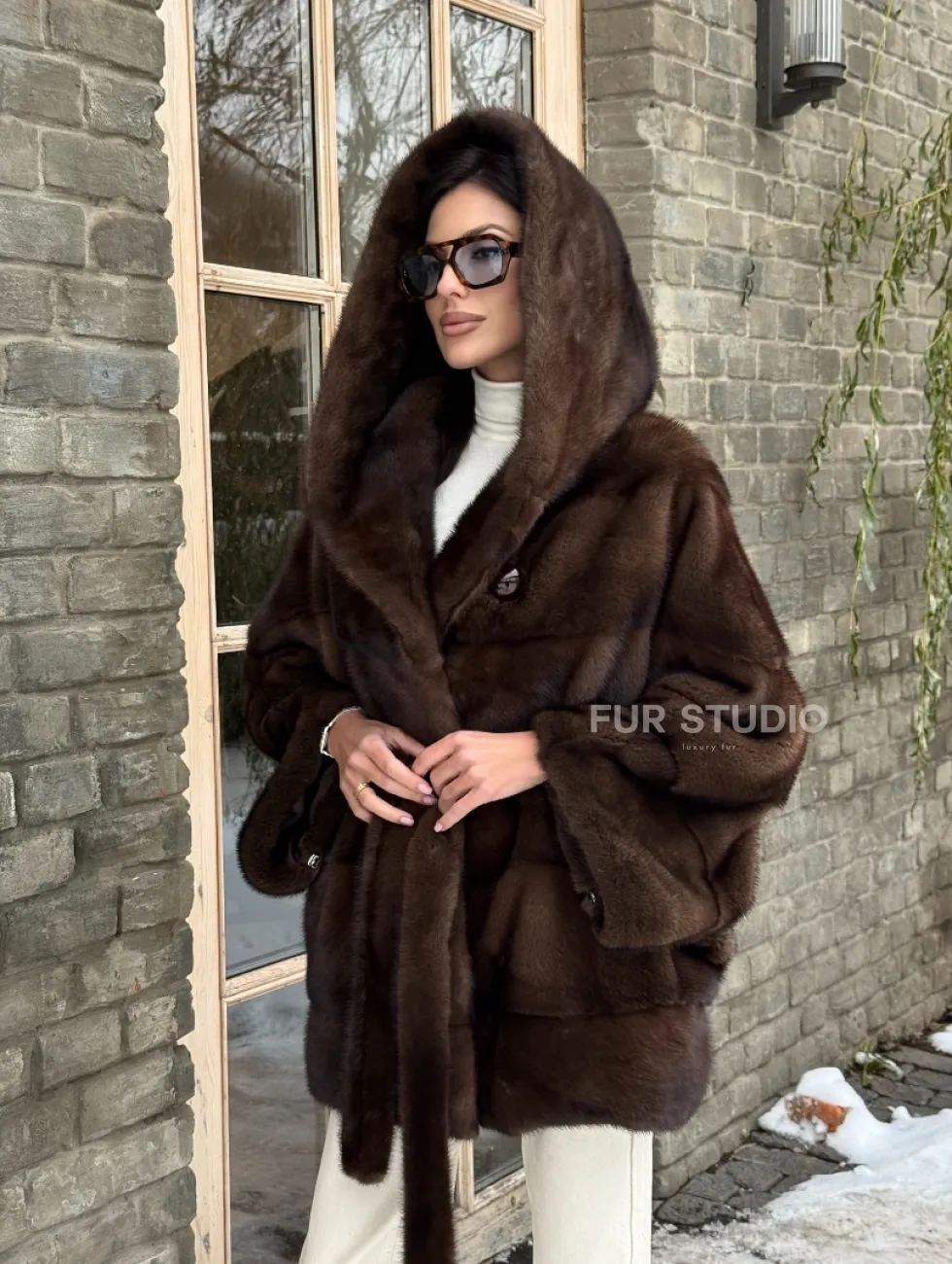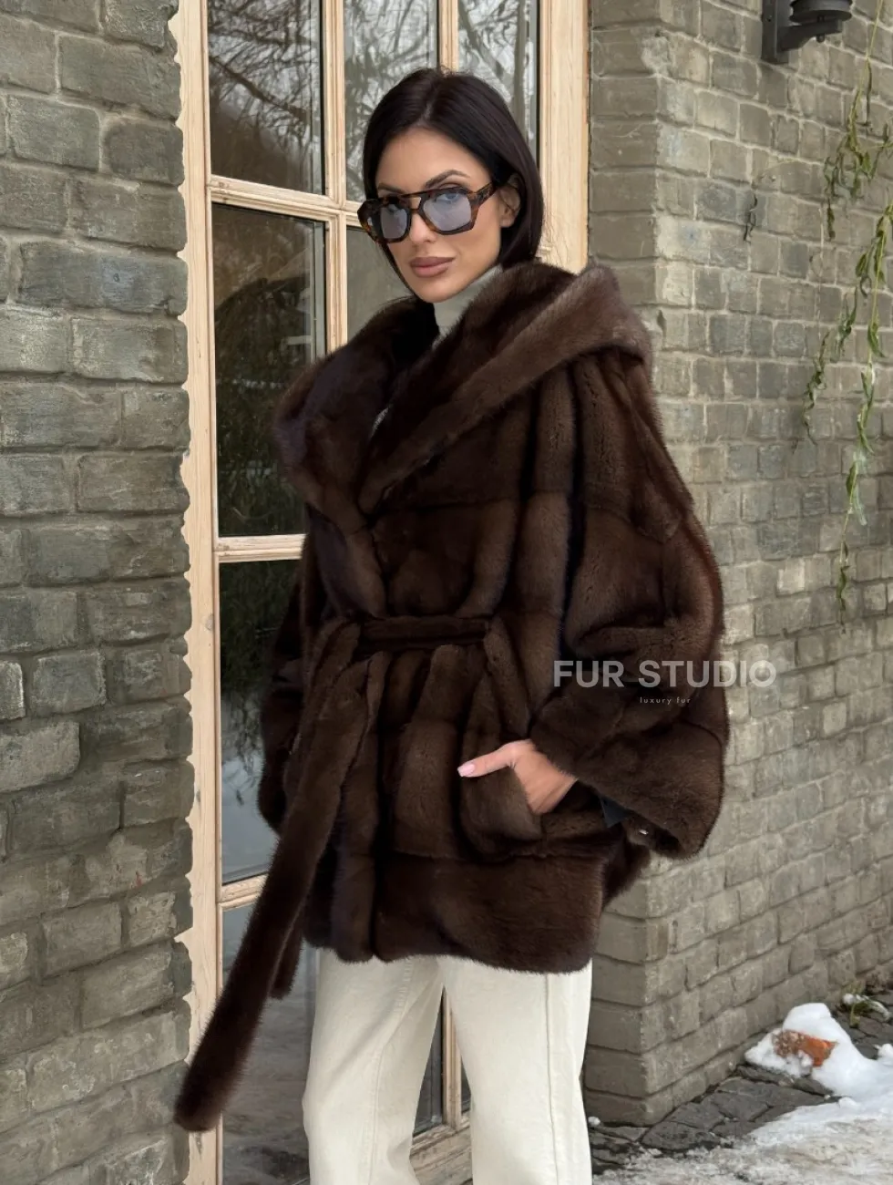 Полушубок из натурального меха норки Nafa mink в цвете соболь с капюшоном, фасон - летучая мышь доступна для покупки в нашем шоуруме Furs Studio в Чите. У нас так же есть доставка во все города России. Добавьте немного роскоши в свой гардероб с этой шубой, которая будет служить вам многие годы.