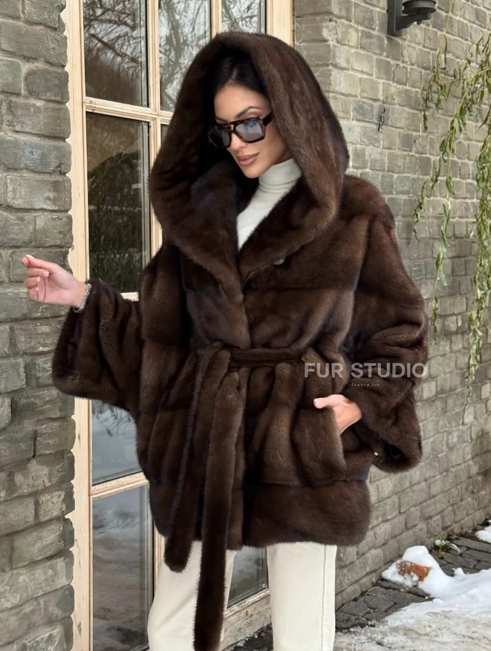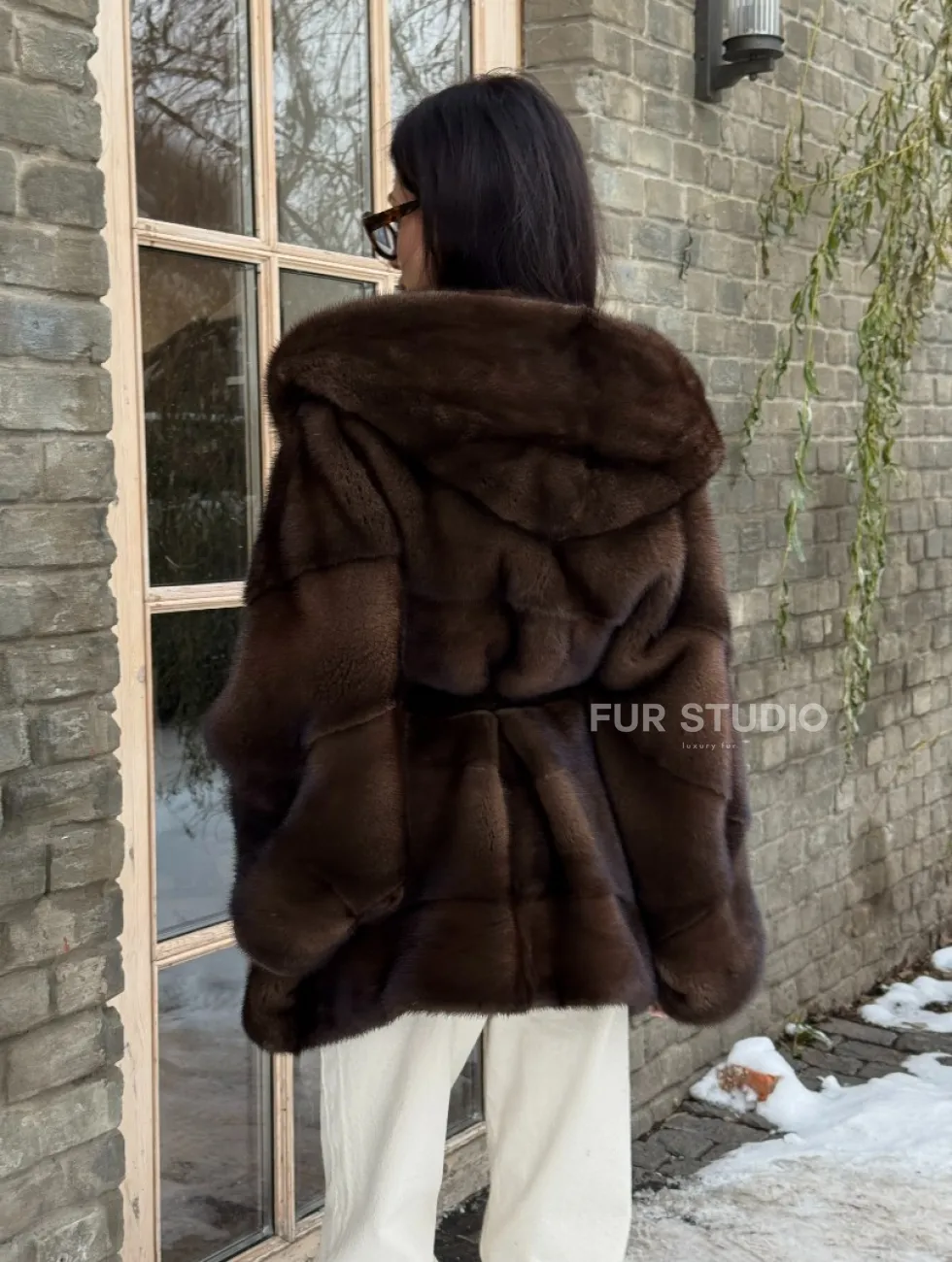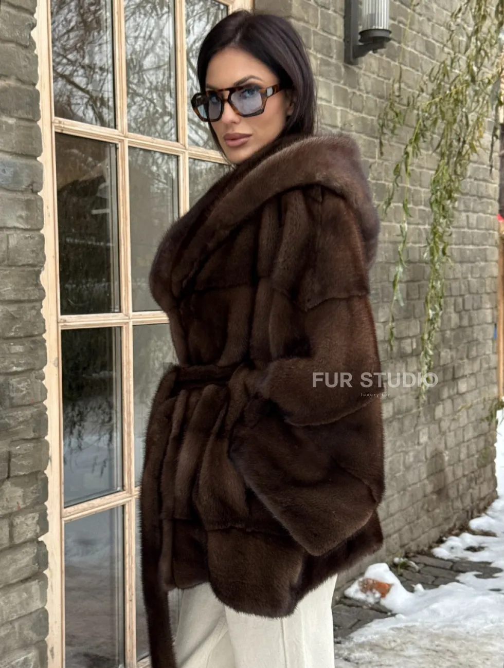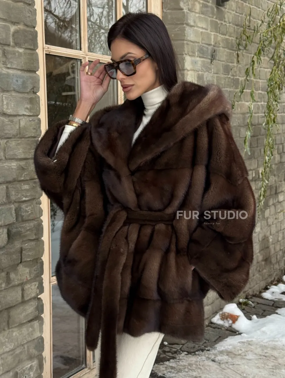 Полушубок из натурального меха норки Nafa mink в цвете соболь с капюшоном, фасон - летучая мышь доступна для покупки в нашем шоуруме Furs Studio в Чите. У нас так же есть доставка во все города России. Добавьте немного роскоши в свой гардероб с этой шубой, которая будет служить вам многие годы.