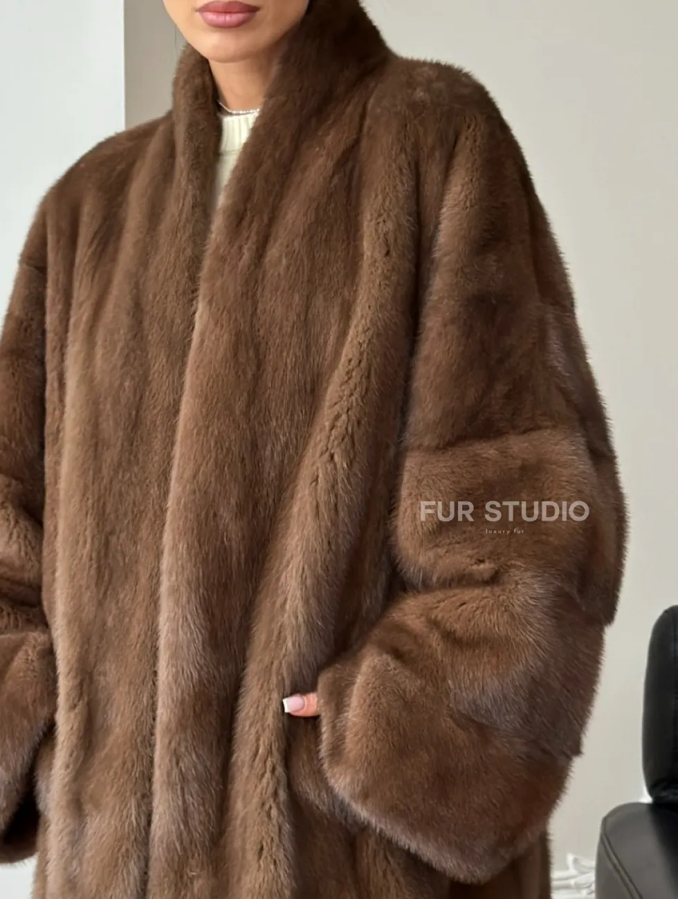 Мех данной шубы аукционная норка, цвет коричневый. Предлагается в размерах от 42 до 54. Длина модели 75-80 см, что выгодно подчеркивает фигуру девушек. Эта модель идеально подойдет для девушек и женщин, предпочитающих роскошные натуральные меха.