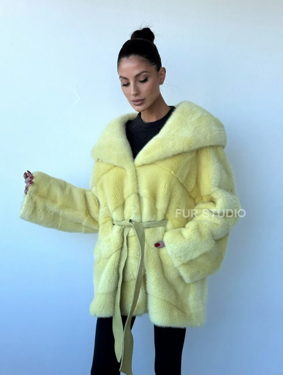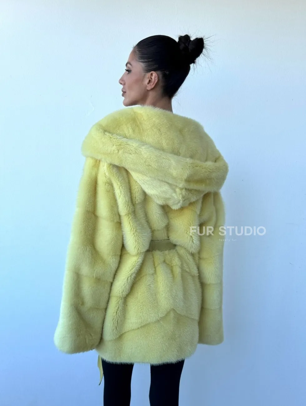 Полушубок кимоно из аукционной норки с капюшоном в нежно-желтом цвете доступна для покупки в нашем шоуруме Furs Studio в Чите. У нас так же есть доставка во все города России. Добавьте немного роскоши в свой гардероб с этой шубой, которая будет служить вам многие годы.