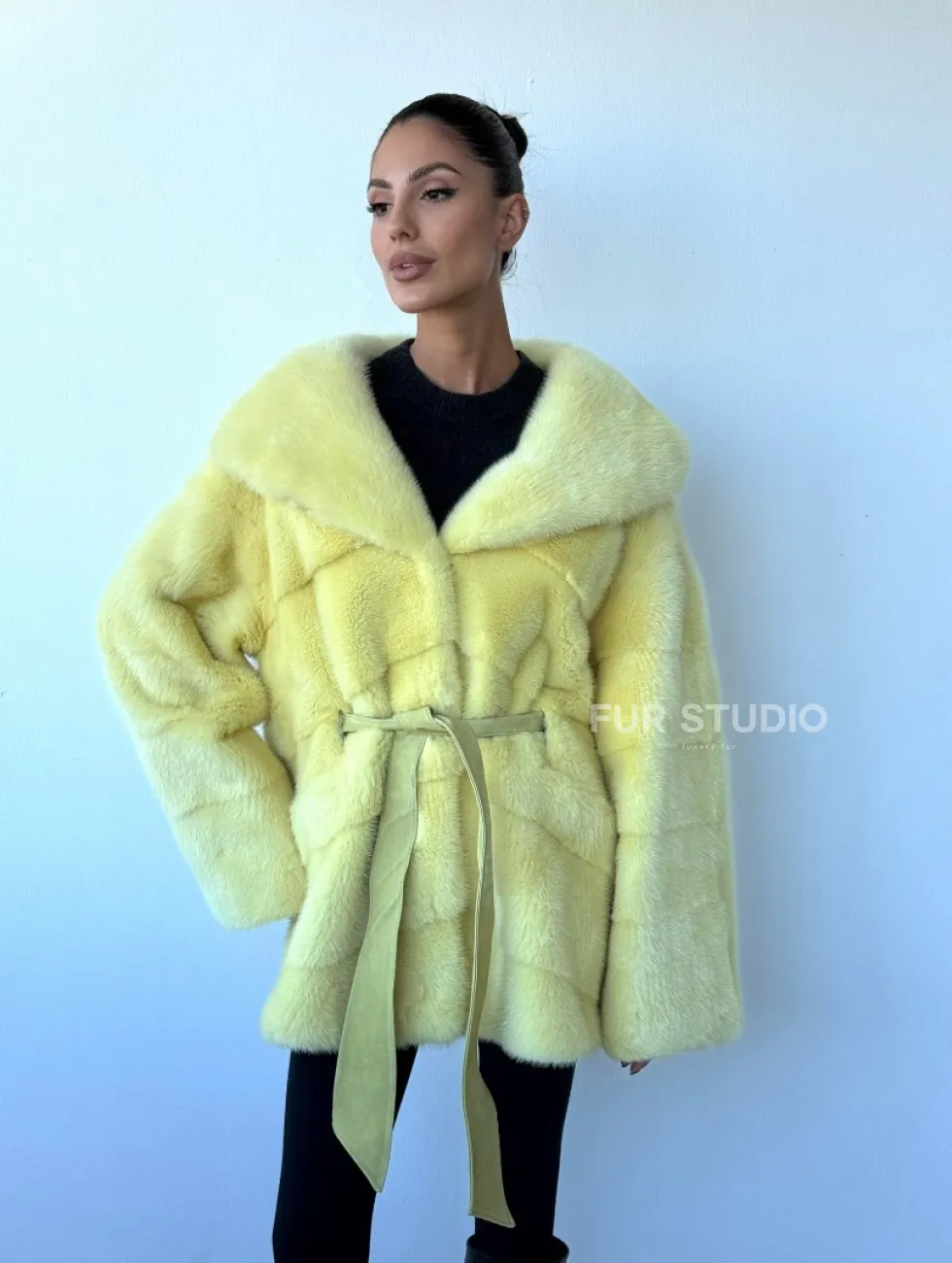 Мех данной шубы аукционная норка, цвет желтый. Предлагается в размерах от 42 до 54. Длина модели 70-75 см, что выгодно подчеркивает фигуру девушек. Эта модель идеально подойдет для девушек и женщин, предпочитающих роскошные натуральные меха.