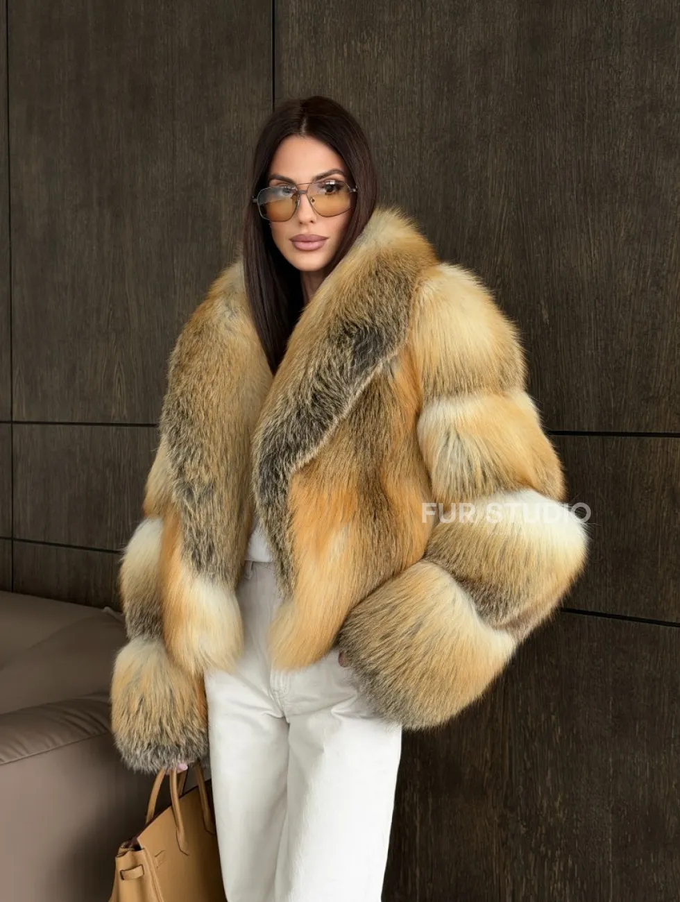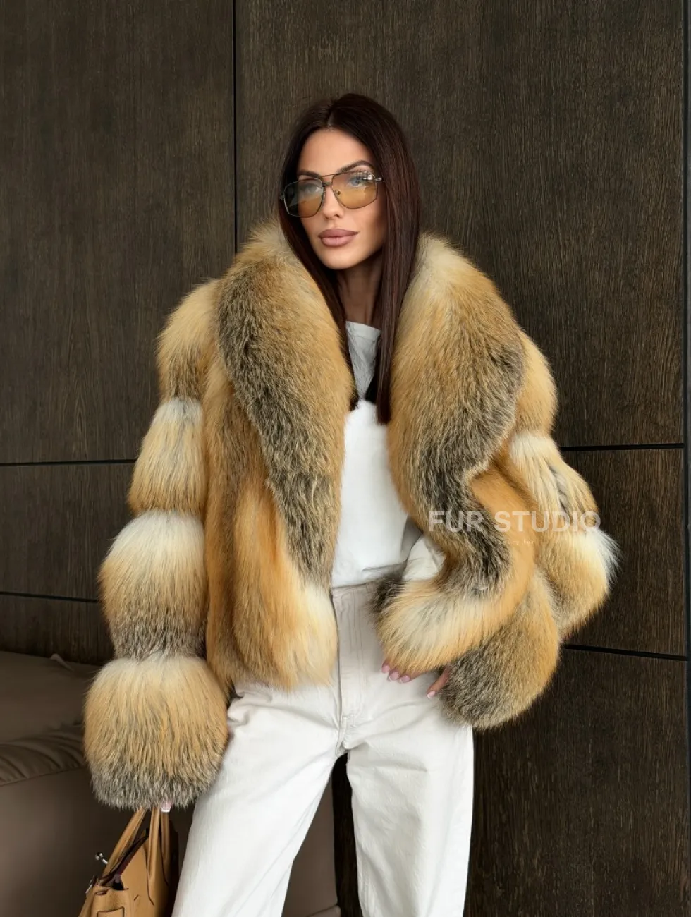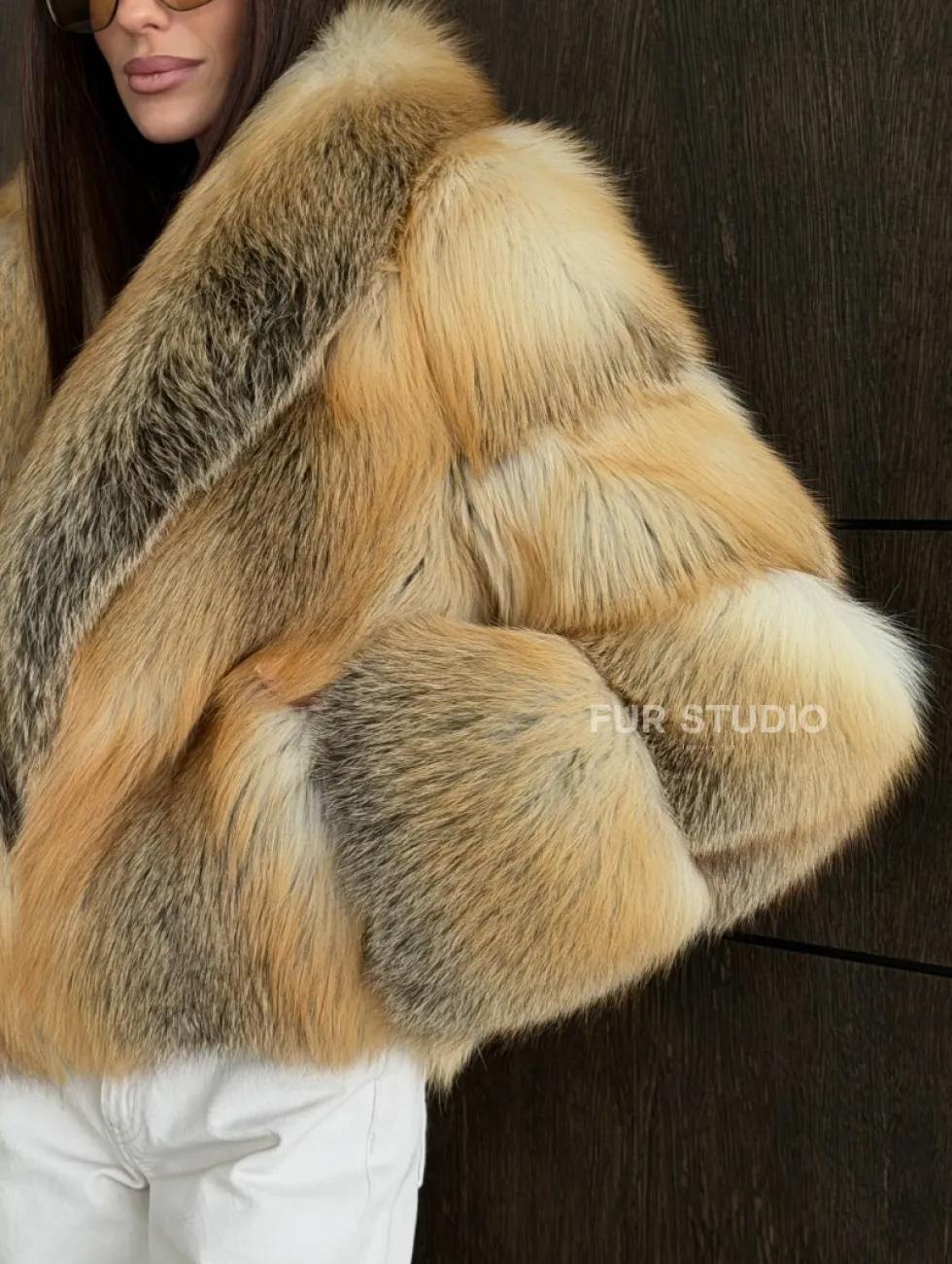 Мех данной шубы лиса, цвет рыжий. Предлагается в размерах от 42 до 46. Длина модели 50-55 см, что выгодно подчеркивает фигуру девушек. Эта модель идеально подойдет для девушек и женщин, предпочитающих роскошные натуральные меха.
