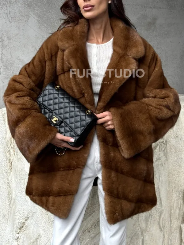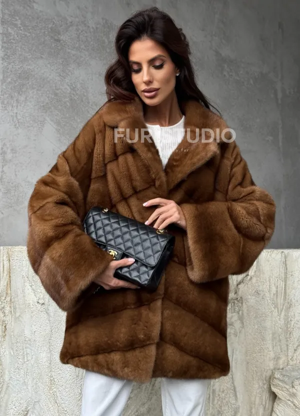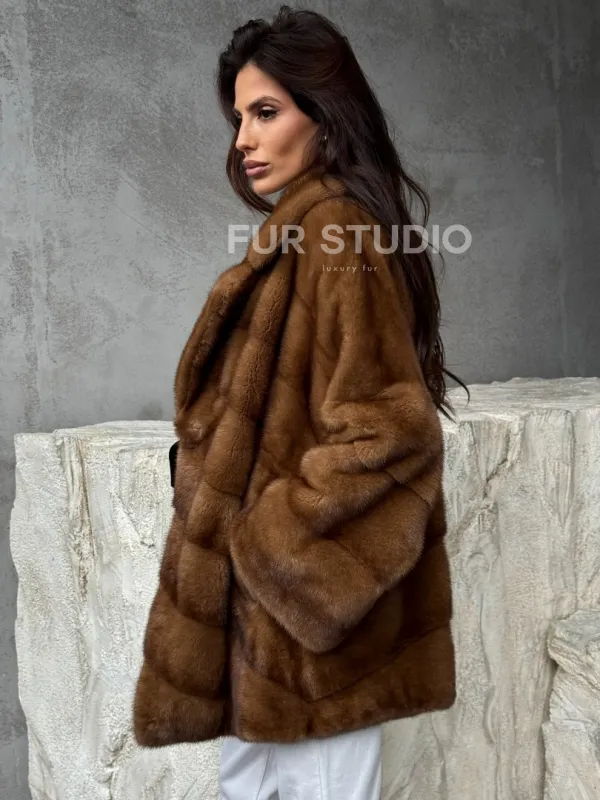 Мех данной шубы аукционная норка, цвет коричневый. Предлагается в размерах от 42 до 50. Длина модели 70-75 см, что выгодно подчеркивает фигуру девушек. Эта модель идеально подойдет для девушек и женщин, предпочитающих роскошные натуральные меха.