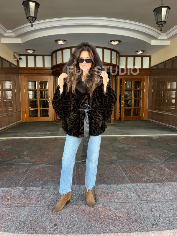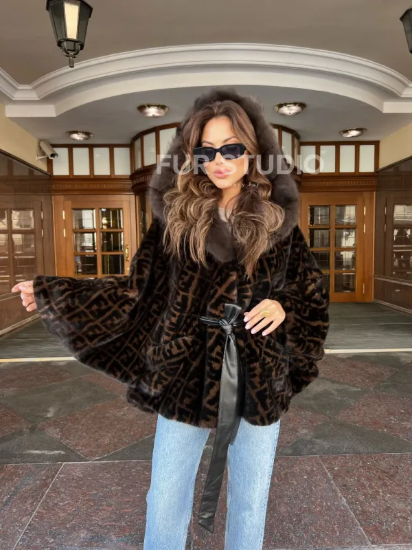 Пончо из скандинавской норки с принтом отличная альтернатива шубе. Мягкий мех норки позаботится о комфортной температуре тела в холодное время года. Необычный принт подчеркнет индивидуальность хозяйки. Качество меха гарантирует сохранность изделия в первозданном виде долгие годы. Оригинальный пояс очертит талию и создаст силуэт фигуры «песочные часы».