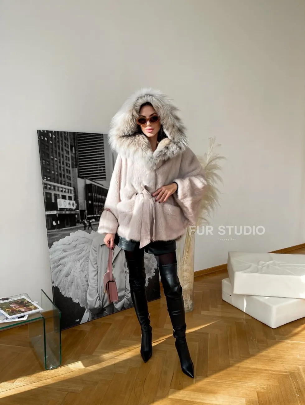 Шикарный капюшон из меха рыси позаботится о прическе и комфортной температуре головы. Удобные карманы не дадут ручкам замерзнуть. Качество изделия гарантирует, что владелица будет носить пончо долгие годы. Брендовая сумочка подчеркнет индивидуальность хозяйки. Купить пончо норковое с капюшоном из меха рыси в цвете пастель могут девушки, которые любят выглядеть легко и женственно.