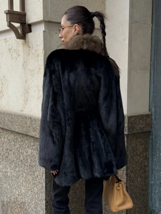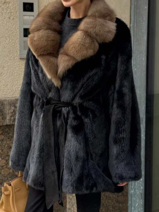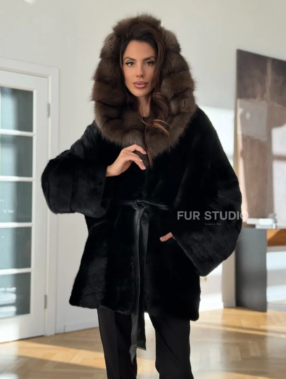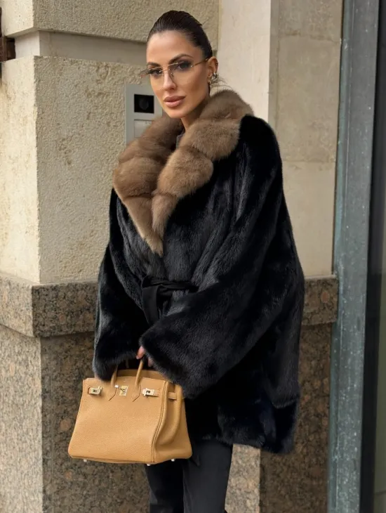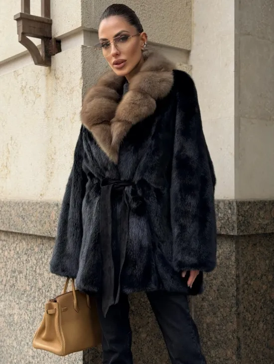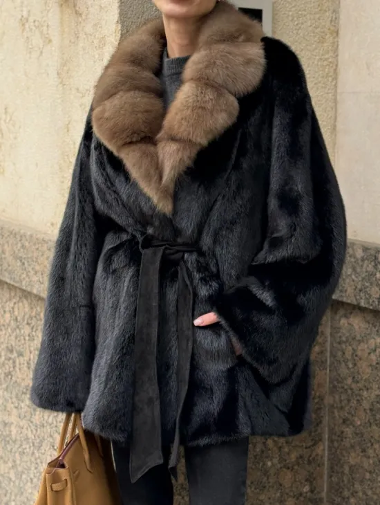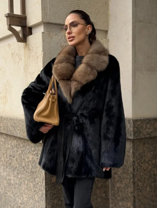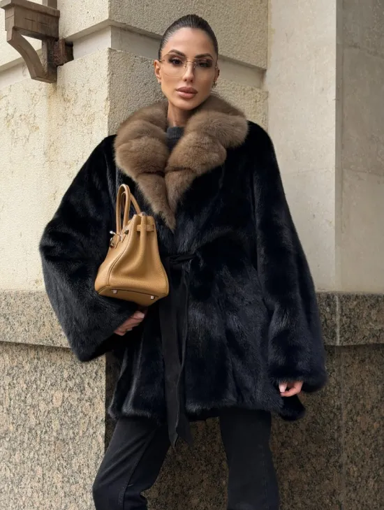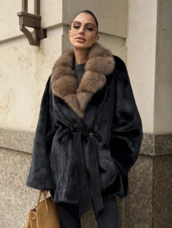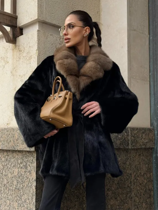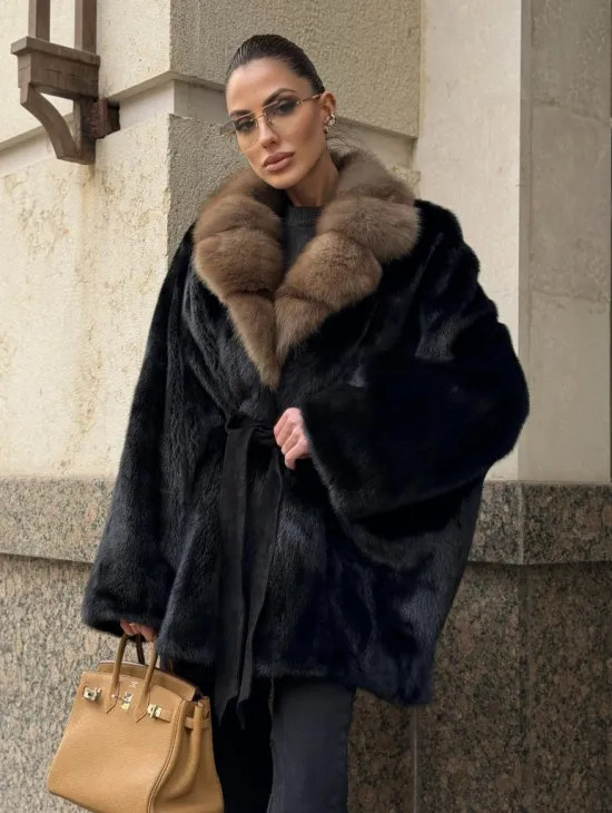 Широкие манжеты подчеркнут изящество кистей, а глубокие карманы согреют в непогоду. Оригинальный пояс выделяет талию и создает силуэт “песочных часов”. Модель сочетается с классической одеждой, подойдет под вечерний наряд. Купить пончо-шубу из плюшевой норки с капюшоном из меха куницы могут женщины, которые любят выглядеть роскошно вне зависимости от времени года.