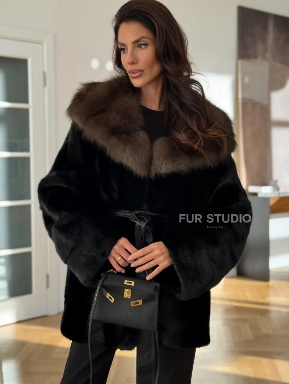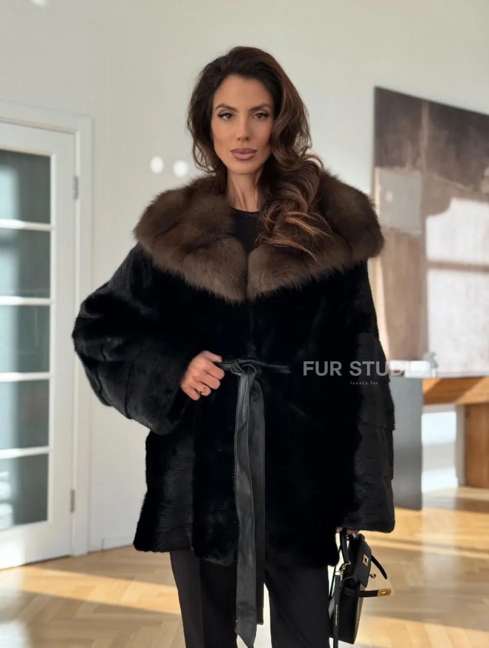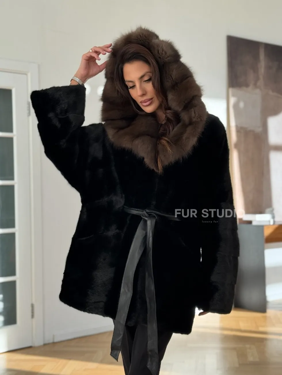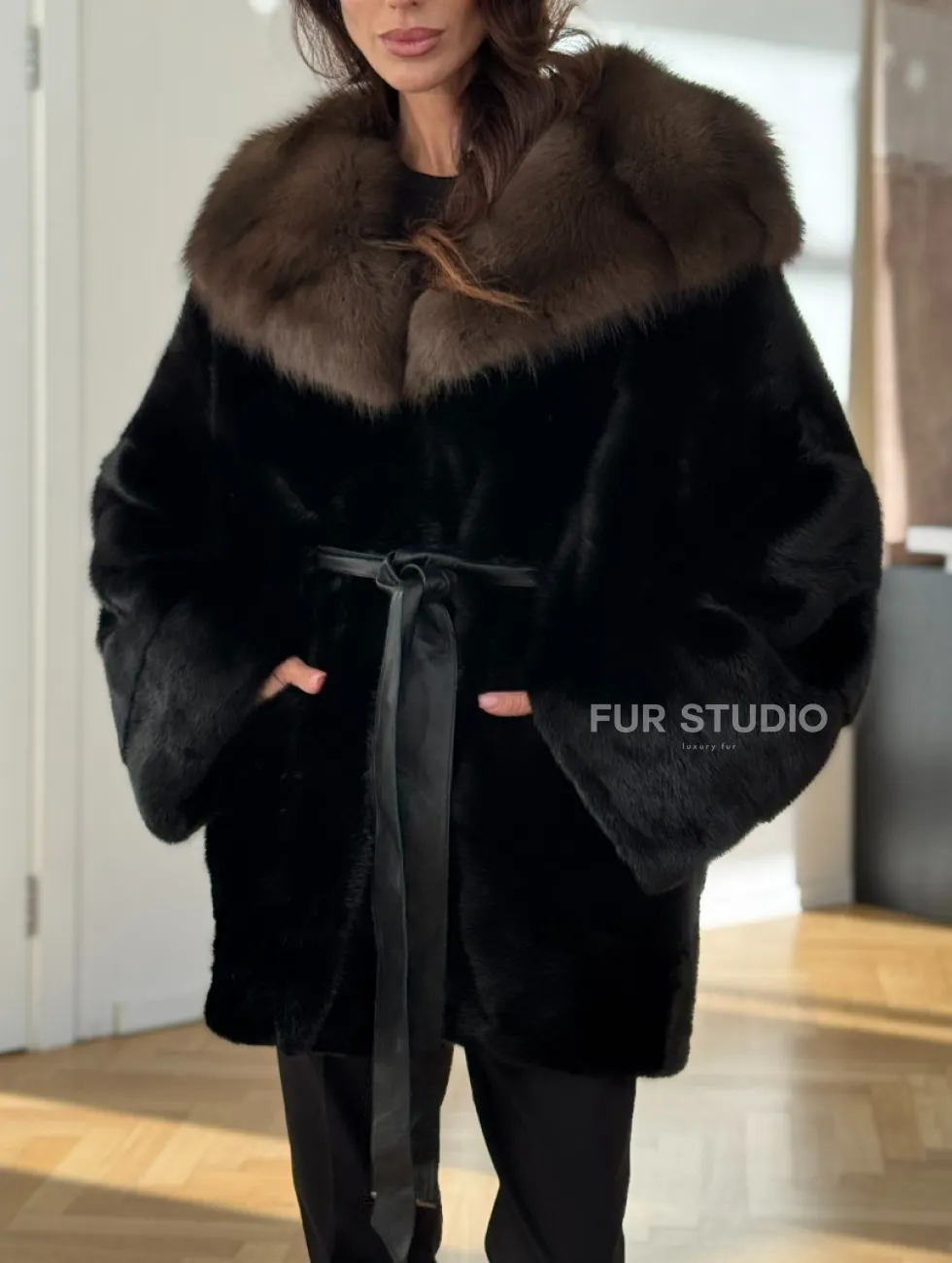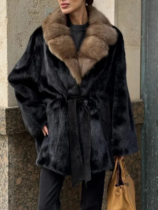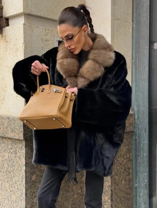 Широкие манжеты подчеркнут изящество кистей, а глубокие карманы согреют в непогоду. Оригинальный пояс выделяет талию и создает силуэт “песочных часов”. Модель сочетается с классической одеждой, подойдет под вечерний наряд. Купить пончо-шубу из плюшевой норки с капюшоном из меха куницы могут женщины, которые любят выглядеть роскошно вне зависимости от времени года.