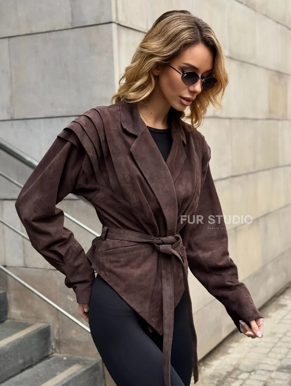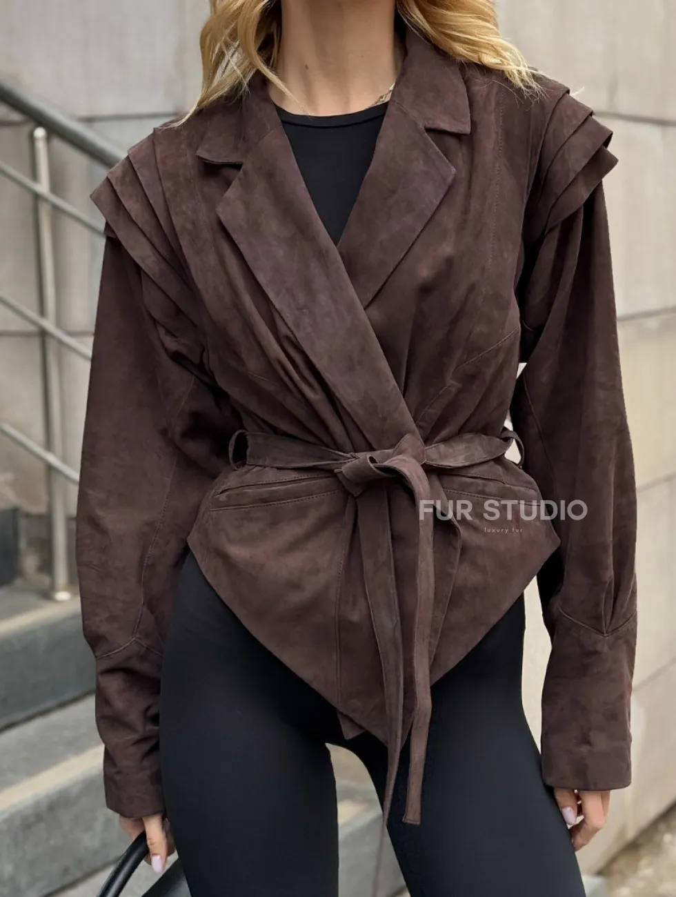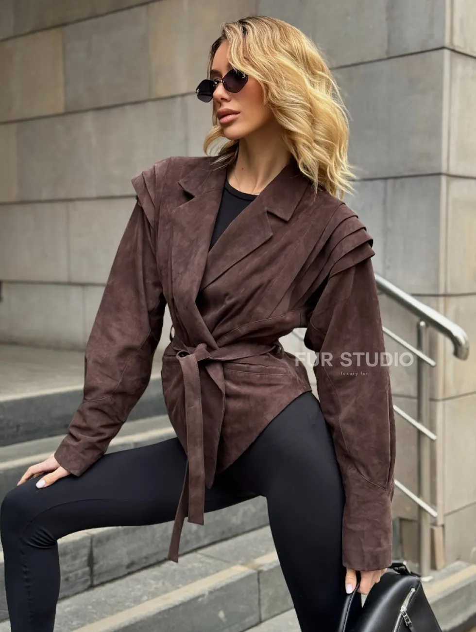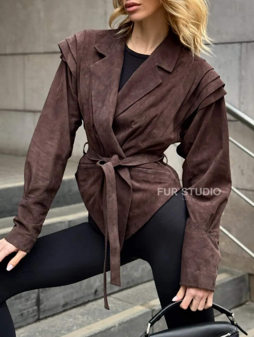 Восхититесь элегантностью и несравненным комфортом с нашей эксклюзивной коллекцией кожаных изделий. Изготовленная из первоклассной натуральной кожи, Приталенная куртка из замши c поясом, на плечах вставки в виде крылышек не только согреет вас в прохладные дни, но и подчеркнет ваш изысканный вкус. Уникальный дизайн и высокое качество делают наши представленные образцы идеальным выбором для утончённых образов.