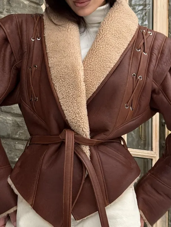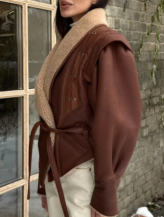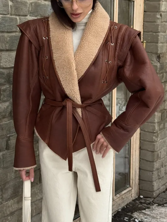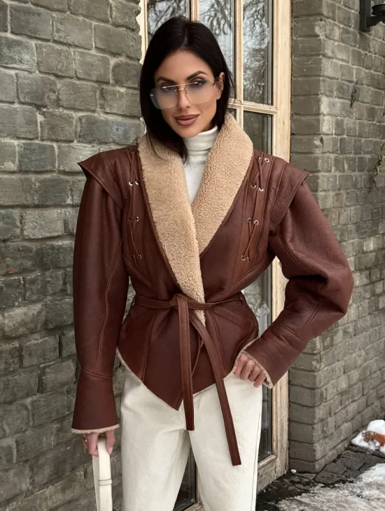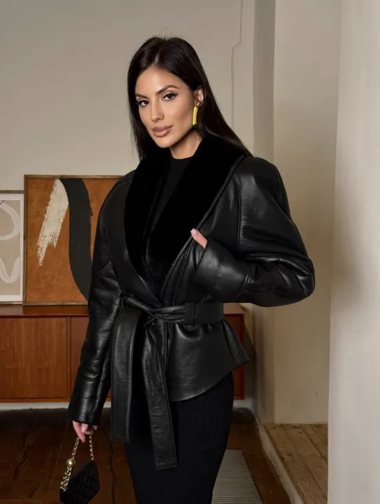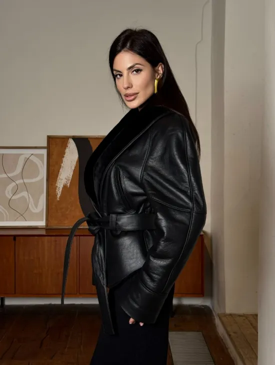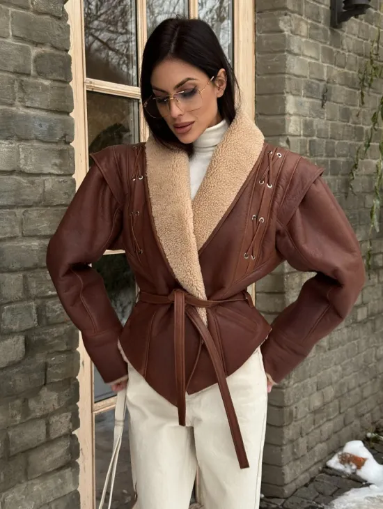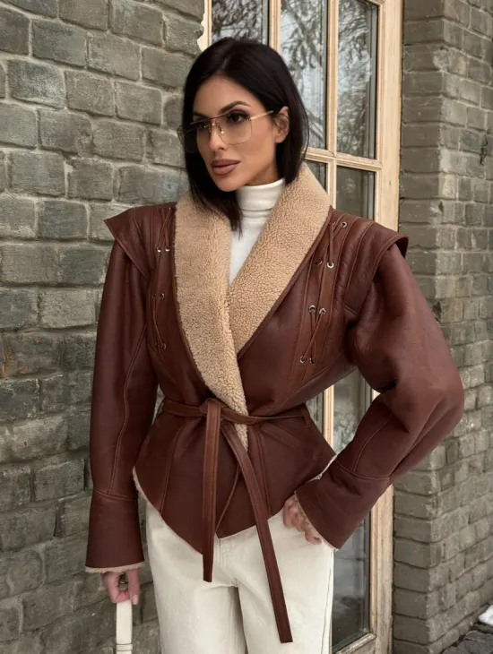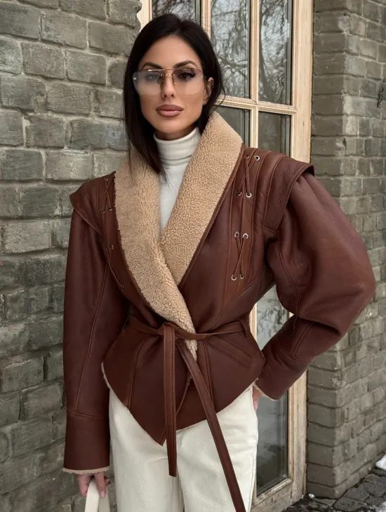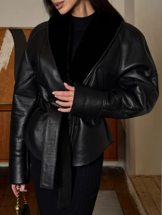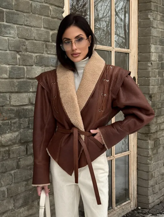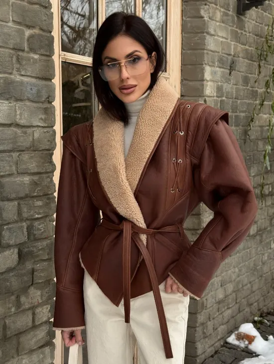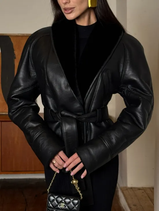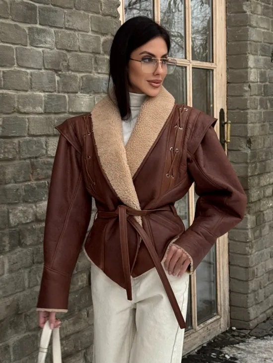 Зимняя женская короткая куртка на запах с поясом из натуральной овчины