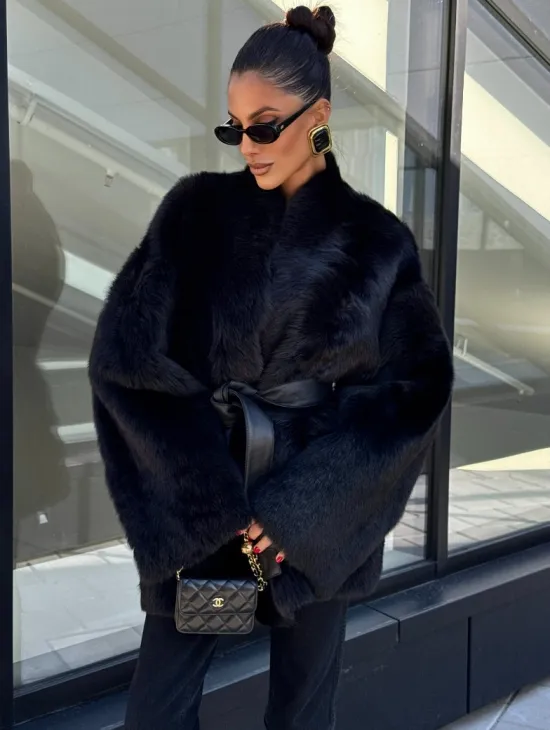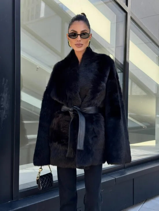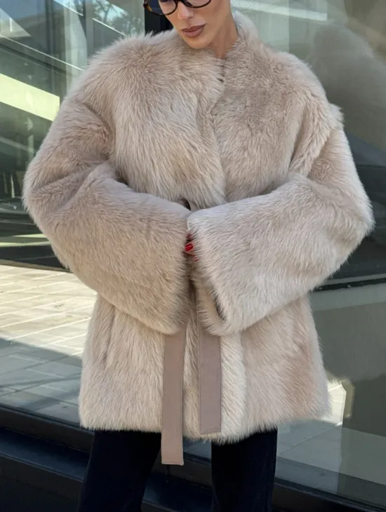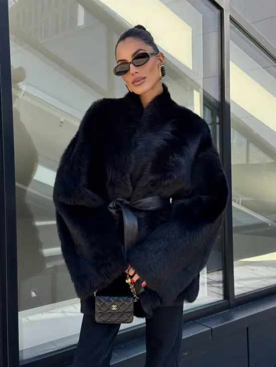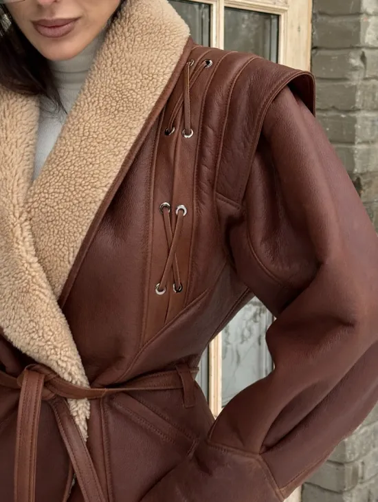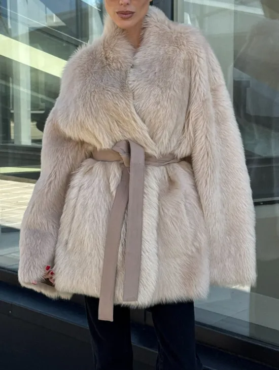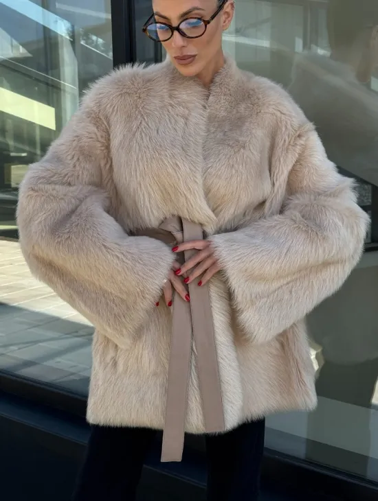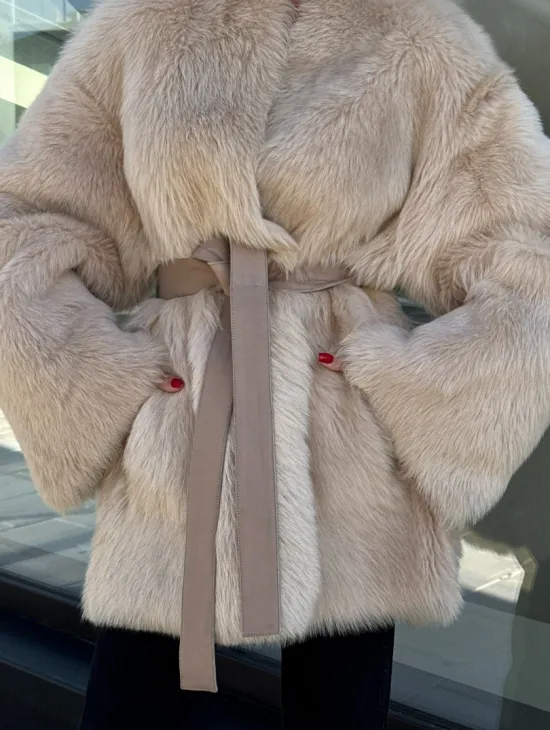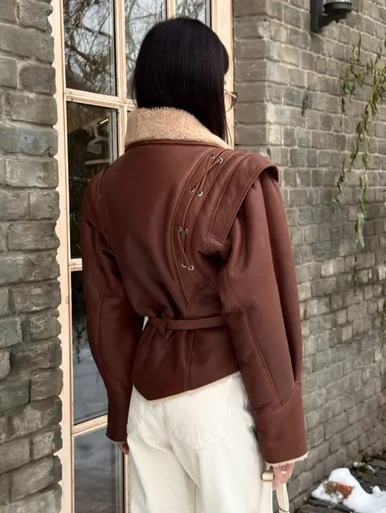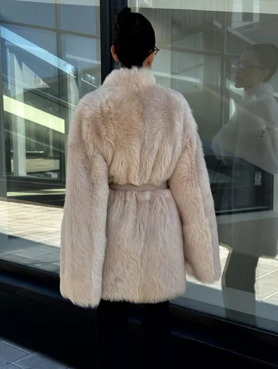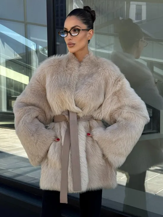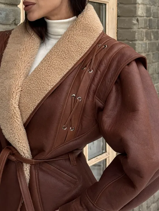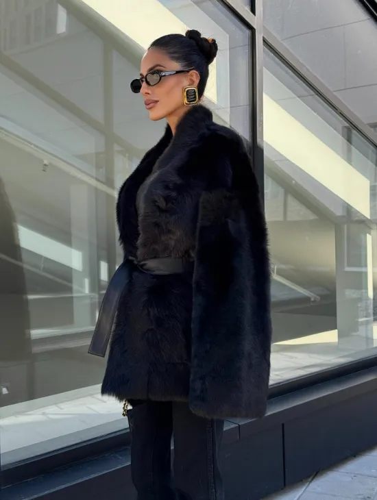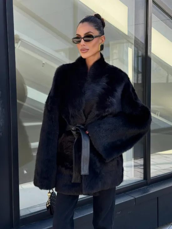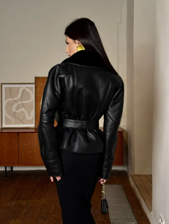 Зимняя женская короткая куртка на запах с поясом из натуральной овчины