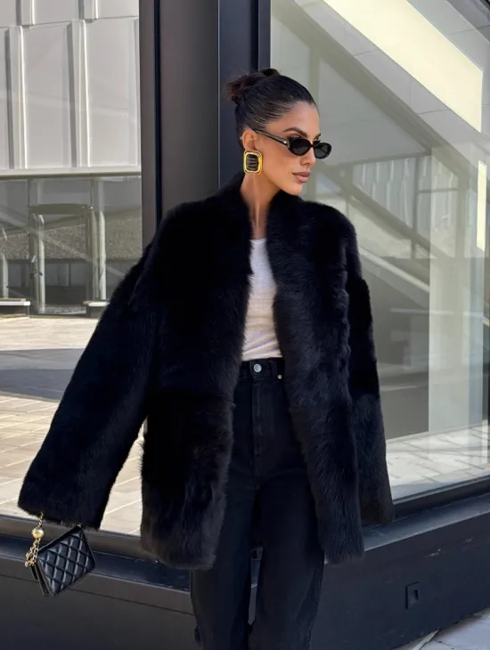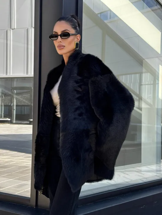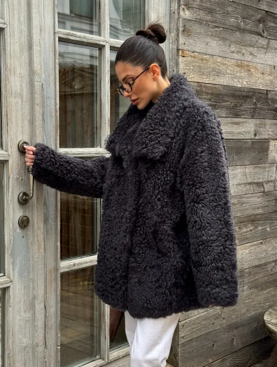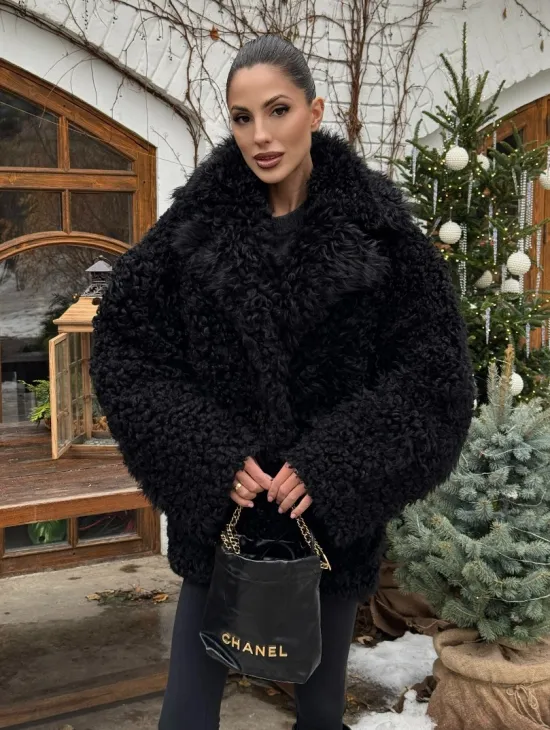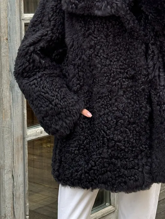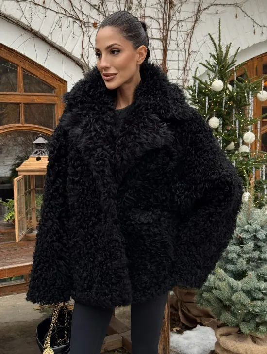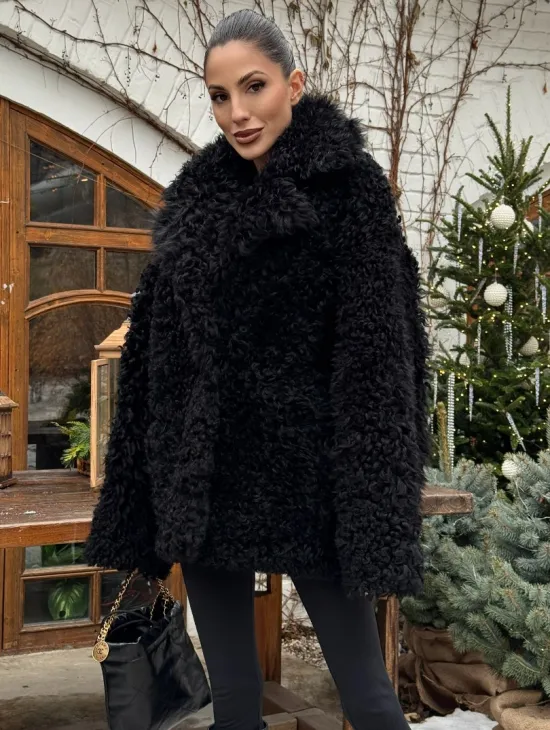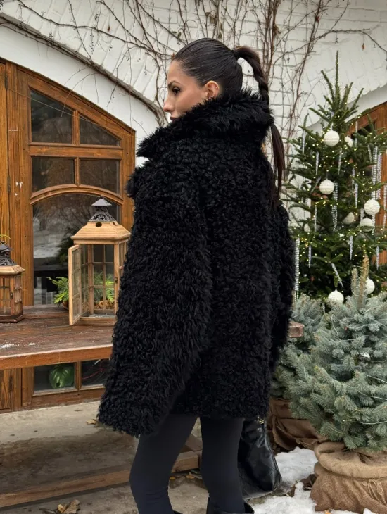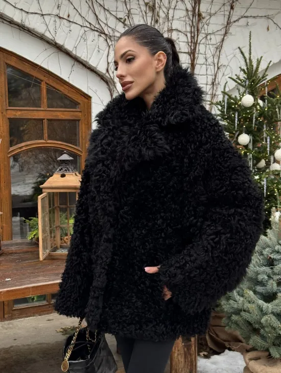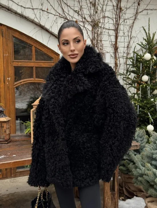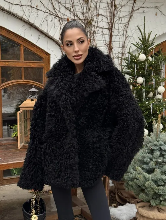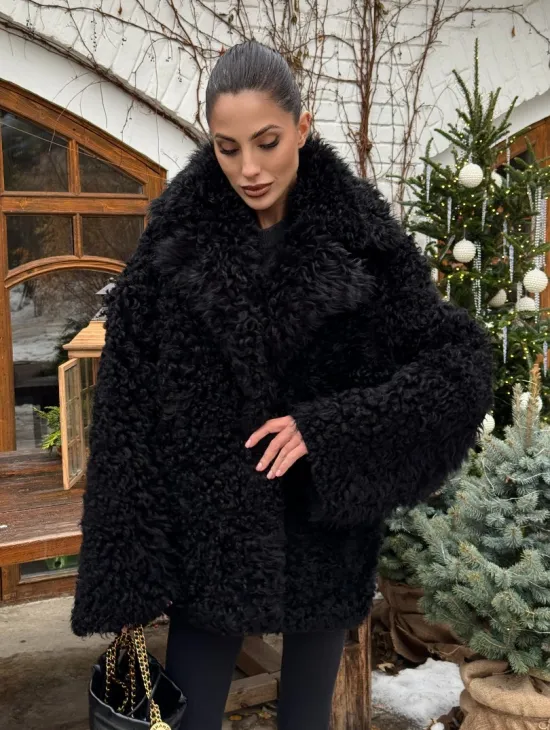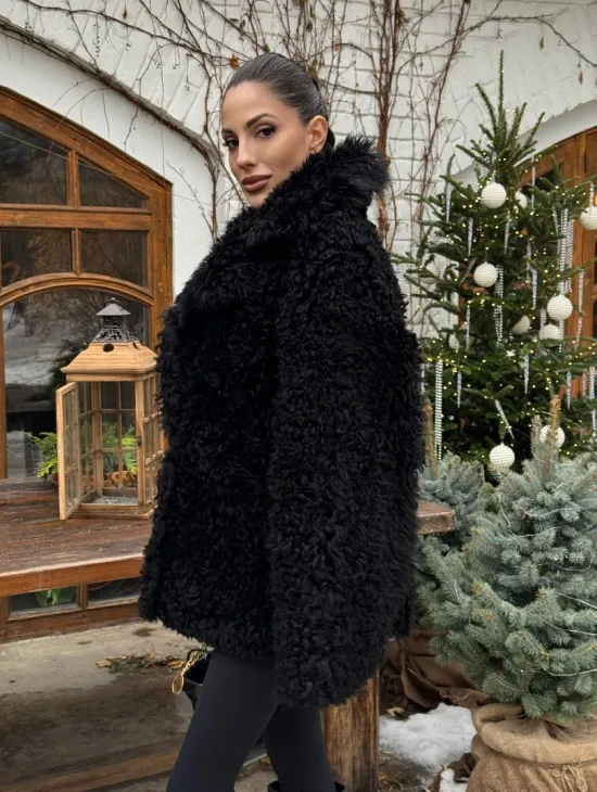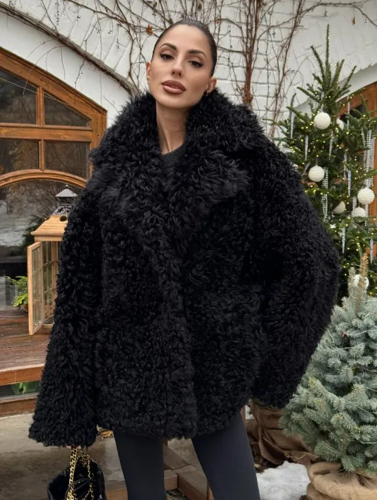 Черная короткая шуба - дубленка из испанской овчины «Тиградо»