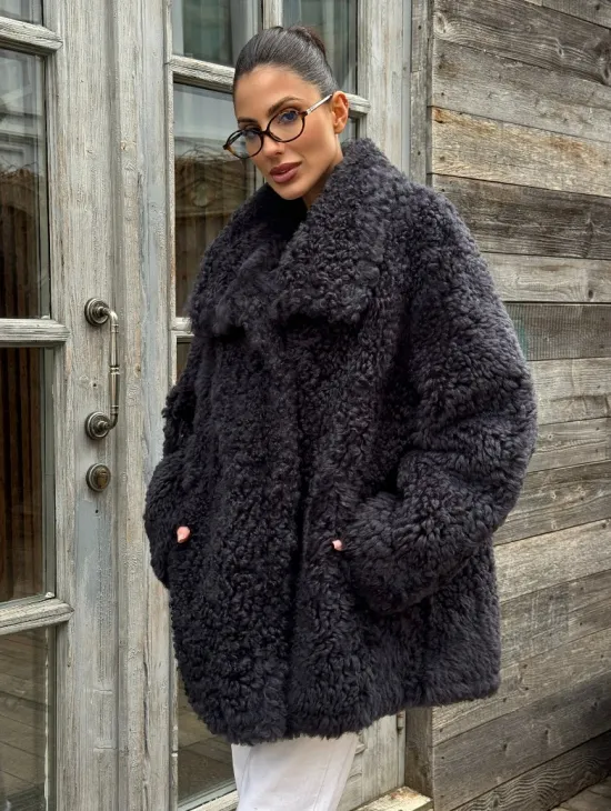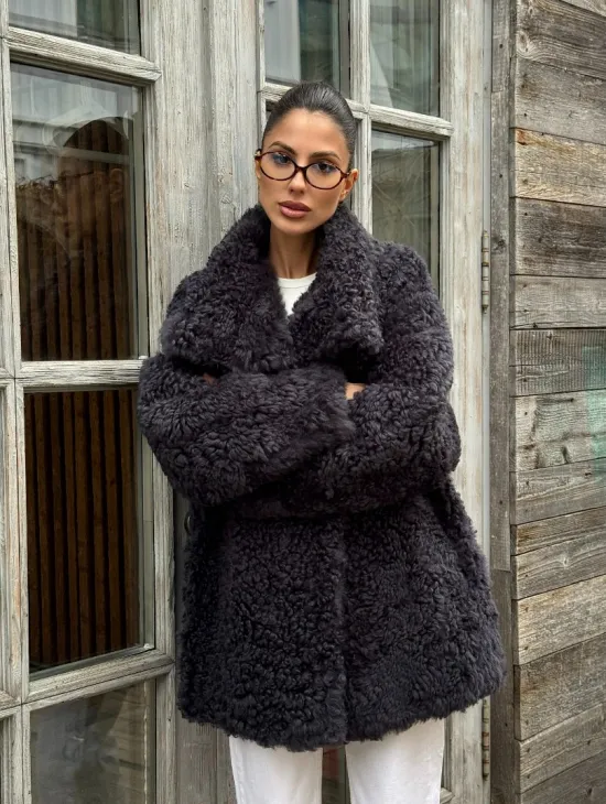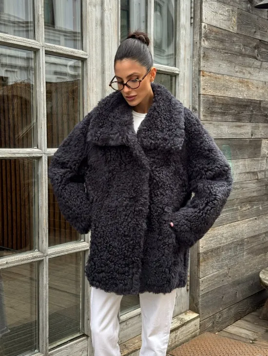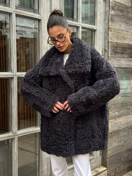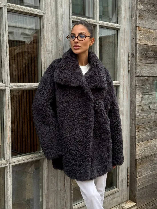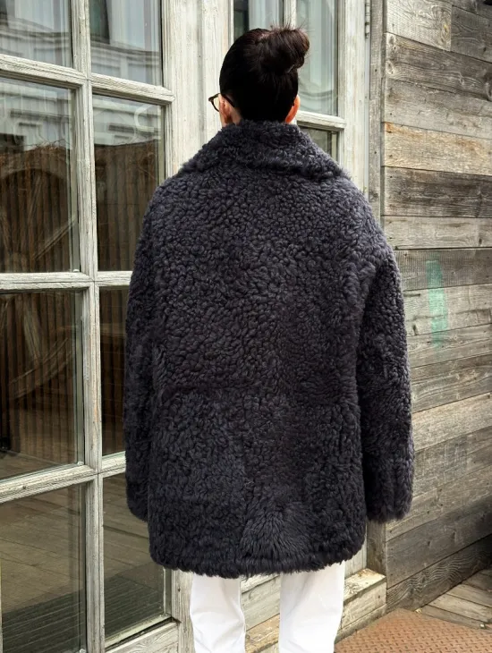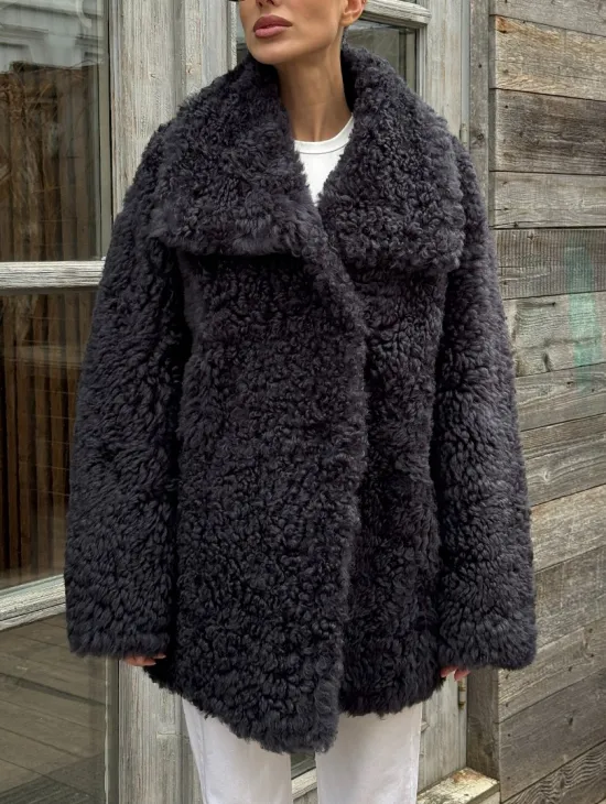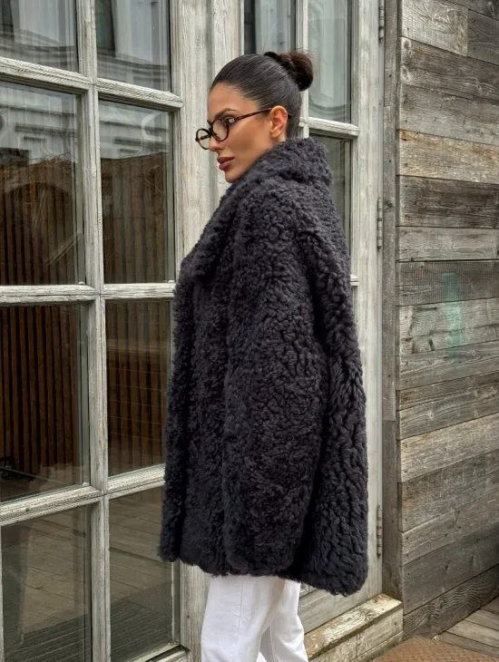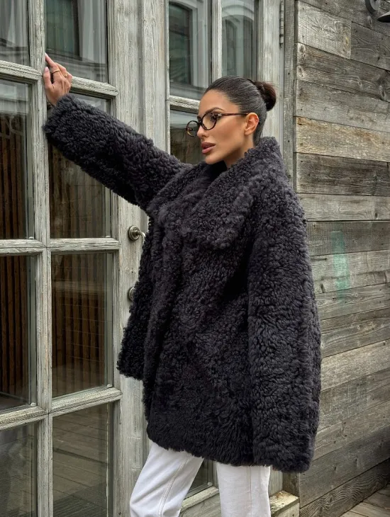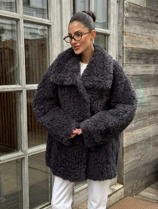 Стильный полушубок из натурального меха тиградо с большим отложным воротником - цвет графит
