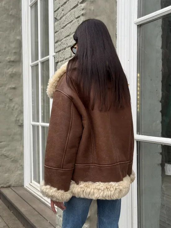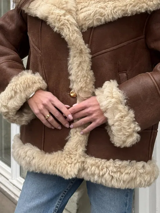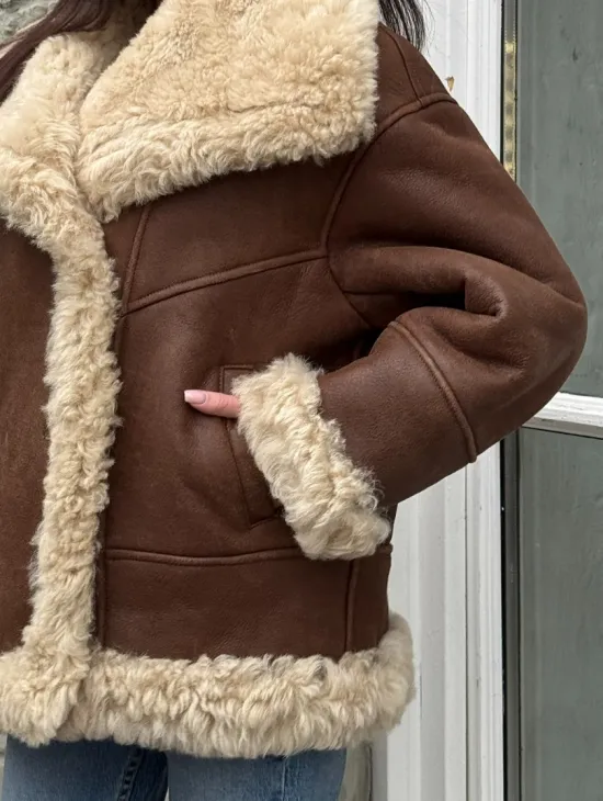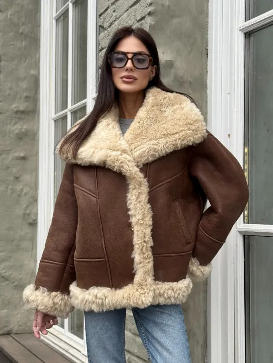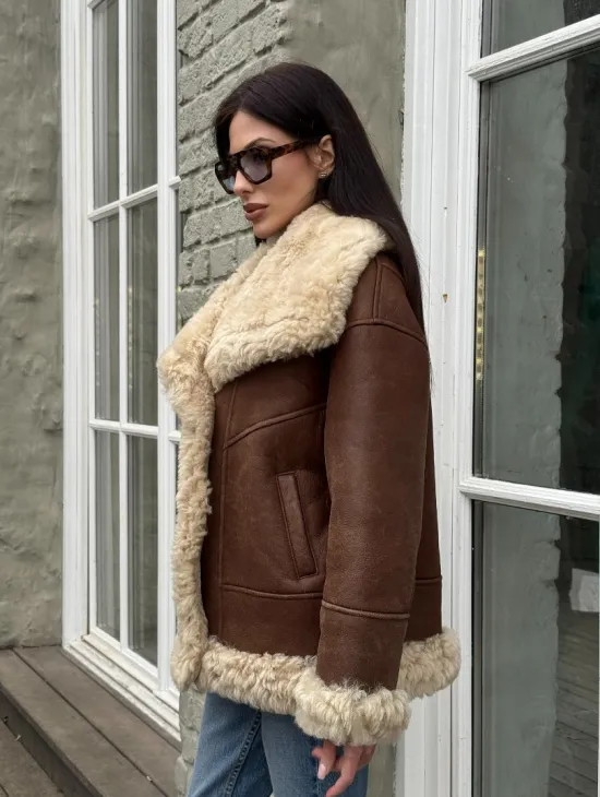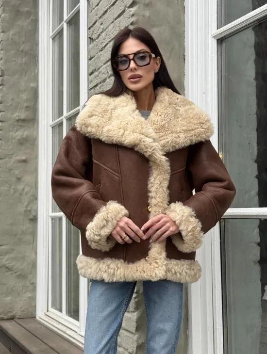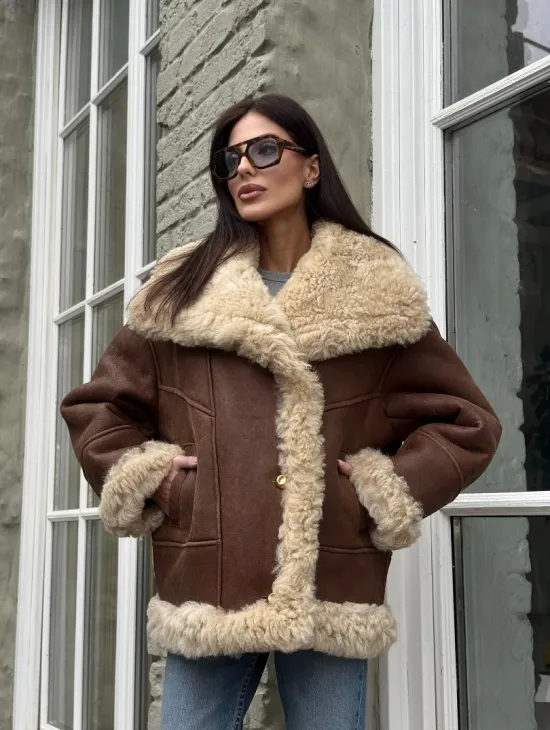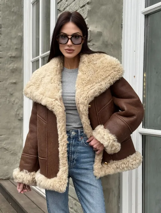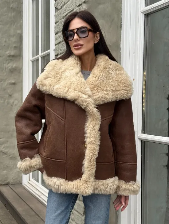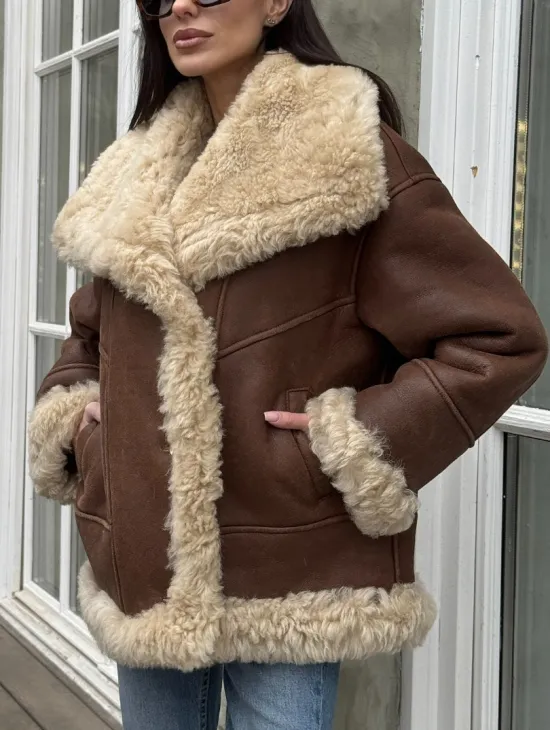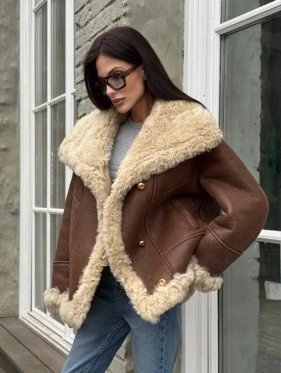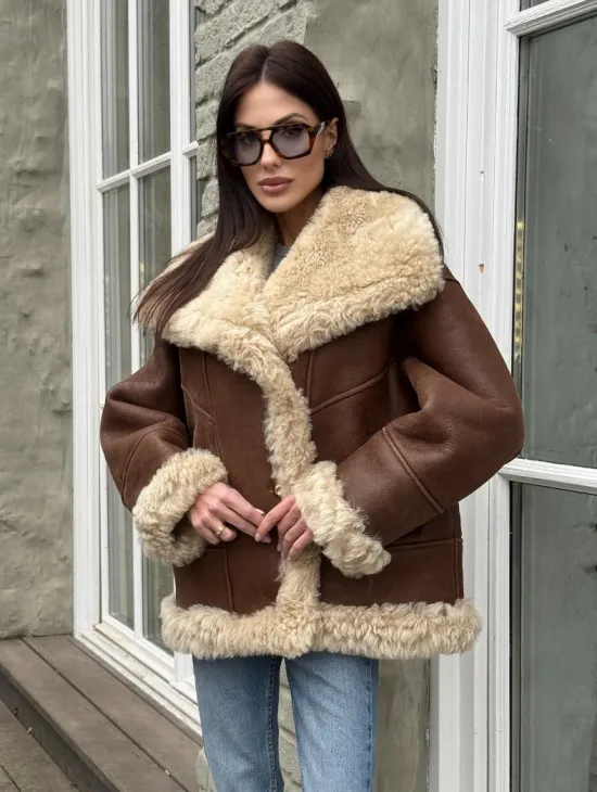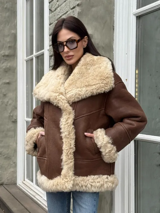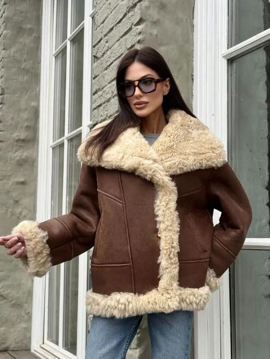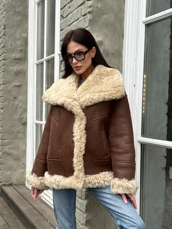 Коричневая женская дубленка с воротником «Челси» из овчины тиградо