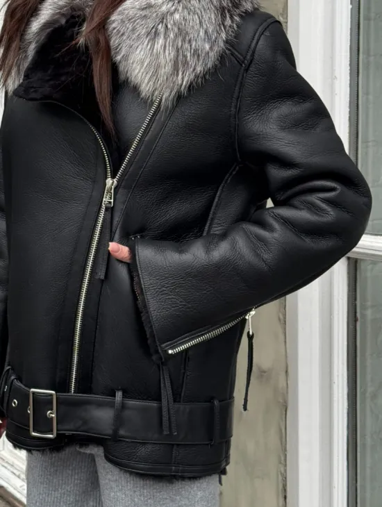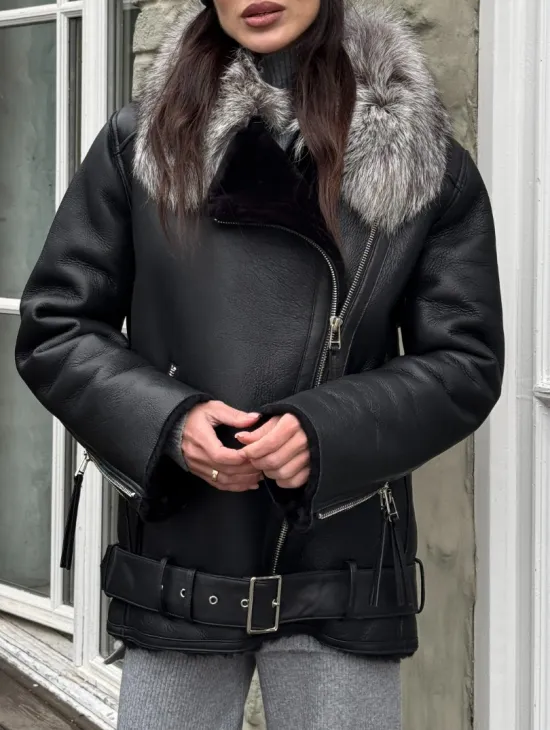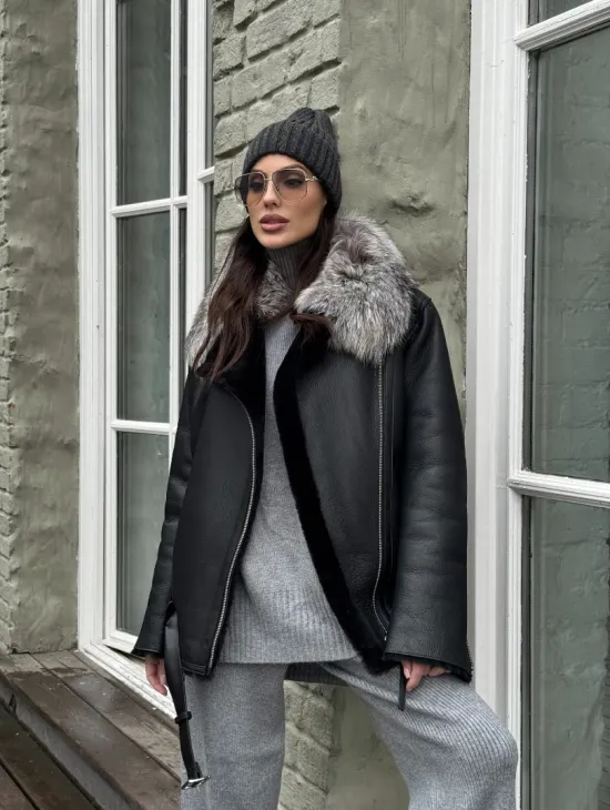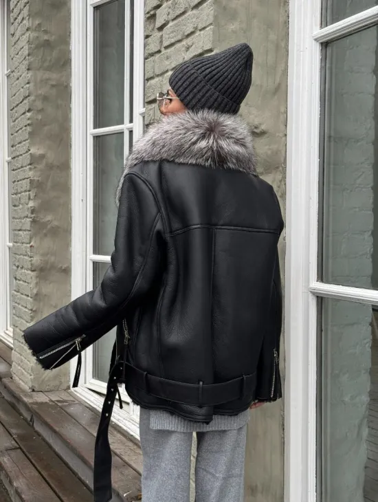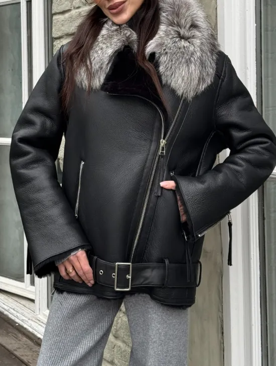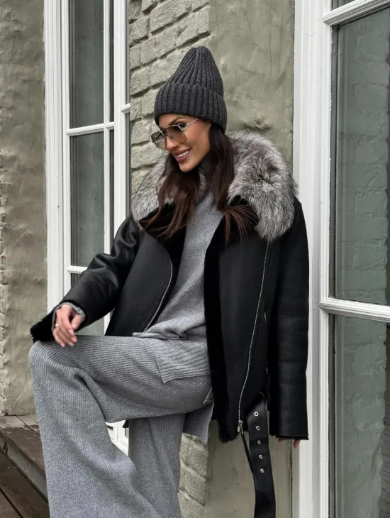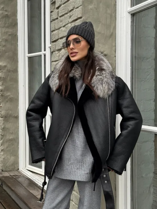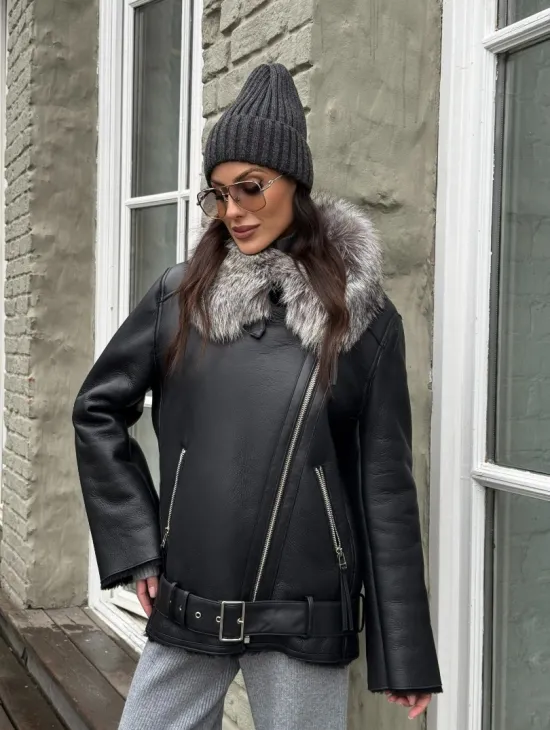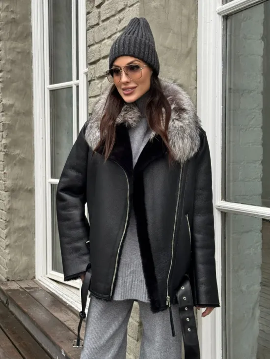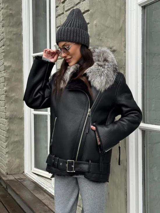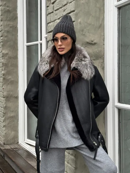 Дубленка из натуральной овчины с воротником чернобурой лисы