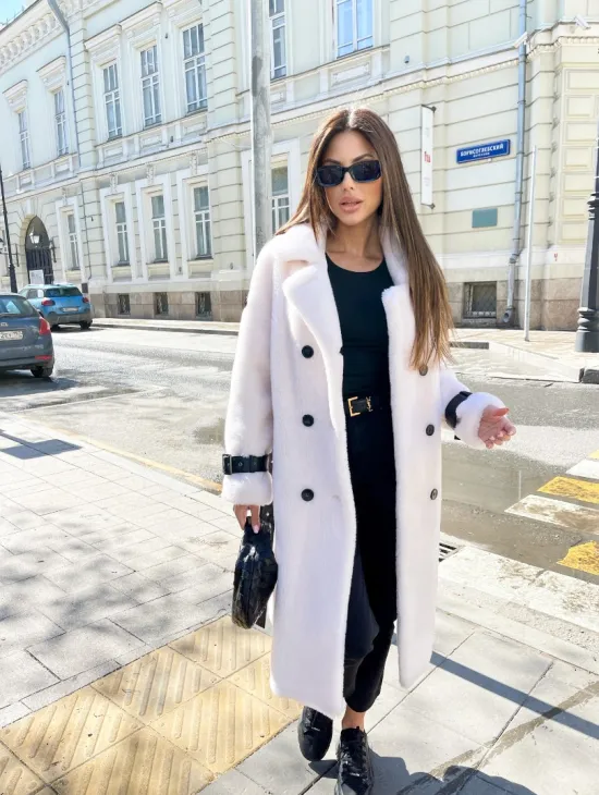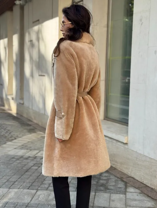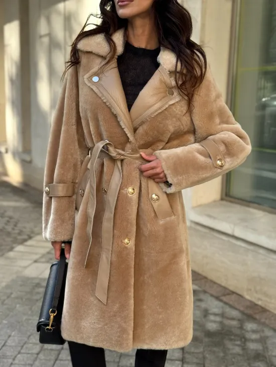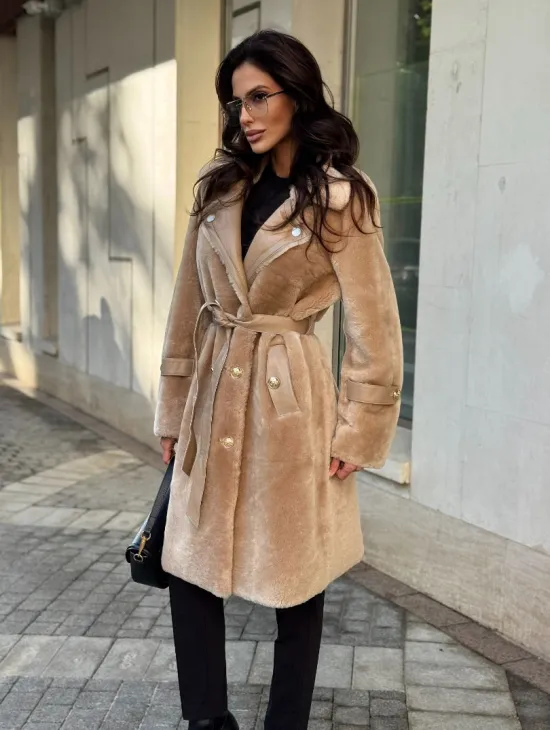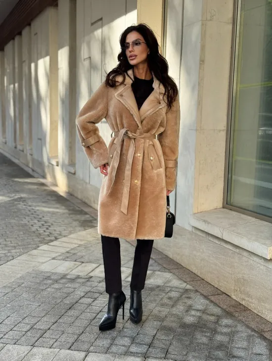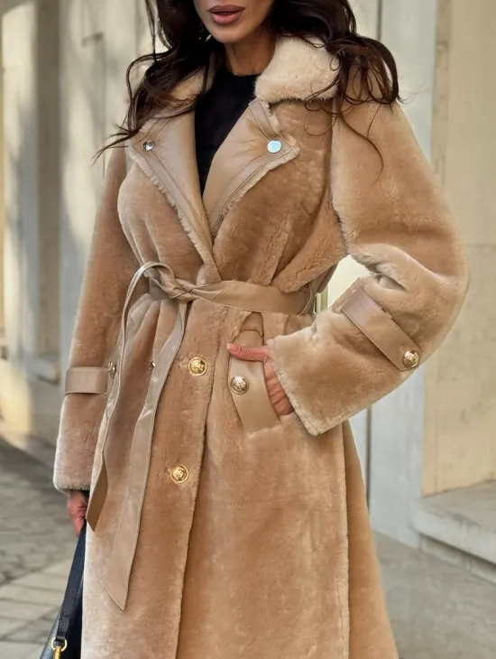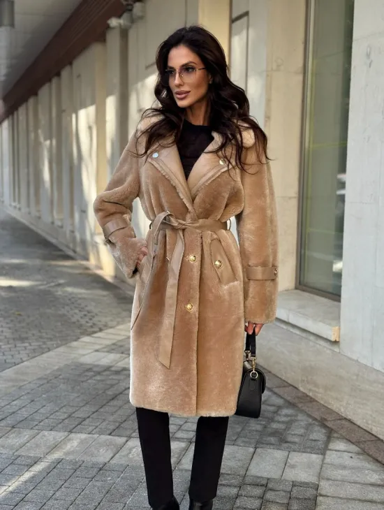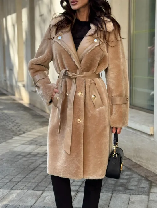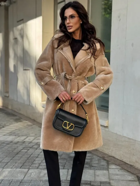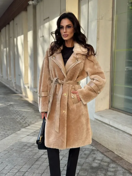 Дубленка из овчины с норковым воротником - цвет бежевый