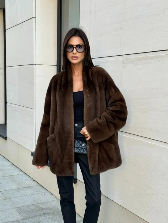 Норковый полушубок в натуральном цвете Brown с капюшоном из куницы