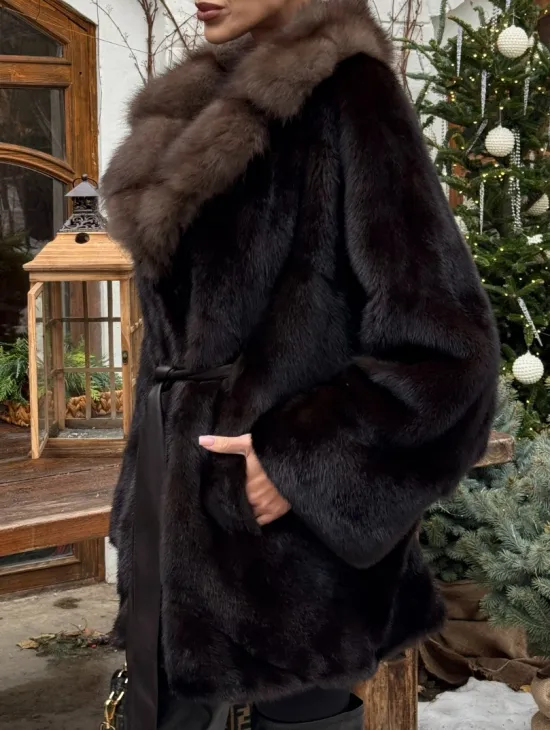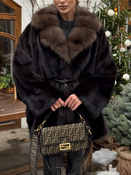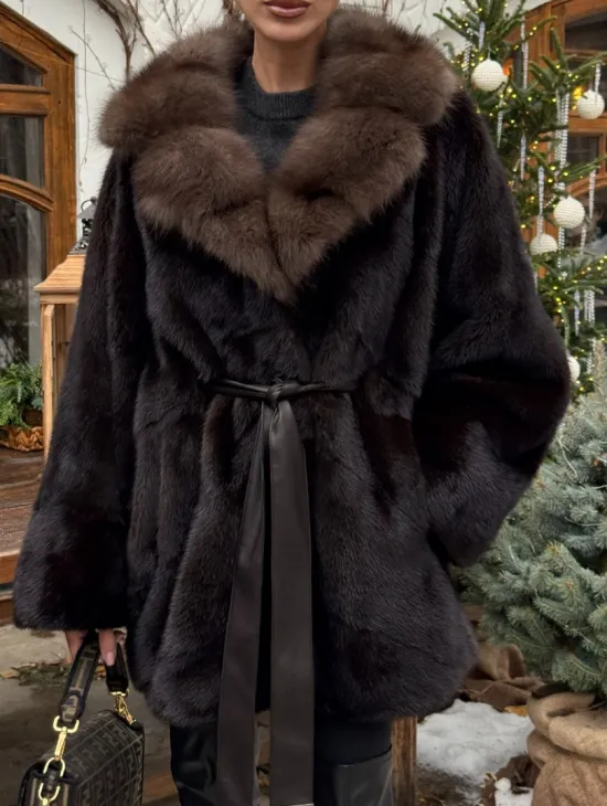 Норковый полушубок Mahogany с воротником из меха куницы - Летучая мышь